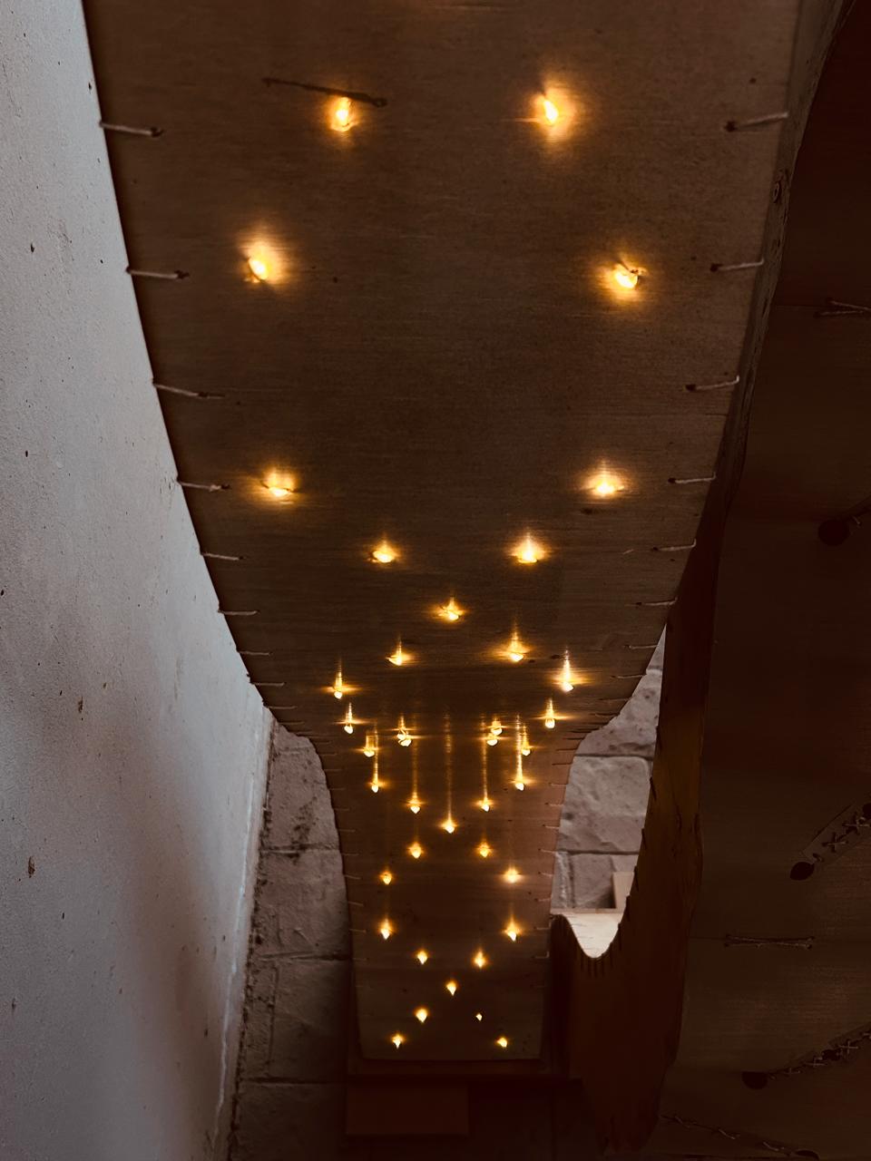 El proyecto cumple una doble función: iluminar y generar un estímulo sonoro suave, aportando a la relajación mental y creativa. La integración de puntos de luz en disposición ondulada guía el recorrido visual y mejora la percepción nocturna del espacio. El objeto sonoro, fabricado en madera, introduce un elemento acústico controlado que favorece momentos de pausa y contemplación. La forma curva y ergonómica facilita la interacción y la apropiación del usuario, fortaleciendo la función de descanso en el entorno urbano.