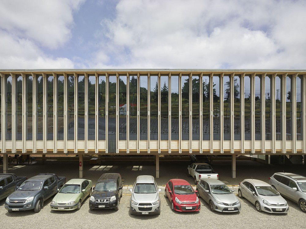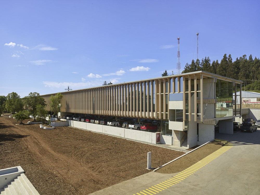 La plataforma de estacionamientos tiene una planta de óptimo rendimiento, con dos bandas dobles de 203 m de largo y 16 m de ancho cada una, extendida a lo largo de la cota de nivel en sentido norte-sur, con una de éstas bandas abierta y arborizada y la otra techada debajo del edificio principal. Esa explanada prolonga su anchura en toda la longitud frente al edificio principal de madera en el techo-jardín sobre la losa de un edificio-zócalo de un piso contra el terreno, de hormigón armado. La explanada tiene un piso parejo de corteza de desecho forestal.