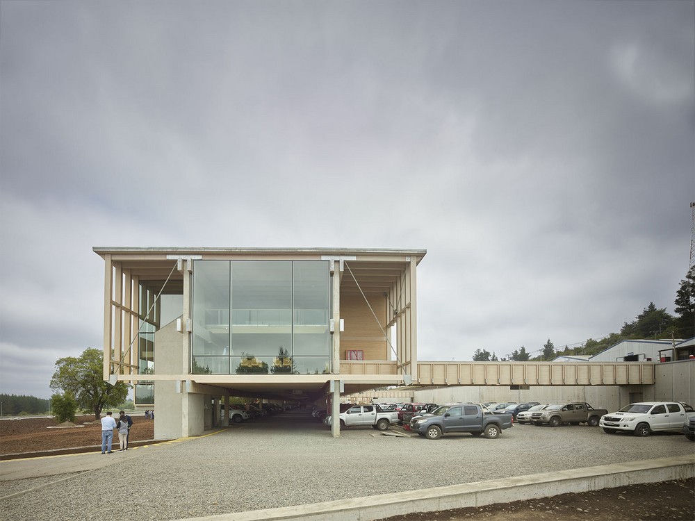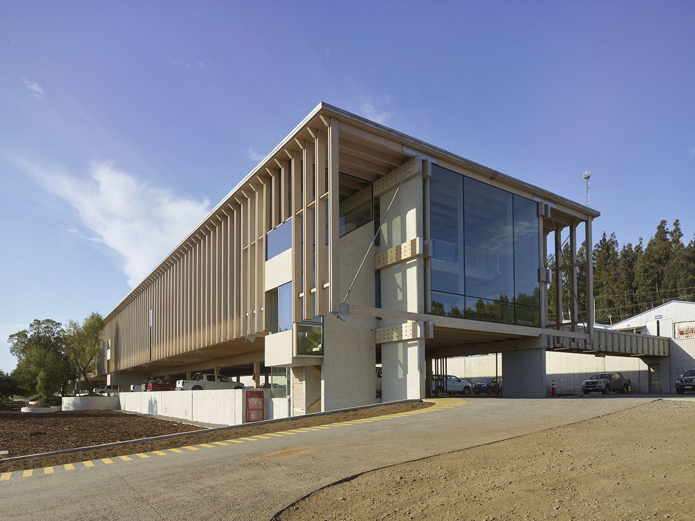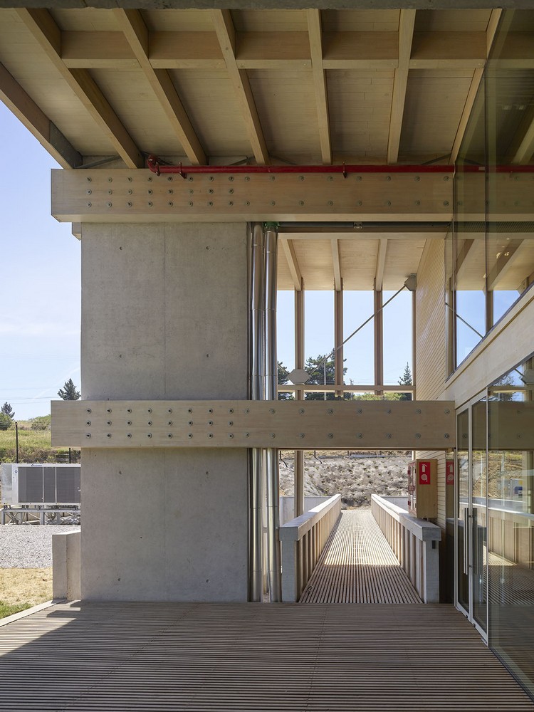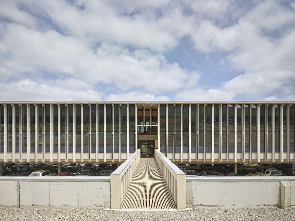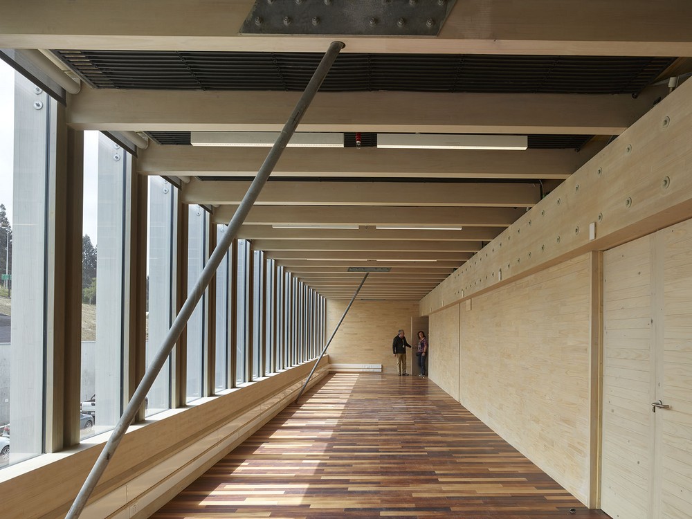 El edificio está compuesto por elementos repetitivos de fabricación industrial, conforme a una modulación sistemática, que permite ser replicada indefinidamente. Así, se ha conseguido un volumen edificado neto, claramente identificable a la distancia y al paso desde la autopista aún tras el velo de árboles, posado cuidadosamente en un suelo no muy firme que requiere pilotes de fundación, y aparece leve, como la madera de su hechura, suspendido horizontalmente sobre el ancho terreno en aparente desafío a la gravedad.