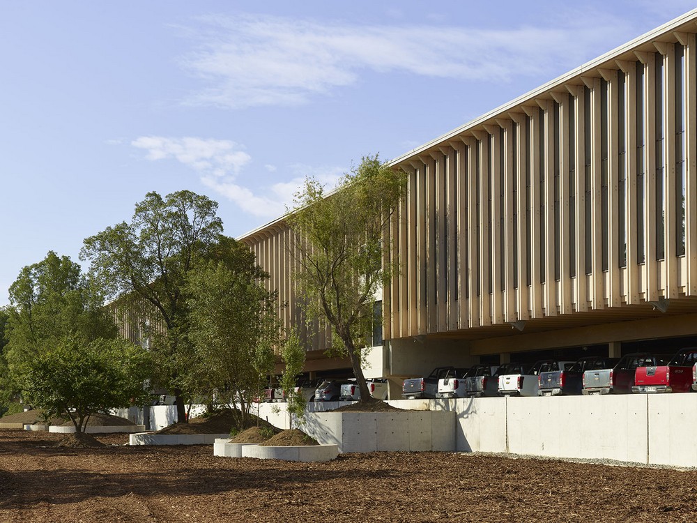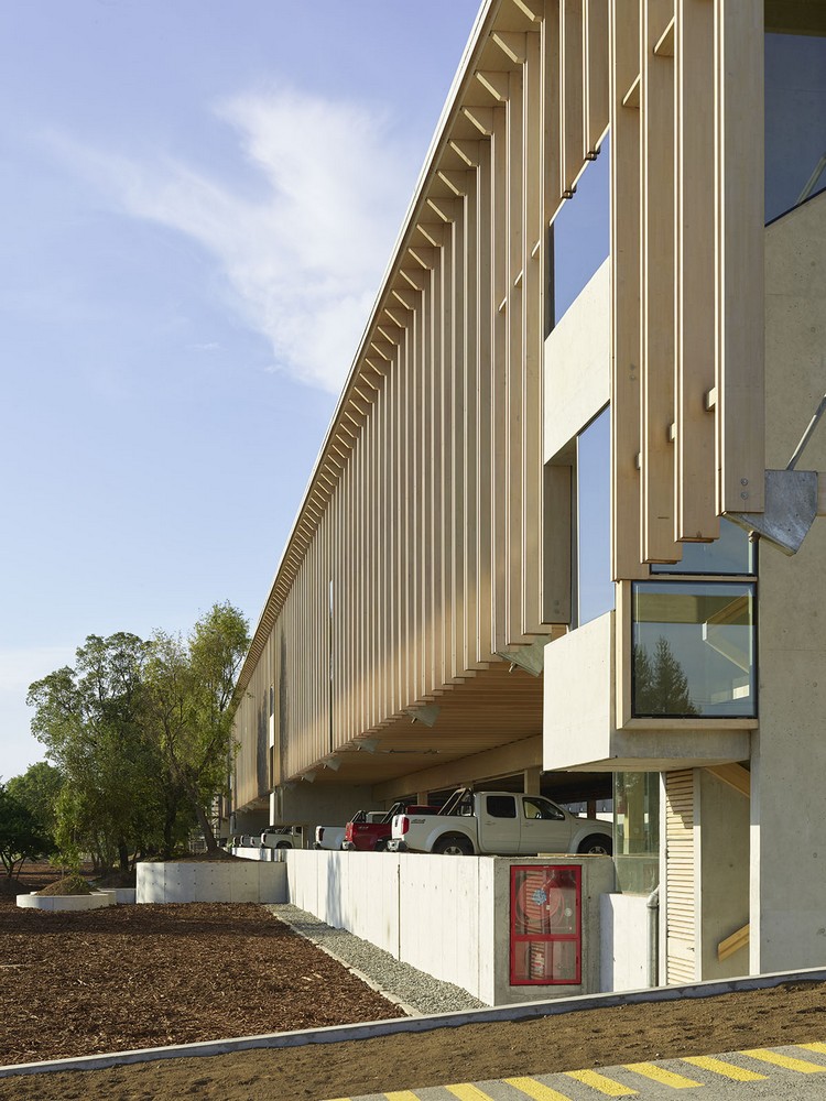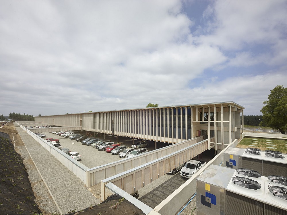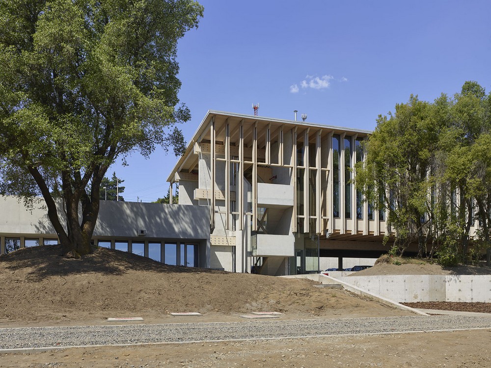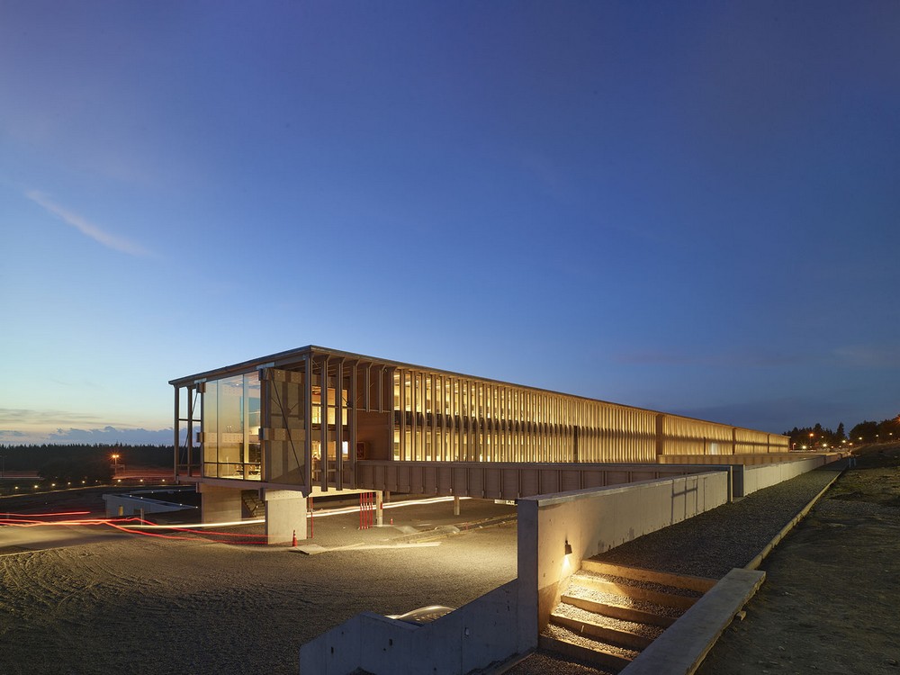 El edificio está compuesto por elementos repetitivos de fabricación industrial, conforme a una modulación sistemática, que permite ser replicada indefinidamente. Así, se ha conseguido un volumen edificado neto, claramente identificable a la distancia y al paso desde la autopista aún tras el velo de árboles, posado cuidadosamente en un suelo no muy firme que requiere pilotes de fundación, y aparece leve, como la madera de su hechura, suspendido horizontalmente sobre el ancho terreno en aparente desafío a la gravedad.