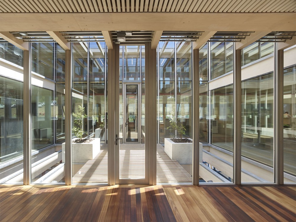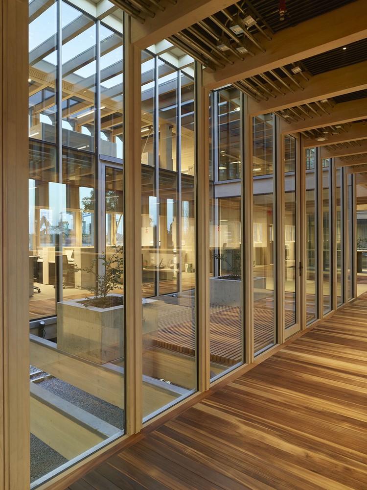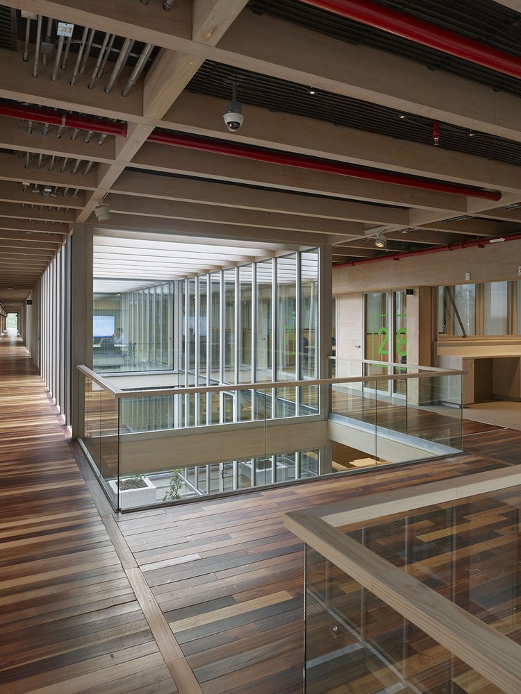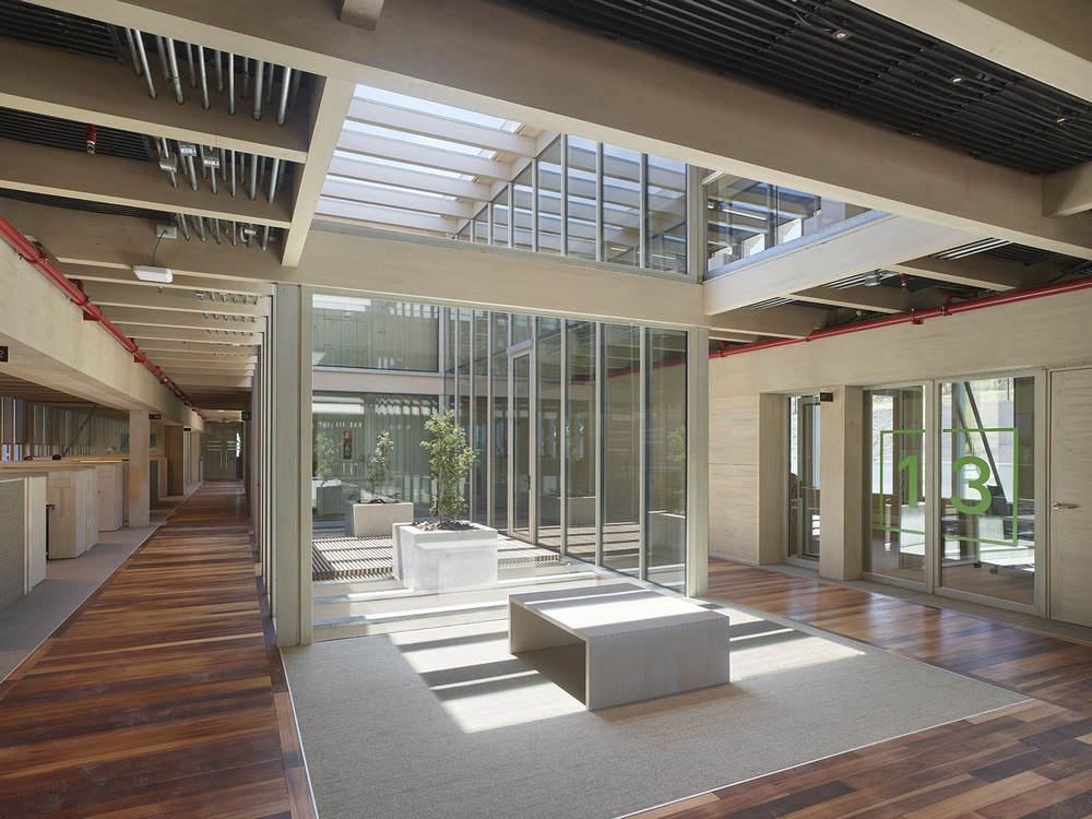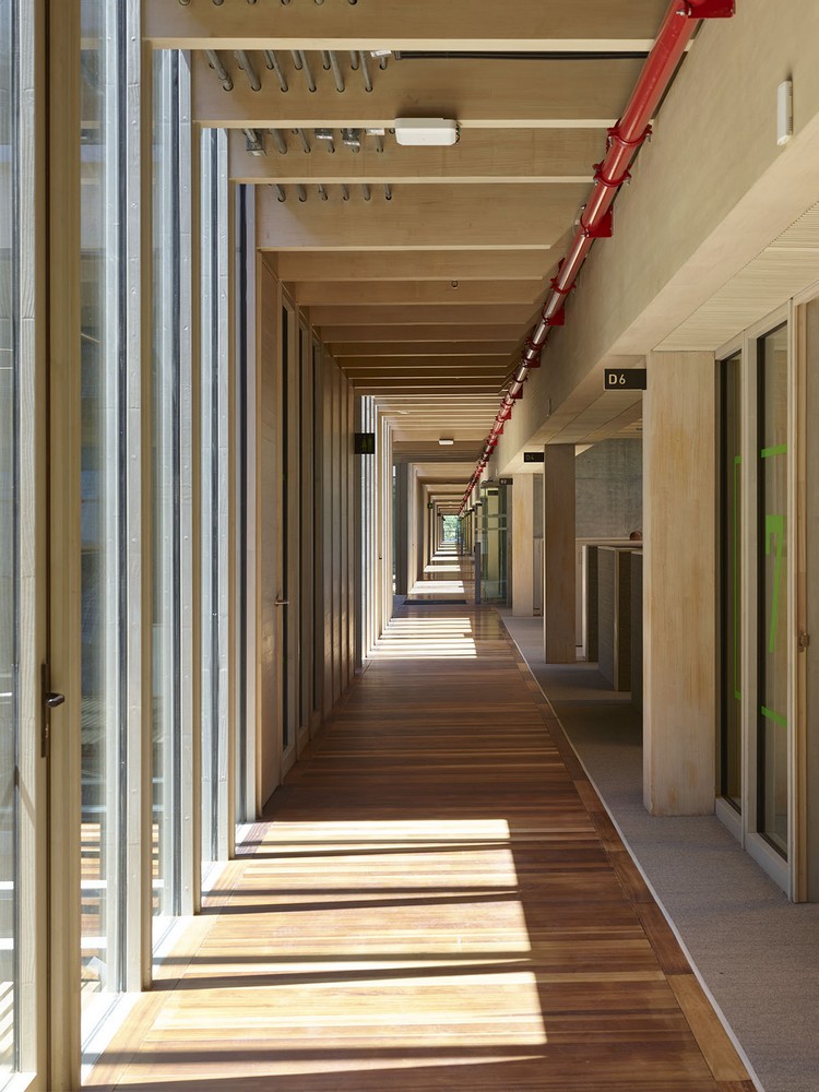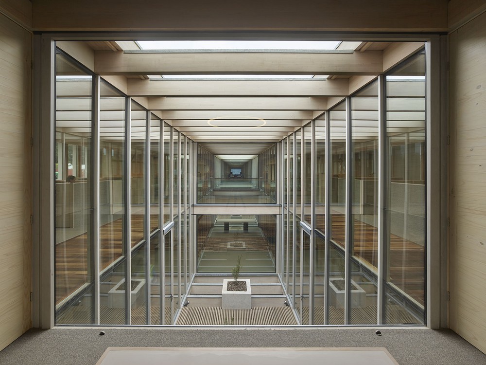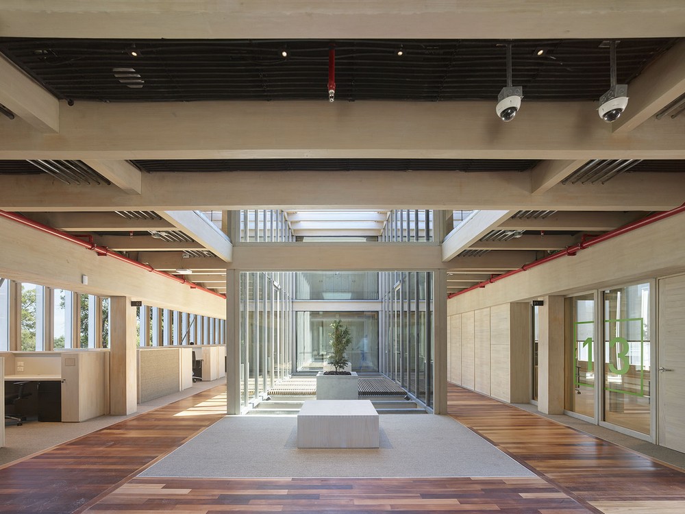 Los diez patios intercalados a lo largo del edificio aportan luz natural a las circulaciones, y junto a los vacíos de doble altura frente a cada una de las cinco escaleras, interrelacionan las dos plantas de oficinas dentro de una misma unidad espacial perceptible y ritman el espacio interior en las cuatro secciones longitudinales que componen la unidad del edificio.