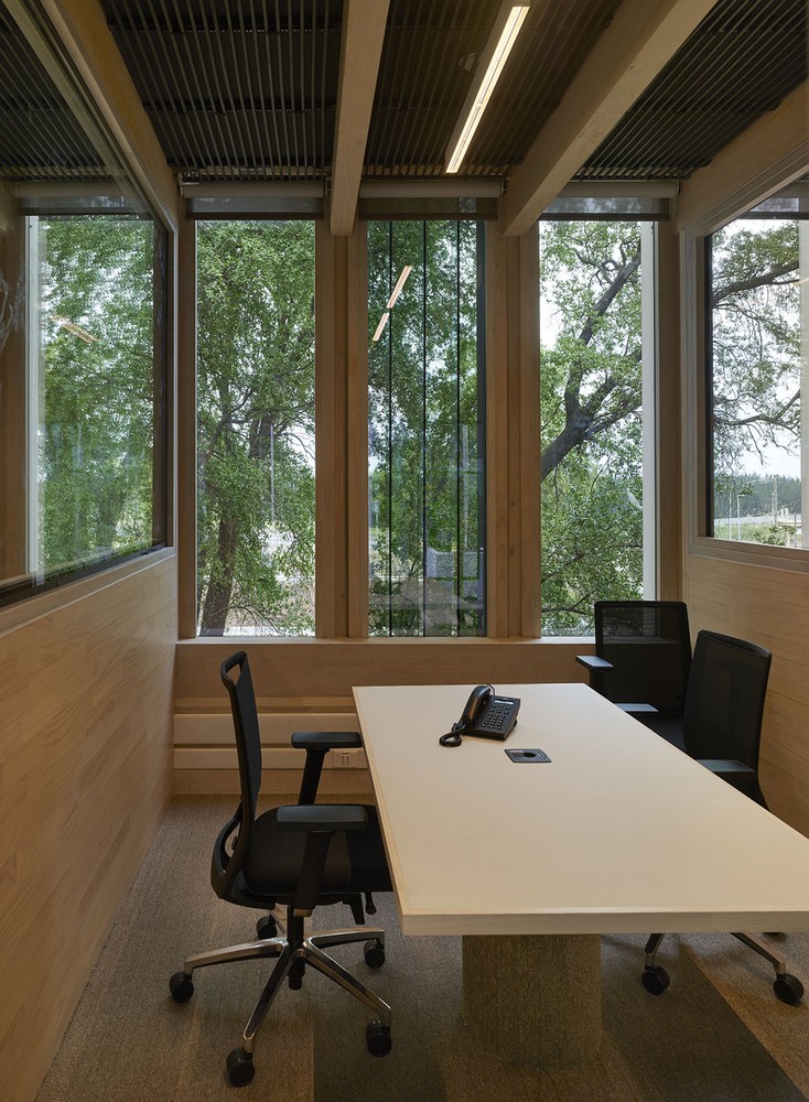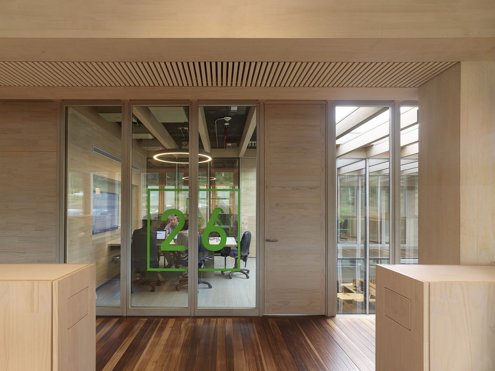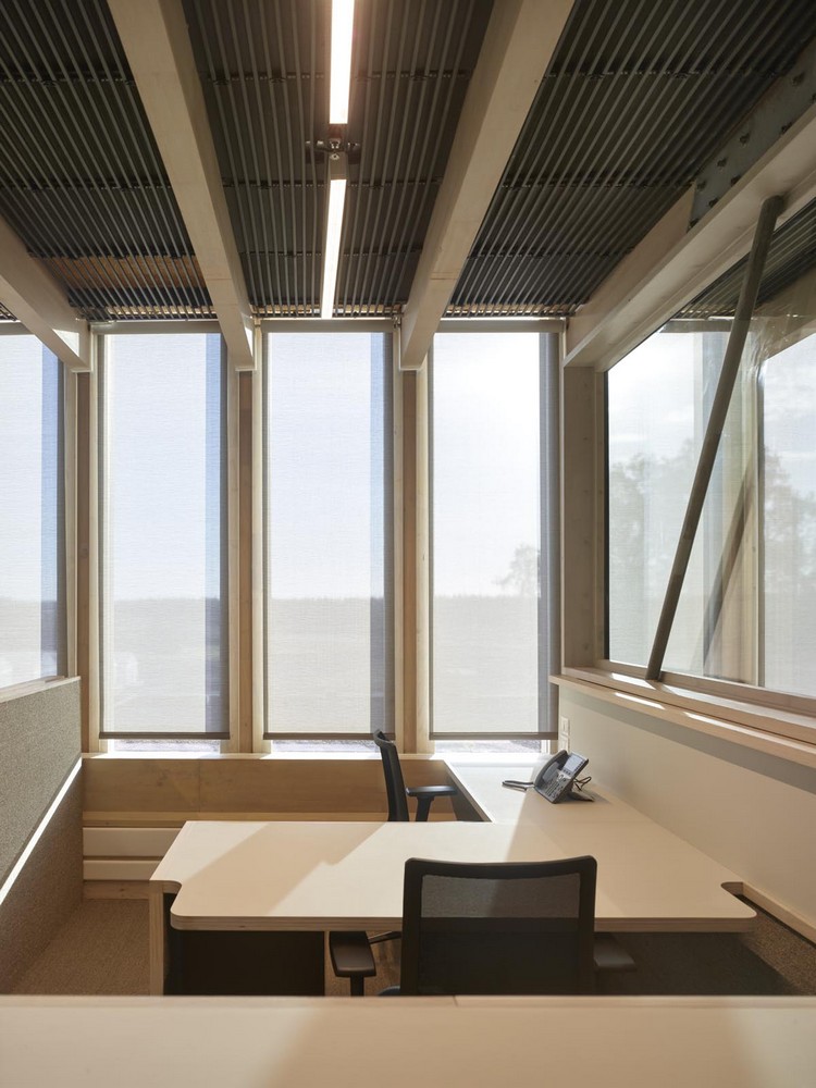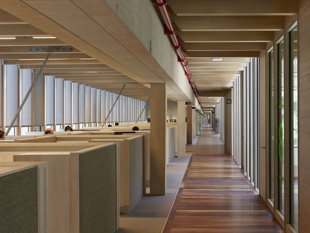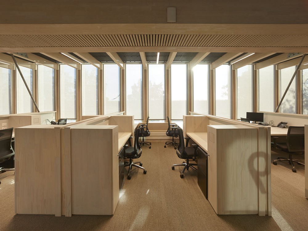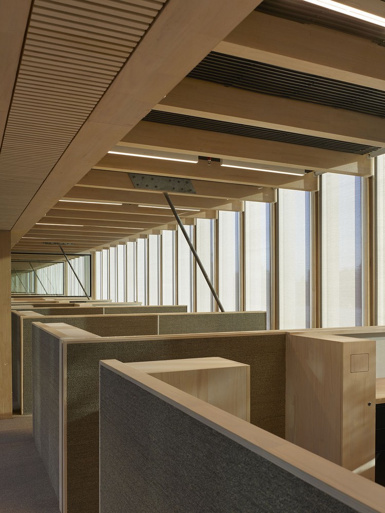 La arquitectura interior, coordinada con la modulación estructural y las redes de instalaciones del edificio, incluyó el diseño de muebles de estaciones de trabajo. Los paneles de estas estaciones que no están al alcance de la mano, al igual que los pisos de las naves donde se ubican, están cubiertos de alfombra, como absorbente acústico (complementario a la lana absorbente colocada sobre los serpentines de climatización a la vista en los cielos entre el envigado estructural).