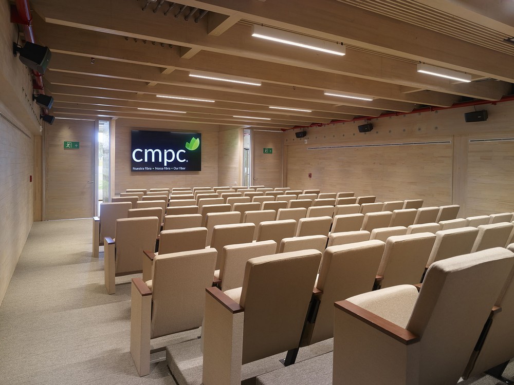 Al igual que en el Auditorio y en el Gimnasio y Multicancha, el cielo y los revestimientos de muros del Casino son de celosía de tablillas de pino sobre lana absorbente acústica, para obtener superficies atenuadoras de la reverberación del sonido y, apagando el bullicio, facilitar la conversación de los comensales.