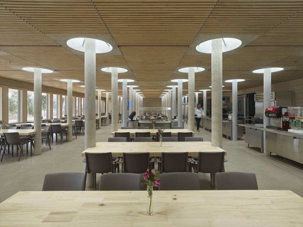 El comedor del casino es una sala hipóstila con columnas cilíndricas de hormigón armado visto de 20 cm de diámetro colocadas según la disposición de las mesas para servir de soporte de éstas y a la vez de la losa de cubierta, la cual queda suspendida de tensores de acero colgados de la punta de estas columnas para dejar abierto el paso de lucernarios de 80 cm de diámetro, como capiteles de luz en cada una.