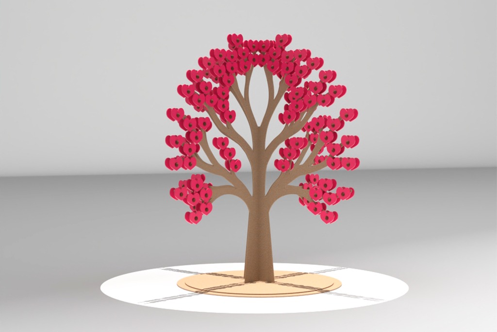 Propuesta conceptual "El Corazón que Florece" transforma una práctica simbólica en una acción ecológica real. Invita a las personas a plantar un corazón biodegradable con semillas nativas como gesto de amor y compromiso con el medio ambiente. La instalación funciona como un contenedor simbólico que recoge emociones y las convierte en vida. Solución técnica Se propone una estructura de fácil armado y traslado, compuesta por piezas de MDF cortadas en CNC. Este sistema de encaje permite un montaje rápido, sin herramientas complejas, ideal para espacios públicos y eventos temporales. Su forma orgánica simula un árbol que crece a medida que se le cuelgan los corazones. Creación de valor a través del material El MDF aporta valor por su bajo costo, versatilidad y conexión con el simbolismo natural del proyecto. Al ser un derivado de la madera, mantiene el vínculo con la tierra y la reforestación, haciendo posible una instalación significativa, accesible y coherente con su mensaje ambiental.