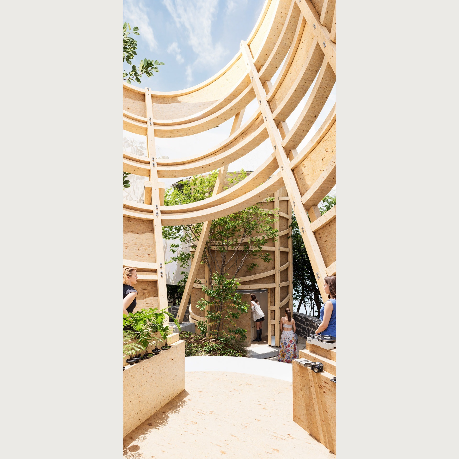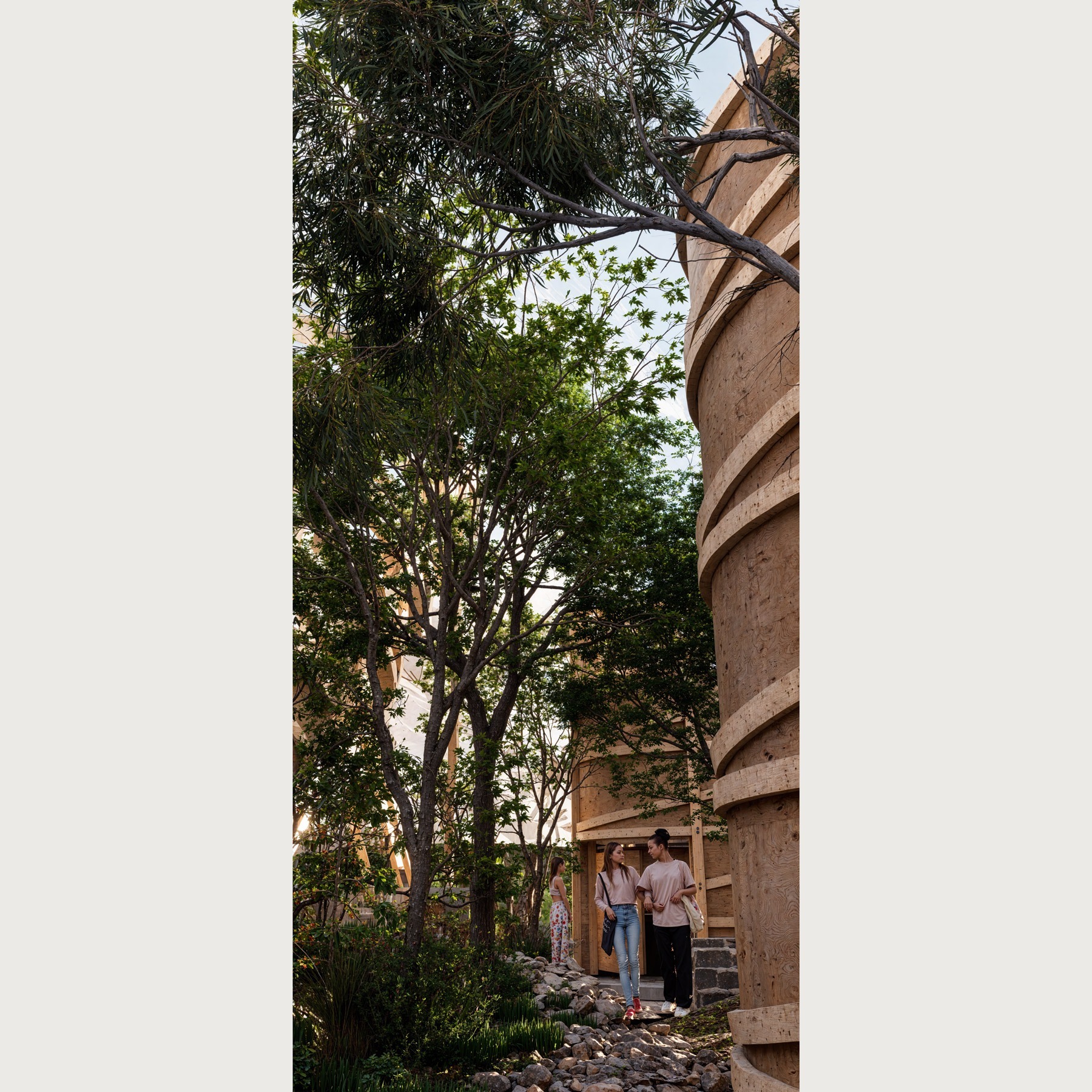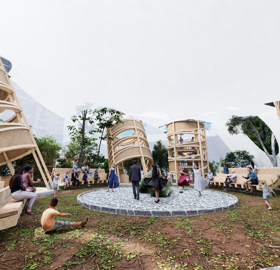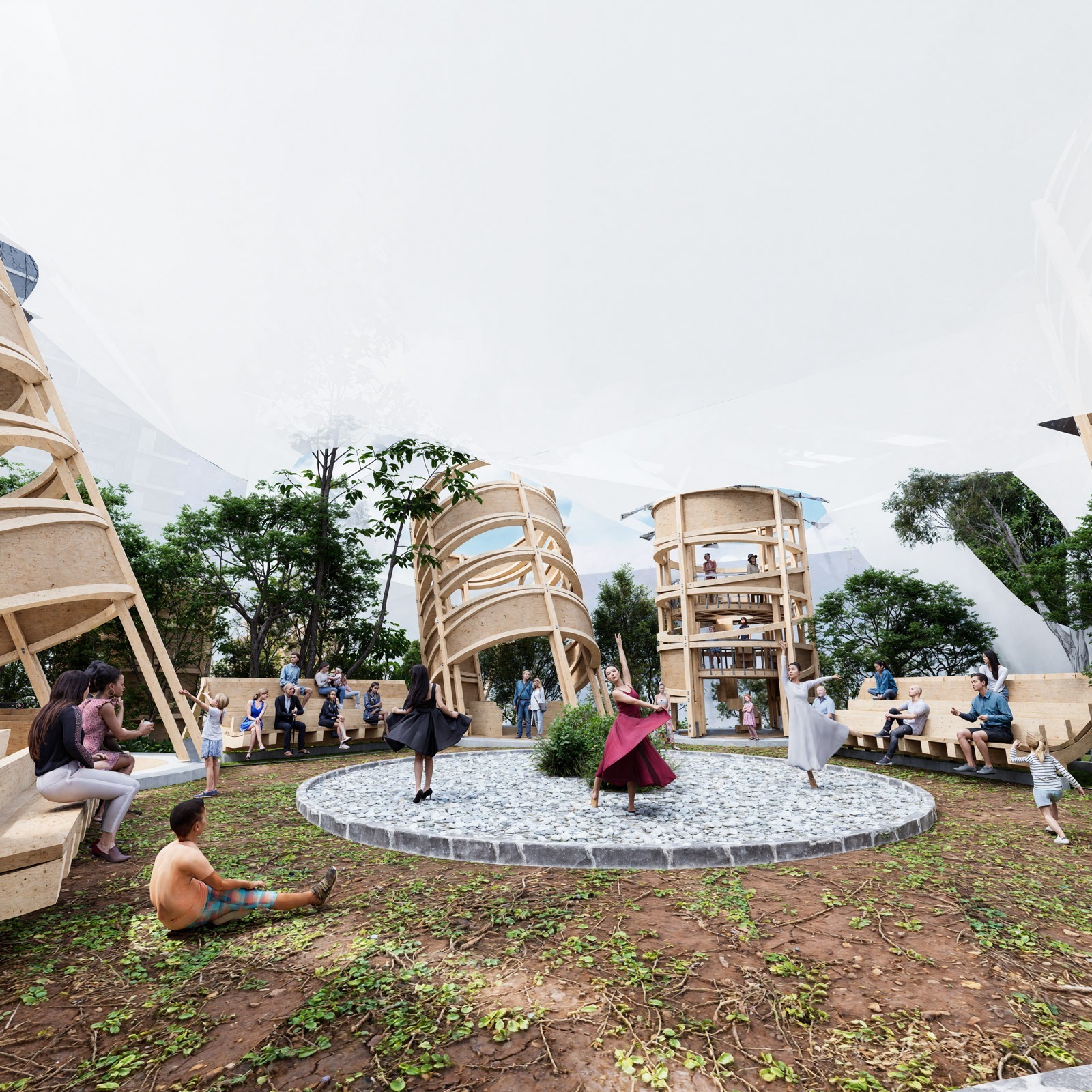 La madera es el material protagonista, tanto en su expresión visual como en su función estructural. Se emplean torres de madera laminada de gran altura con dobles verticales robustos, encastrados en anillos de madera termotratada y reforzados con placas de terciado estructural que cumplen funciones de arriostramiento y revestimiento interior dependiendo del programa. El sistema se ensambla con herrajes metálicos sobre cimentaciones modulares, facilitando un montaje rápido y preciso. La cubierta se resuelve con segmentos de membrana PTFE de dos tipos: translúcida y opaca, que varían según ubicación y que protege de la intemperie sin bloquear la luz, aportando ligereza y flexibilidad. Todos los elementos se prefabrican en taller para garantizar calidad y control dimensional, transportándose en camiones estándar y montándose en pocos días por un equipo reducido. Este enfoque reduce costos, tiempos de montaje y huella ambiental.