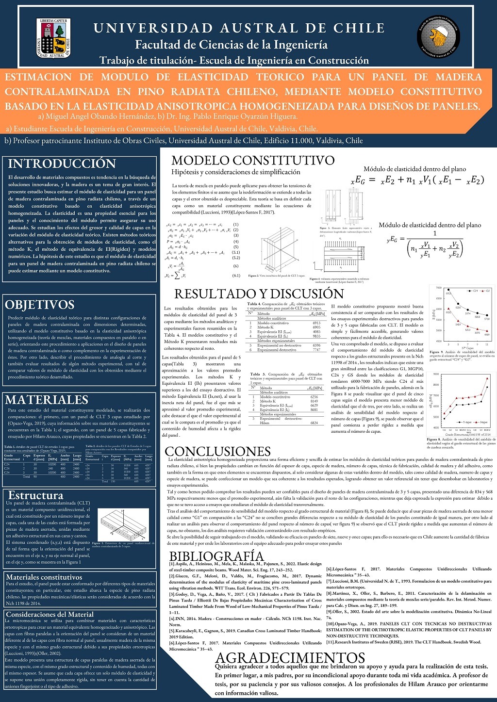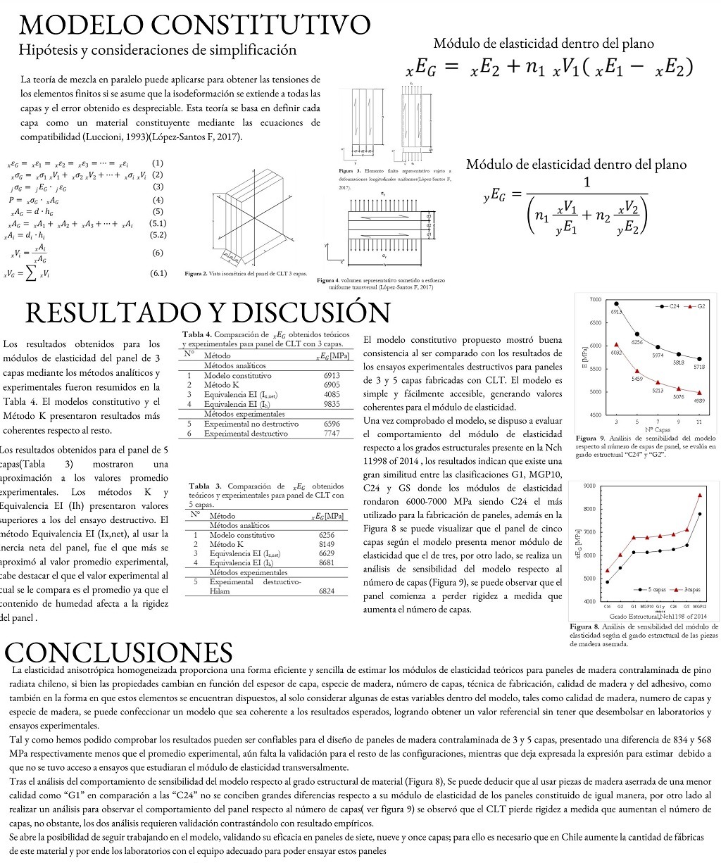 Estimación de módulo de elasticidad teórico para un panel de madera contralaminada en pino radiata chileno La madera contralaminada actualmente ha adquirido un alto potencial en Chile para el desarrollo de estructuras en madera prefabricadas que proporcionen mayor rigidez y a la vez un aspecto cálido y estético a las soluciones constructivas de manera sustentable. El incipiente estado de la utilización de este material en Chile, considerando el nivel de industrialización requerida, así como también los pocos laboratorios y plantas industriales dedicadas al estudio de este material, plantea un importante desafío al estudiar un material compuesto, que a su vez es heterogéneo y anisotrópico, requiriéndose variadas propiedades del mismo, siendo su obtención empírica, costosa y tediosa. Además, vale tomar en cuenta que las propiedades cambian en función del espesor de capa, especie de madera, número de capas, técnica de fabricación, calidad de madera y del adhesivo, como también en la forma en que estos elementos se encuentran dispuestos. Por otro lado, al usar técnicas de homogeneización, metodología de carácter teórica, se podría predecir constantes elásticas previas a la fabricación de paneles, en función de las propiedades de los materiales constituyentes, pudiéndose orientar el procedimiento incluso hacia la optimización del diseño de paneles de madera contralaminada, contribuyendo a eludir costos de ensaye en etapas previas del diseño o incluso a deducir qué calidades de piezas individuales permitirían completar el panel para obtener determinados patrones de resistencia., o complementar los obtenidos teóricos como referencia a la experimentación. Objetivo General - Predecir módulo de elasticidad teórico para configuraciones de paneles de madera contralaminada con dimensiones determinadas, utilizando el modelo constitutivo basado en la elasticidad anisotrópica homogeneizada (teoría de mezclas, materiales compuestos en paralelo o en serie). Objetivos Específicos