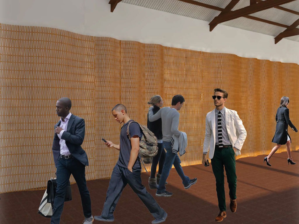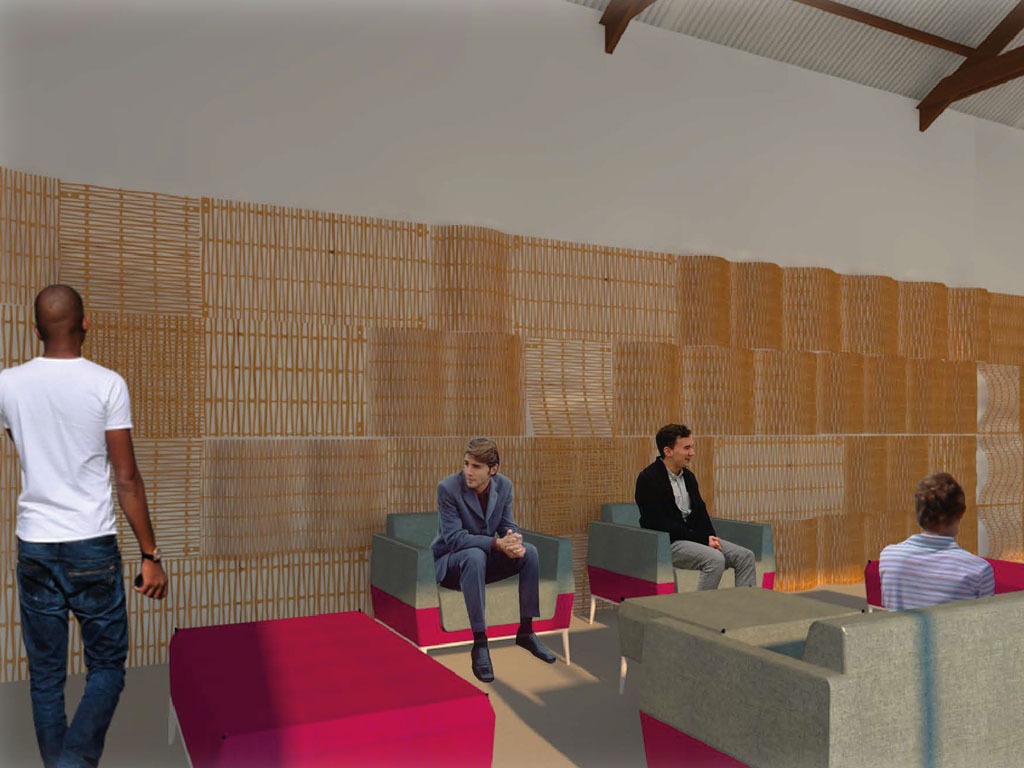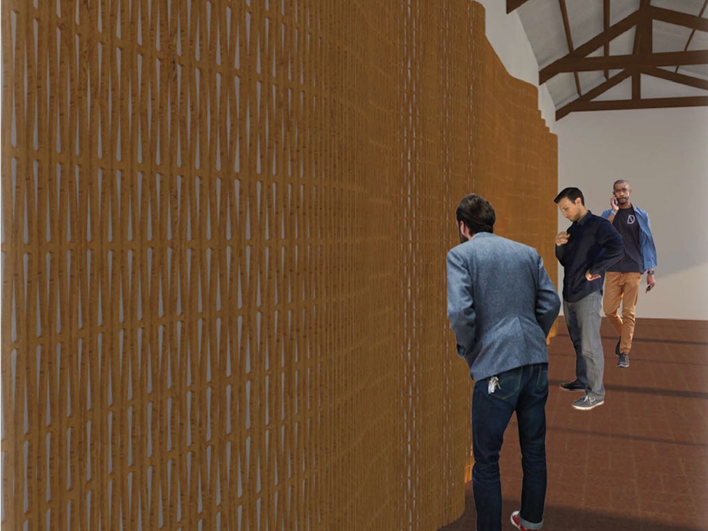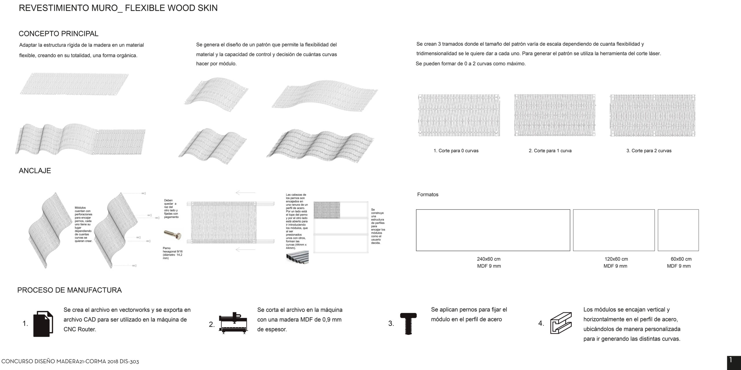 Piel de MDF, basado en sistema de ranuras, cortadas en CNC Laser, que genera un patrón dónde permite darle flexibilidad a la madera y así crear distintas curvas a través del sistema de anclaje.