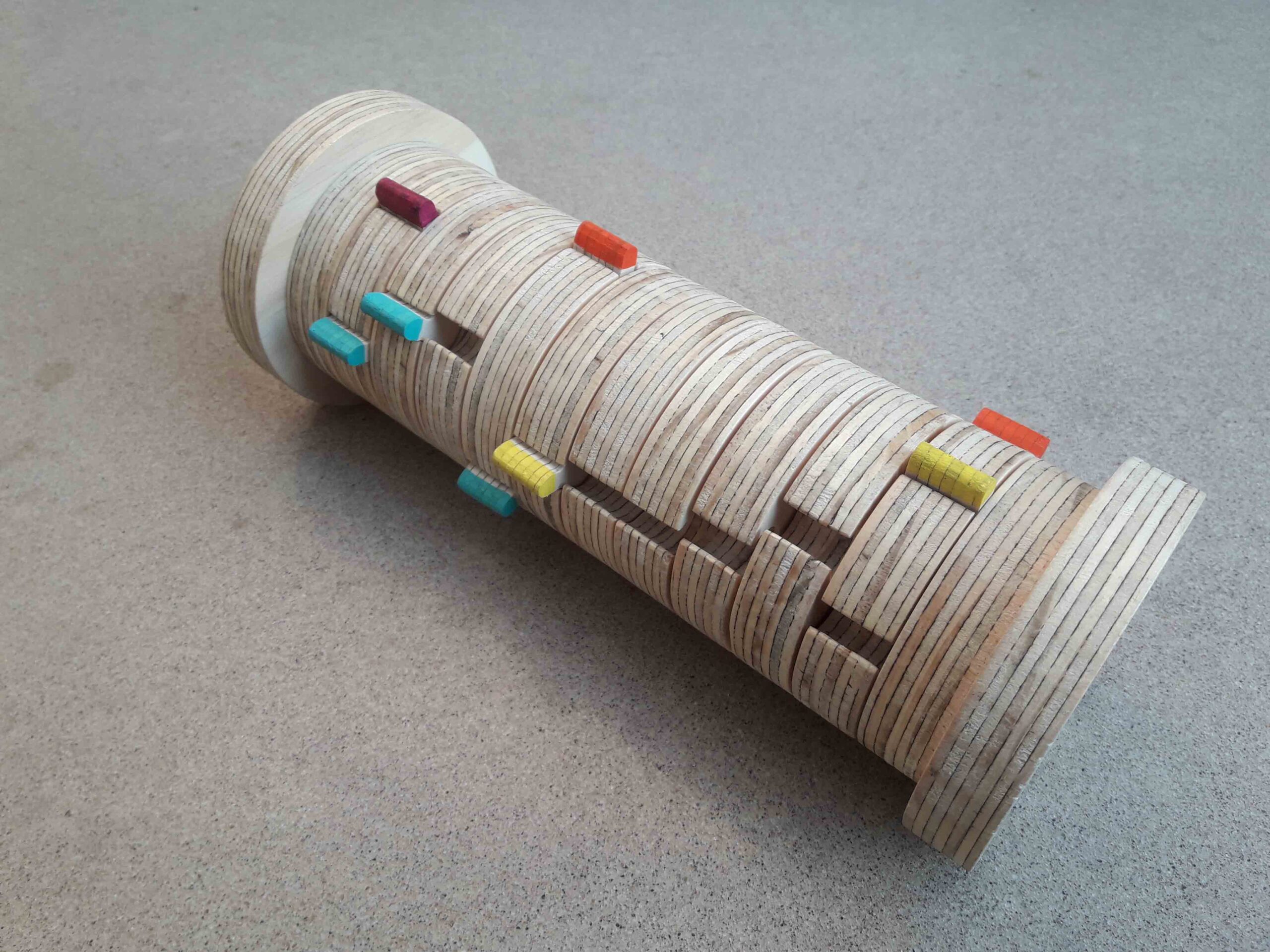 Se pensó en una forma cilíndrica porque, ya que el juego es en base de giros los círculos pueden mantener la forma y respetar limites en el espacio del juego, es ergonómico para las manos y además permite el uso total de la superficie del juego.