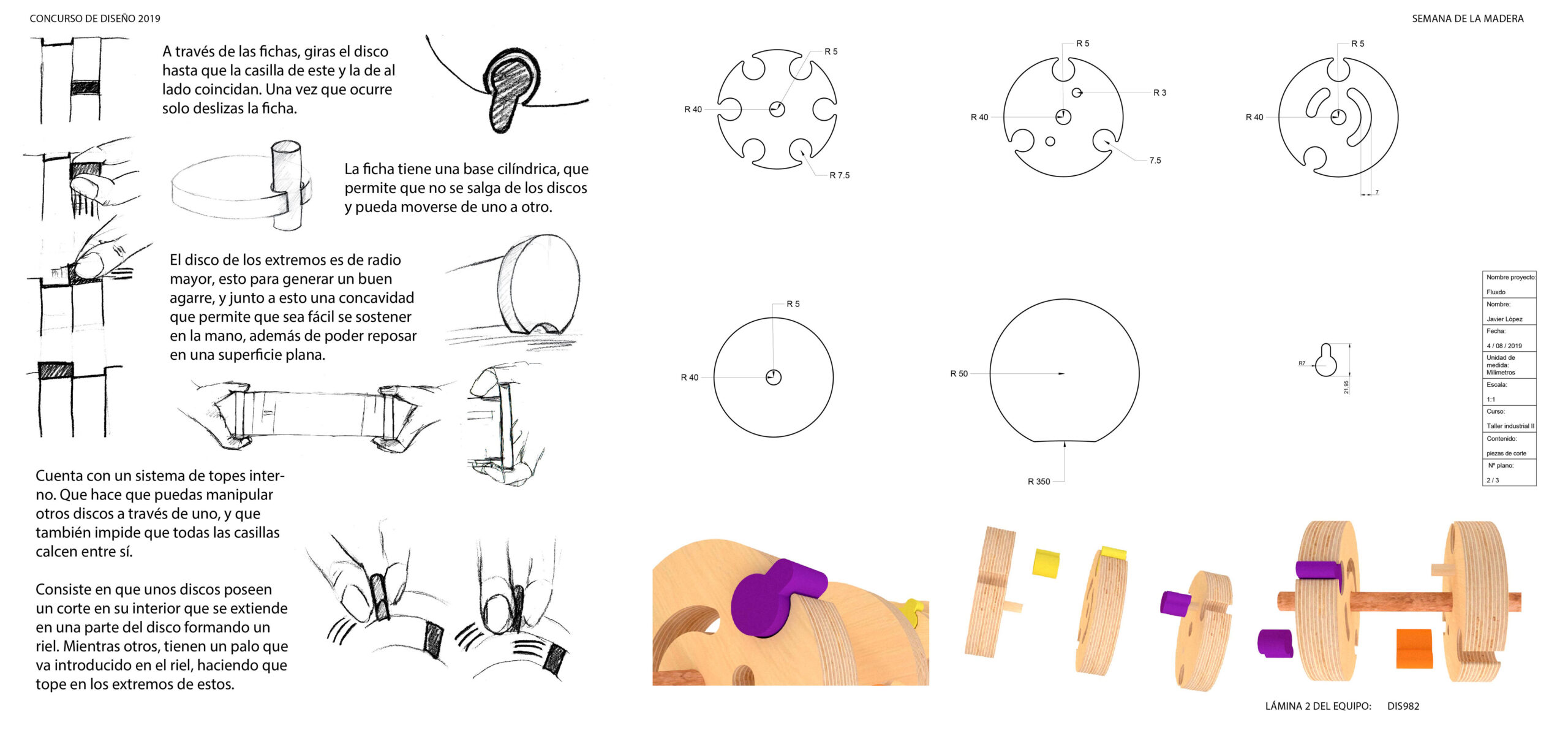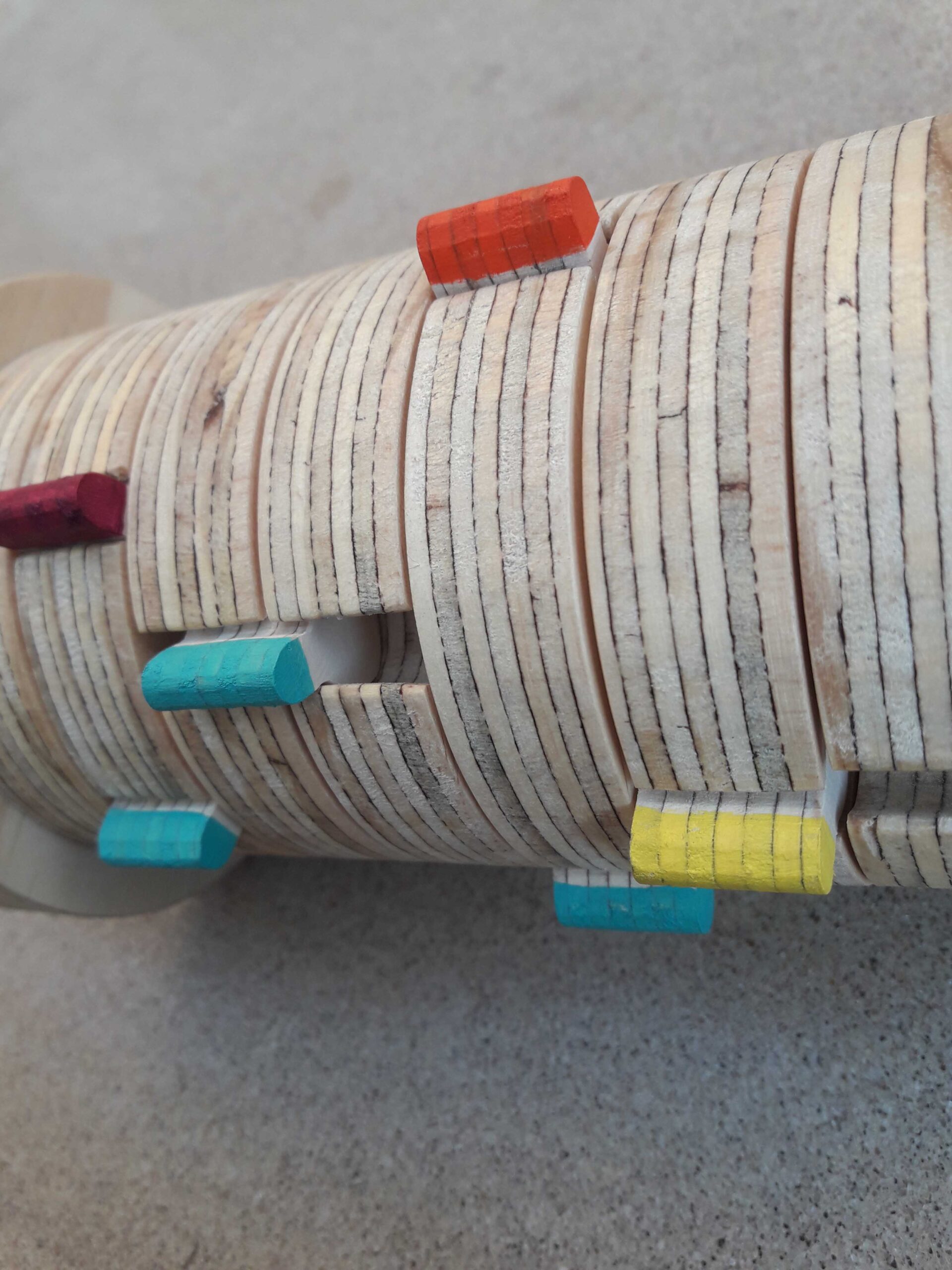 Para Fluxdo se utilizó terciado 18 mm, ya que además de ser estético, es una madera fácil de trabajar debido a que es una madera ya trabajada, y al estar hecho de placas superpuestas, es resistente. El grosor de la plancha colabora con el volumen del objeto, de modo que solo se necesito corte de dos ejes para la elaboración de cada pieza.