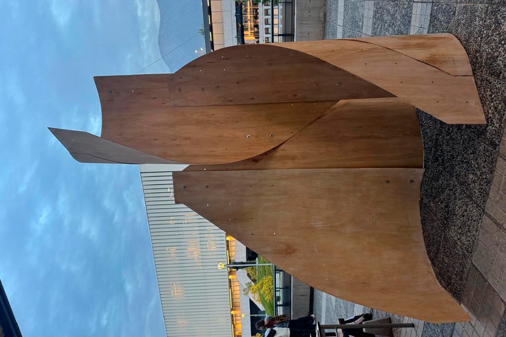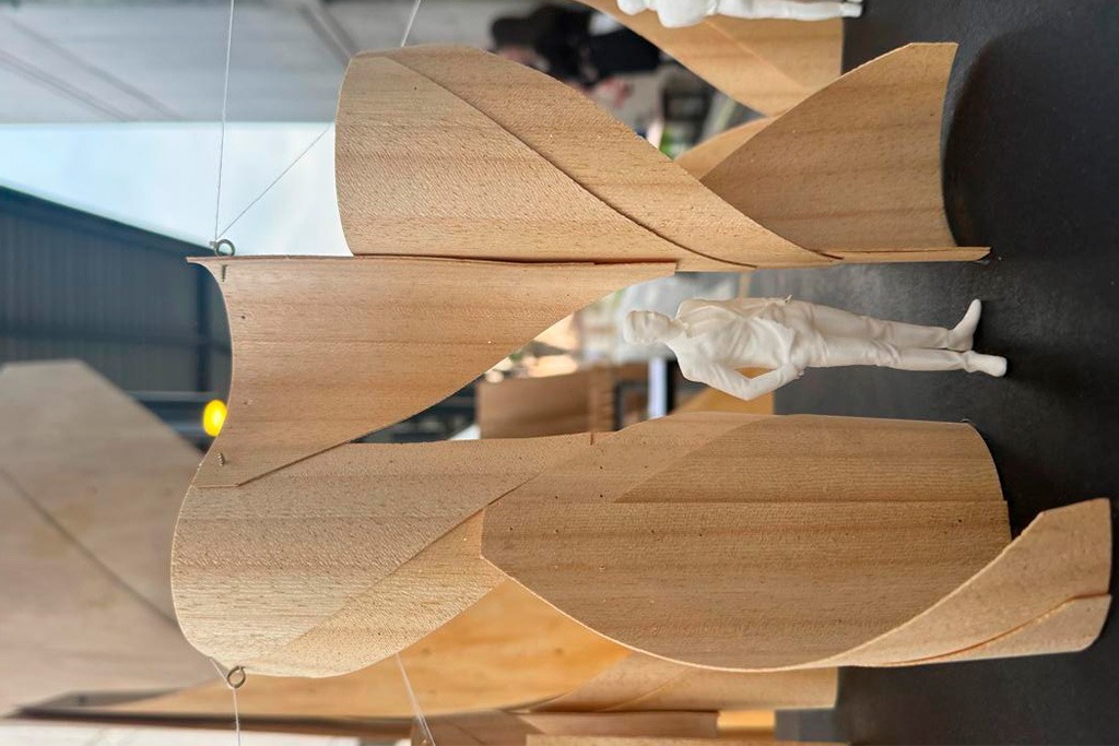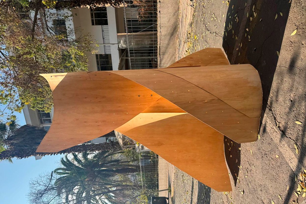 Desde la materialidad, se trabaja con chapa de madera plegada, explorando su calidez, ligereza y flexibilidad estructural. A través de cortes y perforaciones precisas, los módulos adquieren rigidez sin necesidad de refuerzos ocultos, permitiendo una expresión formal honesta y funcional. La repetición y variación controlada de piezas genera un sistema constructivo claro, donde cada elemento cumple un rol estructural y estético. Así, el material no solo define la forma, sino que también habilita una arquitectura accesible, transformable y táctil, capaz de generar experiencias espaciales sensibles desde su lógica constructiva.