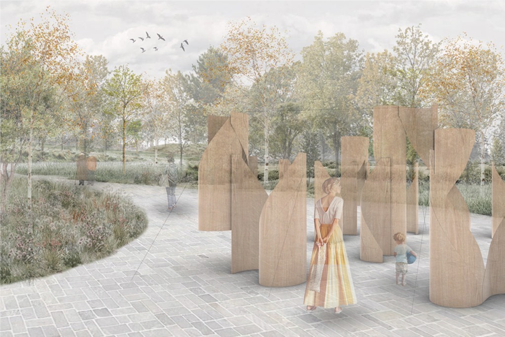 La propuesta, instalada en el Parque Bicentenario, plantea una estrategia adaptable que permite su integración orgánica con diversos entornos. Su sistema modular flexible dialoga con la geografía, vegetación y recorridos peatonales, facilitando la adaptación a distintos sitios urbanos. Organizada en cuadrantes, permite actividades simultáneas como pausas contemplativas o eventos lúdicos. El diseño enfatiza la verticalidad y ligereza, con módulos de chapa perforada ensamblados sin herramientas, promoviendo la participación activa. La estabilidad se logra gracias a la curvatura y el ensamblaje colectivo, desafiando la fragilidad aparente del material y activando el espacio público desde la temporalidad y adaptabilidad.