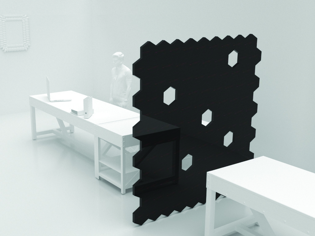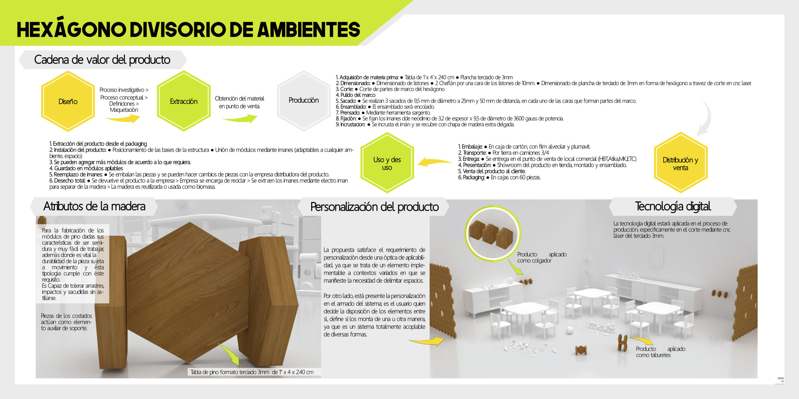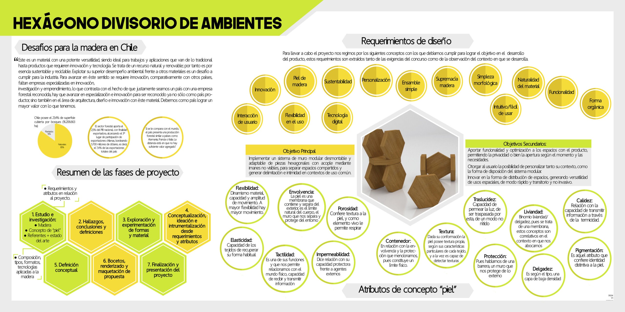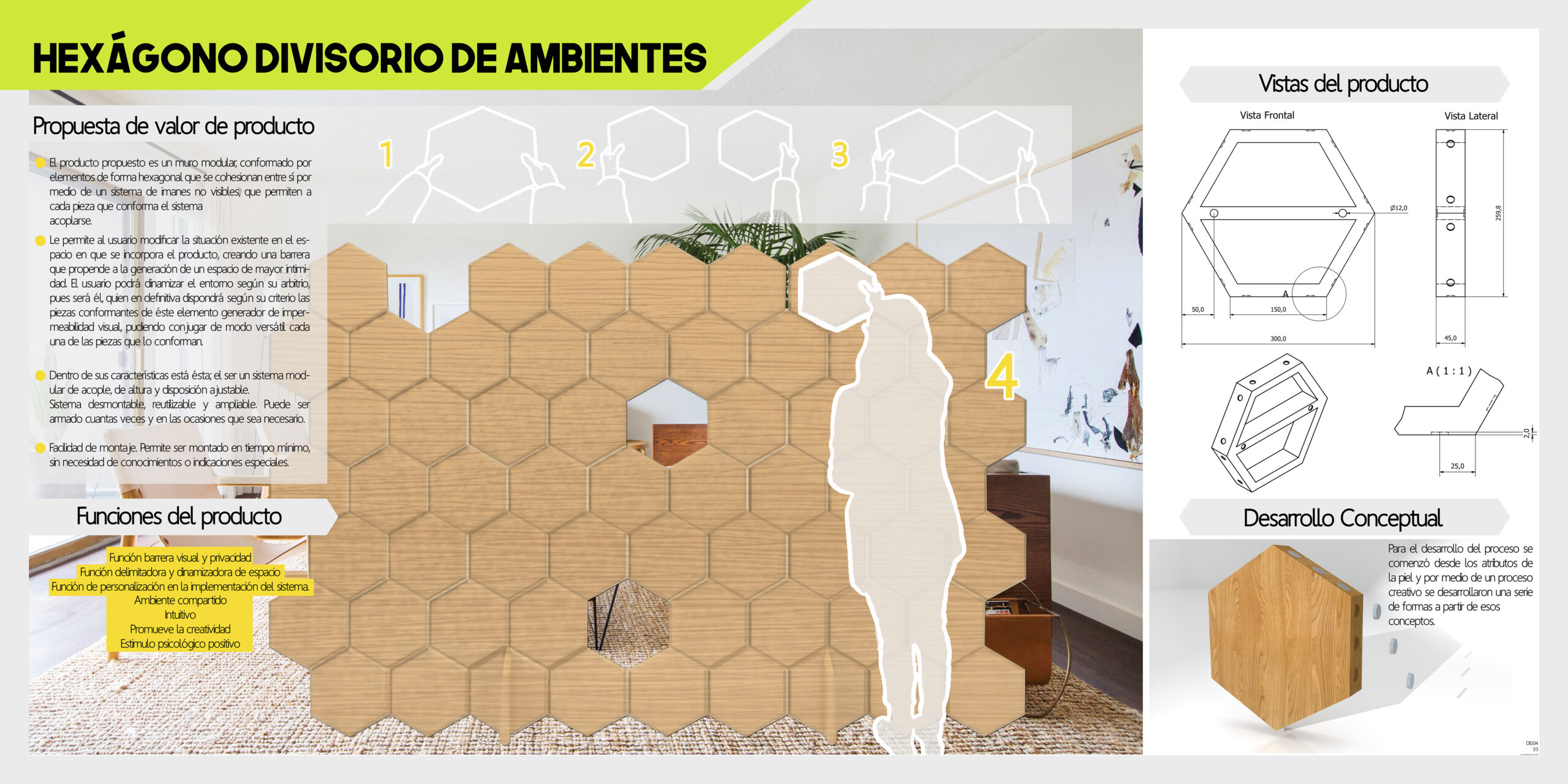 Muro separador de ambientes personalizable construido en madera y compuesto por elementos hexagonales que se unen entre sí por un sistema de imanes. Este muro confiere dinamismo a los espacios en que se implementa, siendo de fácil y rápido e intuitivo montaje. Ha sido desarrollado en un proceso creativo respondiendo a criterios de sustentabilidad, tecnologías digitales, personalización e innovación en la utilización de los materiales.