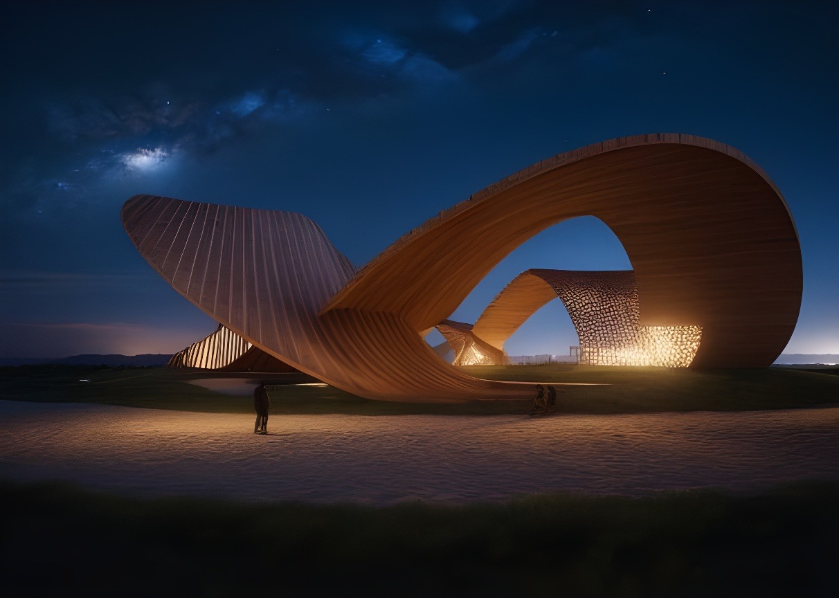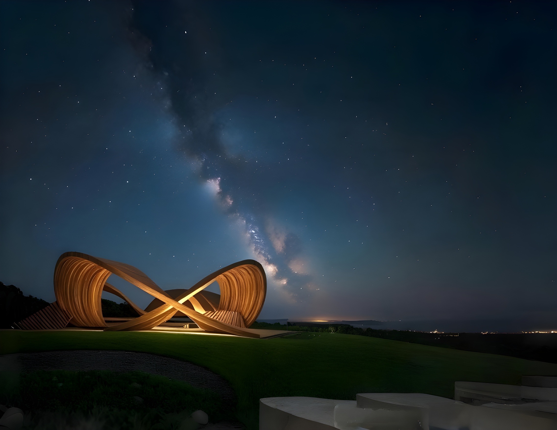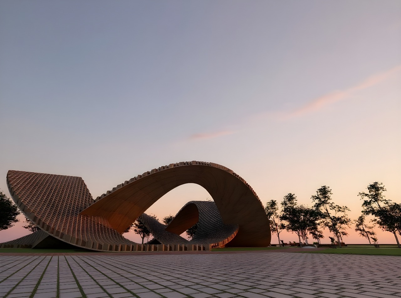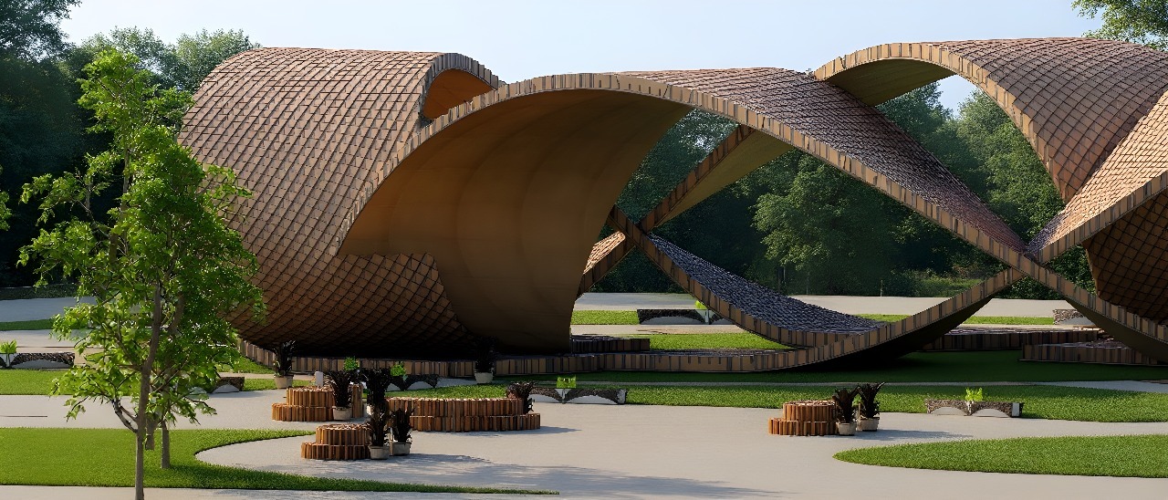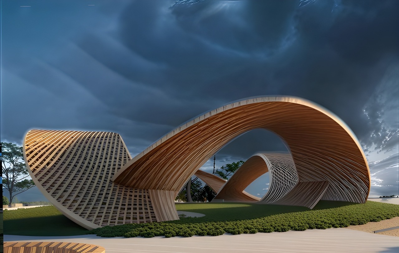 El pabellón de madera con forma orgánica ondulante inspirado en el símbolo del infinito representa la continuidad, fluidez y conexión entre espacio, usuario y entorno. Su geometría curvada se integra de forma armónica con el paisaje, generando una experiencia sensorial envolvente y dinámica. La elección de la madera como material principal refuerza la calidez, sostenibilidad y flexibilidad estructural del diseño. Esta propuesta logra una coherencia entre concepto, forma y material, creando un espacio simbólicamente potente y funcionalmente adaptable.