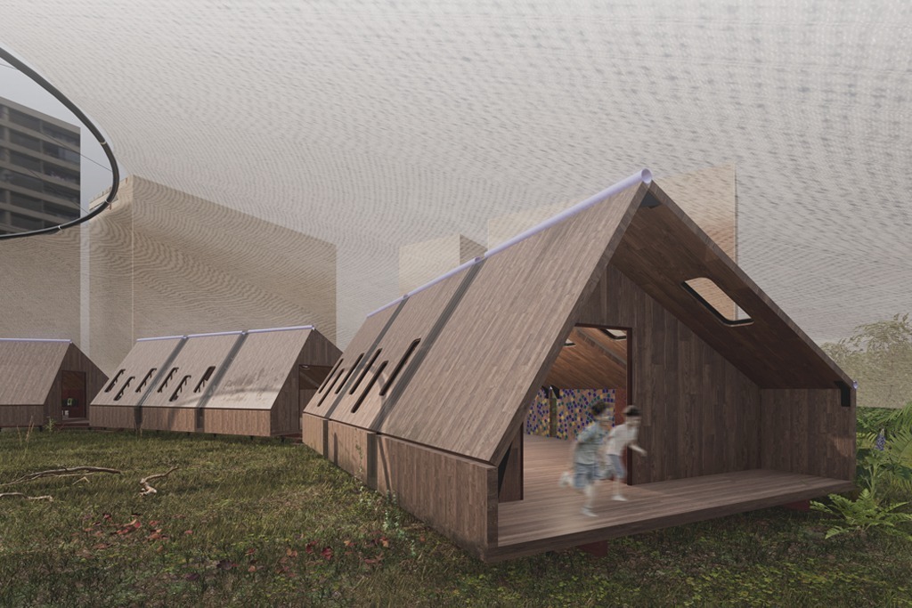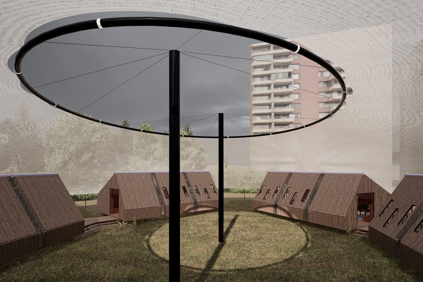 A diciembre de 2023, Chile registraba la presencia de cerca de dos millones de personas extranjeras, de las cuales más de 300 mil eran menores de edad. La mayor concentración de familias migrantes se encuentra en las principales ciudades del país, destacando la Región Metropolitana con un 56,8% del total. Ante este escenario, la propuesta plantea una estrategia de localización flexible, capaz de emplazarse en terrenos urbanos subutilizados o espacios públicos disponibles, priorizando zonas de alta densidad infantil. El programa se compone de módulos plegables que, al unirse, conforman un patio interior tipo “corral”, generando un núcleo protegido y controlado. Esta disposición facilita la organización de actividades y garantiza un entorno seguro para la niñez. Finalmente, la cubierta de textil PVC funciona como solución de aislación térmica y protección del material estructural, permitiendo un desempeño eficiente frente a diferentes condiciones climáticas y prolongando la vida útil del conjunto.