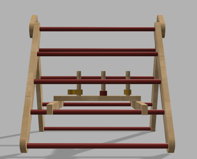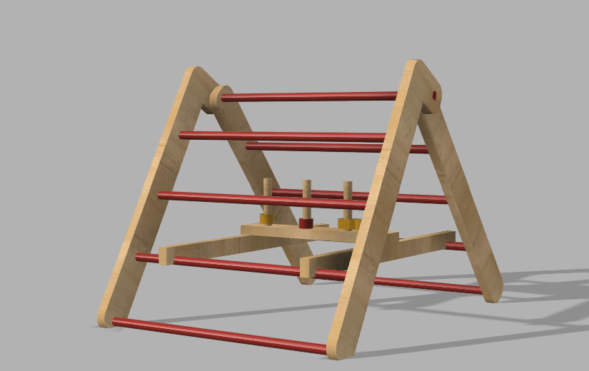 La forma de la propuesta es basada en el diseño original de triangulo pikler, usualmente están cerrados por abajo o tienen una conexión en la parte superior, la propuesta puede cerrarse en si misma a la perdida de depender de una barra que mantenga el triangulo abierto, pero de esa restricción se aprovecha para implementar el segundo juego Montessori dentro, cada “pata” mide 60 cm (sin redondear), los orificios para las barras son de 18 mm, los orificios son perforados hasta la mitad de la barra de madera a excepción el ultimo orificio, por donde pasa una barra adicional para conectar las 2 secciones.