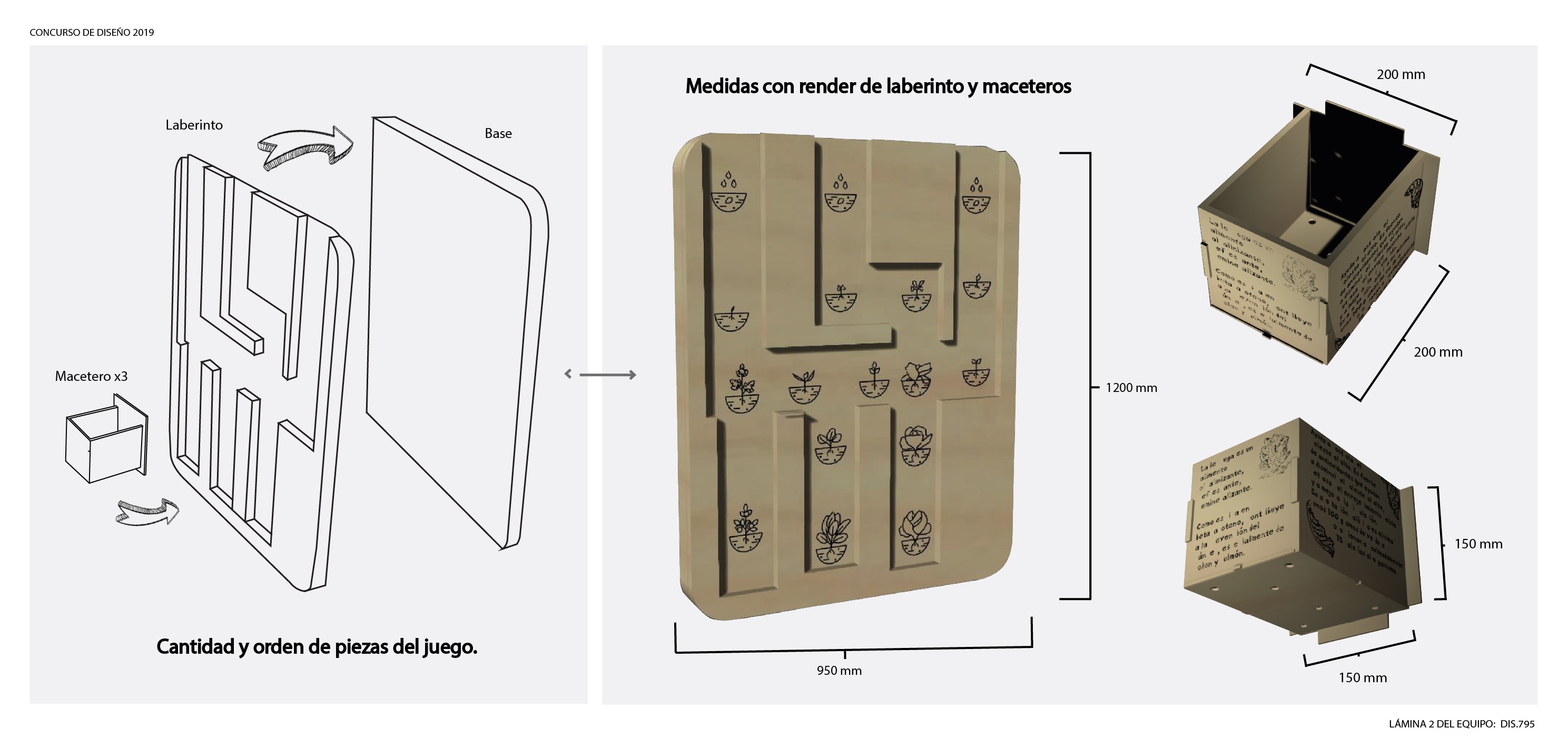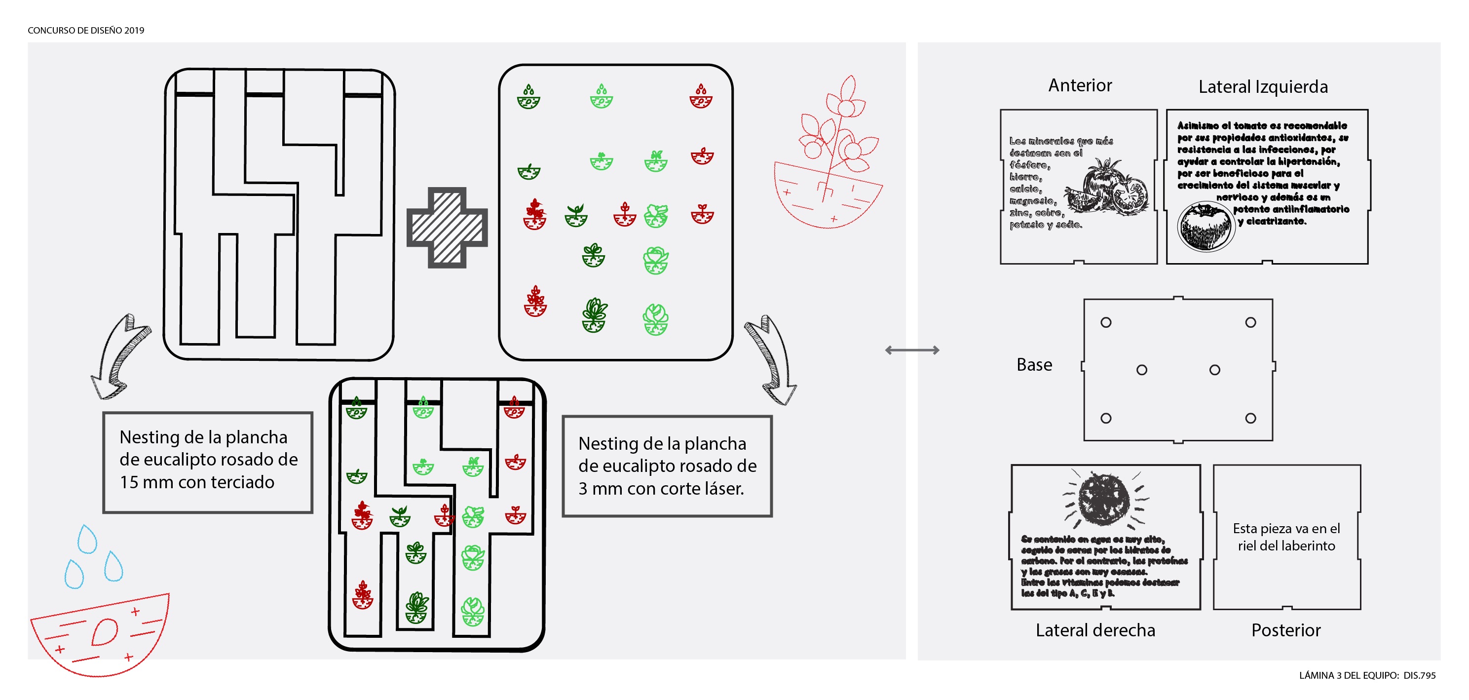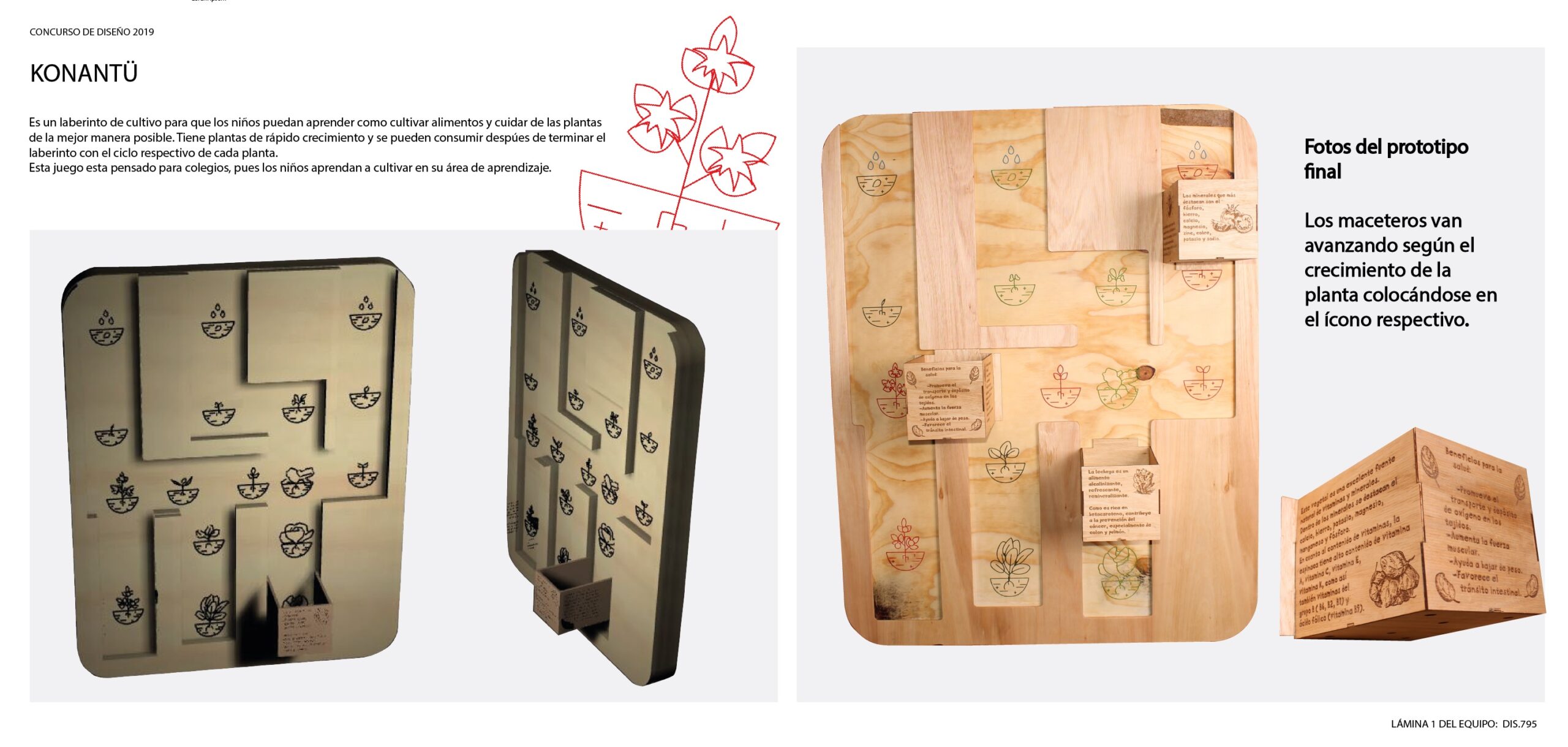 El juego es un laberinto vertical hecho de madera el cual se cuelga en la pared, con tres caminos diferentes hechos con fresadora que se intersectan entre sí y se diferencian con iconos hechos con cortadora láser del crecimiento de cada planta, los cuales van avanzando por un sistema de riel según la etapa del ciclo en que va la planta, si esta en germinación va siguiendo en su camino respectivo, así sucesivamente. En los maceteros están los beneficios respectivos de la planta que se cultivará. El final del laberinto es cuando la planta está en la etapa de cosecha, el premio son los frutos de esta y el aprendizaje durante el camino del laberinto.