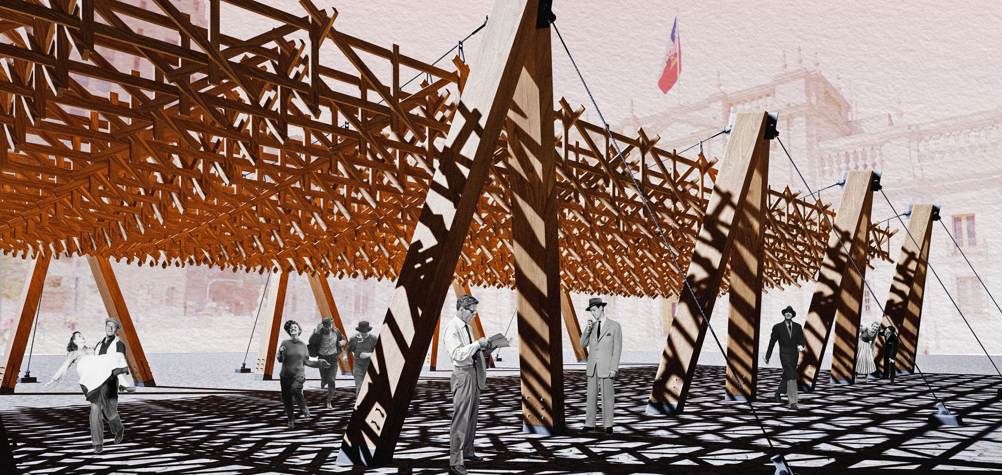 El proyecto propone una intervención efímera y liviana inspirada en la figura de la nube: una estructura suspendida, cambiante y etérea que transforma la percepción del espacio sin tocar directamente el suelo. Esta “nube” se conforma a partir de una trama de cerchas de madera que se conectan entre sí mediante diagonales, generando una retícula de apariencia caótica, pero basada en una lógica constructiva precisa y repetitiva. Suspendida sobre pilares inclinados de madera en forma de A y tensores de acero galvanizado, la estructura flota por sobre el suelo, filtrando la luz y proyectando sombras móviles que definen un espacio intermedio: entre lo abierto y lo contenido, entre el tránsito y la contemplación.