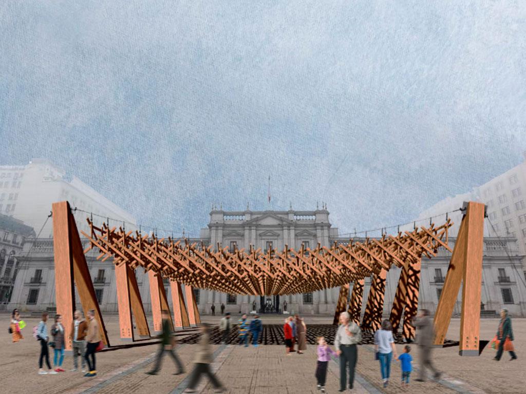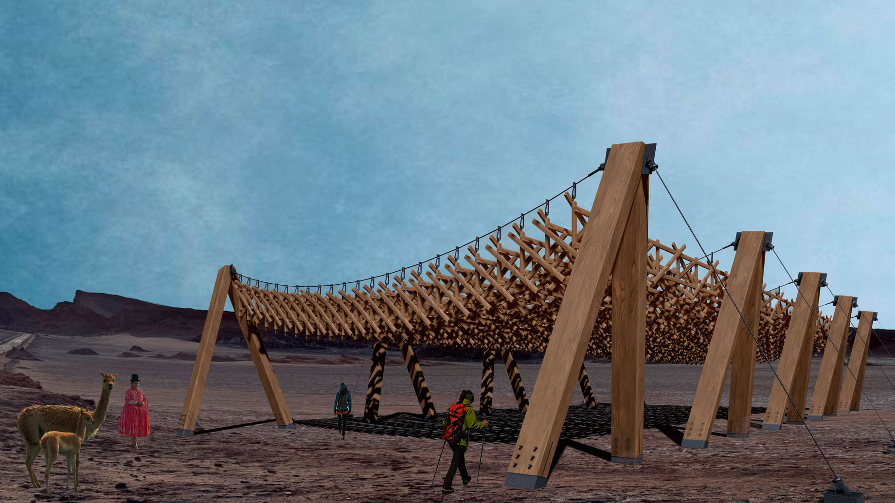 Pensada como una intervención nómade, la estructura puede instalarse temporalmente en distintos lugares del país: explanadas, parques o paisajes naturales. Su carácter modular y desmontable facilita el transporte, la instalación y la reutilización, adaptándose a diversos contextos geográficos y culturales. La propuesta busca activar espacios públicos subutilizados, ofreciendo un refugio que estimula nuevas formas de habitar lo cotidiano. Bajo la cubierta, se configura un espacio abierto y versátil que puede acoger desde pequeñas exposiciones o ferias, hasta actividades recreativas o instancias de encuentro. Se trata de generar un marco espacial que invite a la apropiación por parte de la comunidad, no de imponer un uso único.