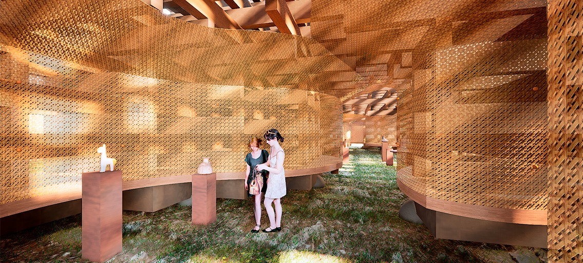 El concepto se basa en la fusión entre luz, materia y oficio. La madera, como material principal, no solo responde a criterios de sostenibilidad, sino que aporta calidez y conexión directa con los oficios manuales. La luz natural, filtrada a través de la grilla y el mimbre, es protagonista en el recorrido del visitante, creando atmósferas cambiantes y envolventes que resaltan las piezas exhibidas y generan un ambiente acogedor para la observación de los espacios. La estructura utiliza sistemas constructivos en seco, facilitando su transporte, montaje y desmontaje sin afectar el entorno. Su diseño modular permite que se adapte a diferentes emplazamientos, ya sea en plazas, parques o espacios culturales abiertos.