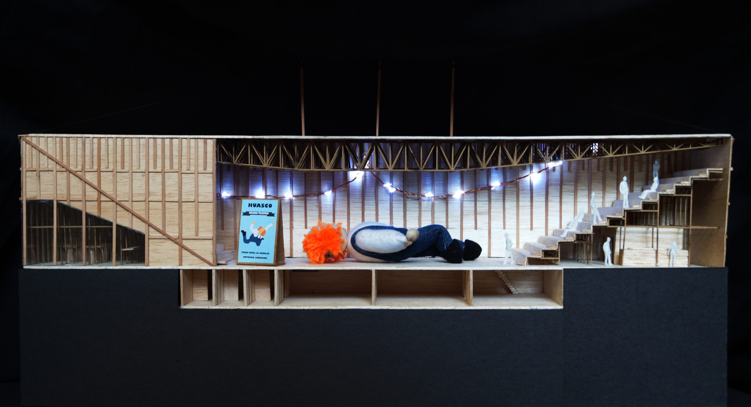 Ubicado en la zona norte del país, el proyecto es capaz de acoger dentro de sus 352m2 , diversas actividades de teatro, música y cultura para la comunidad de Huasco que cuenta con 10.150 habitantes. Este microteatro trabaja el espacio urbano como articulación entre el teatro, el borde habitado y el agua.