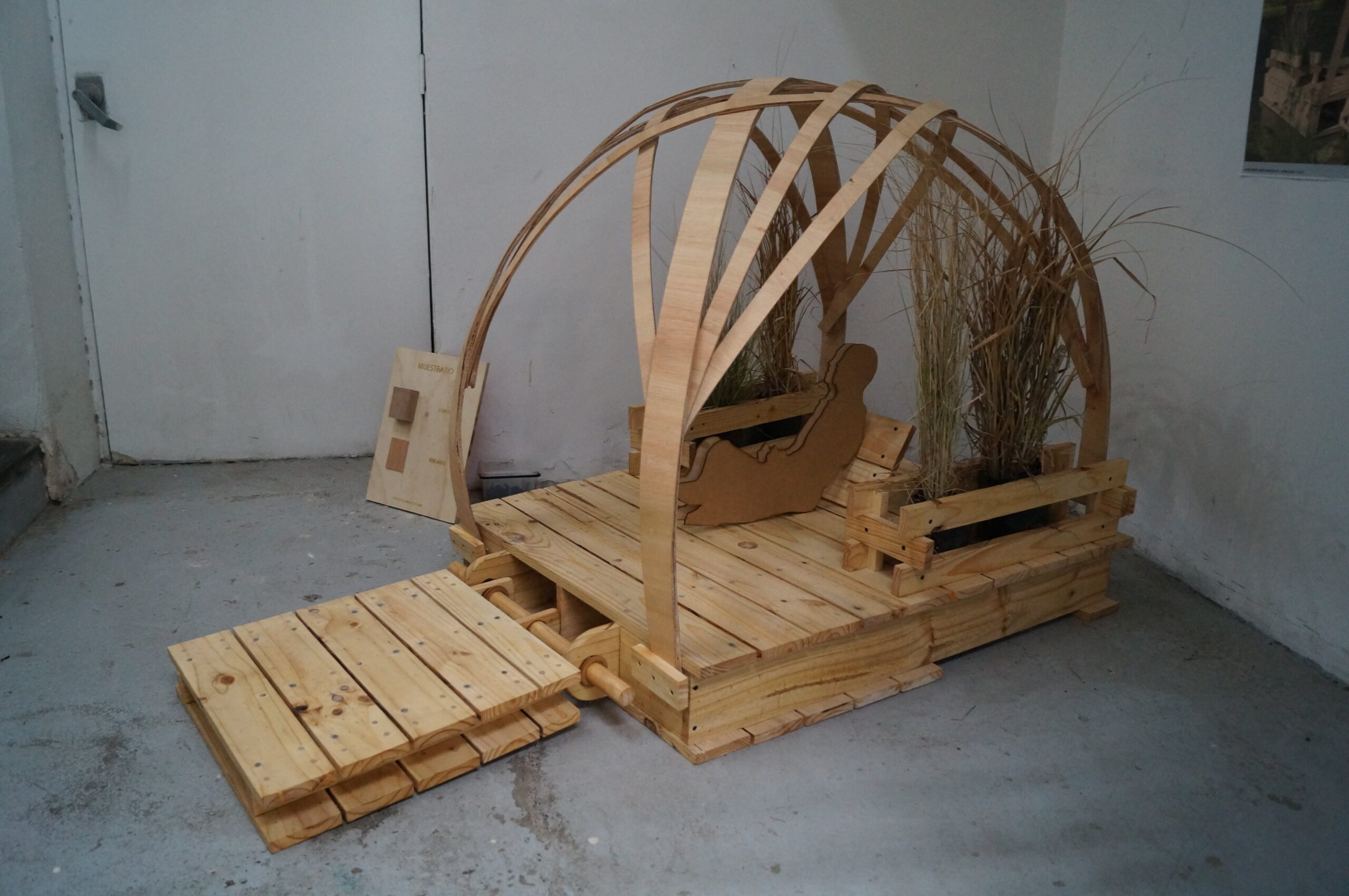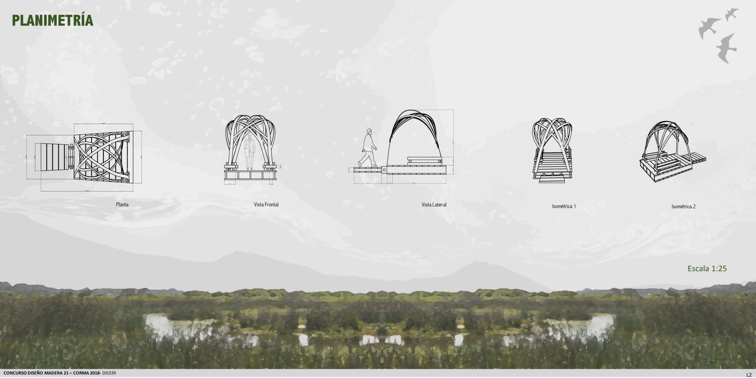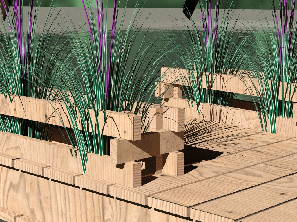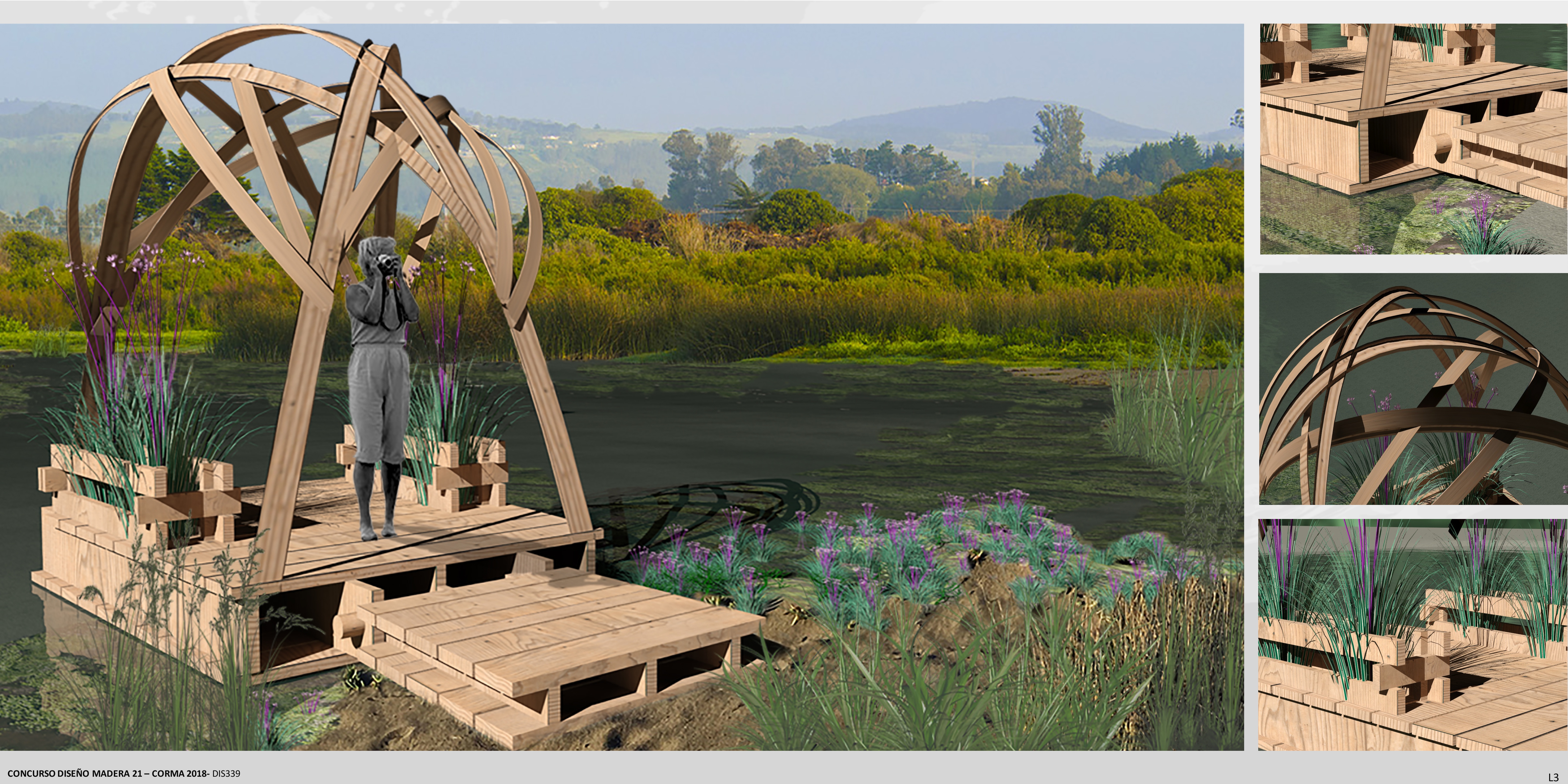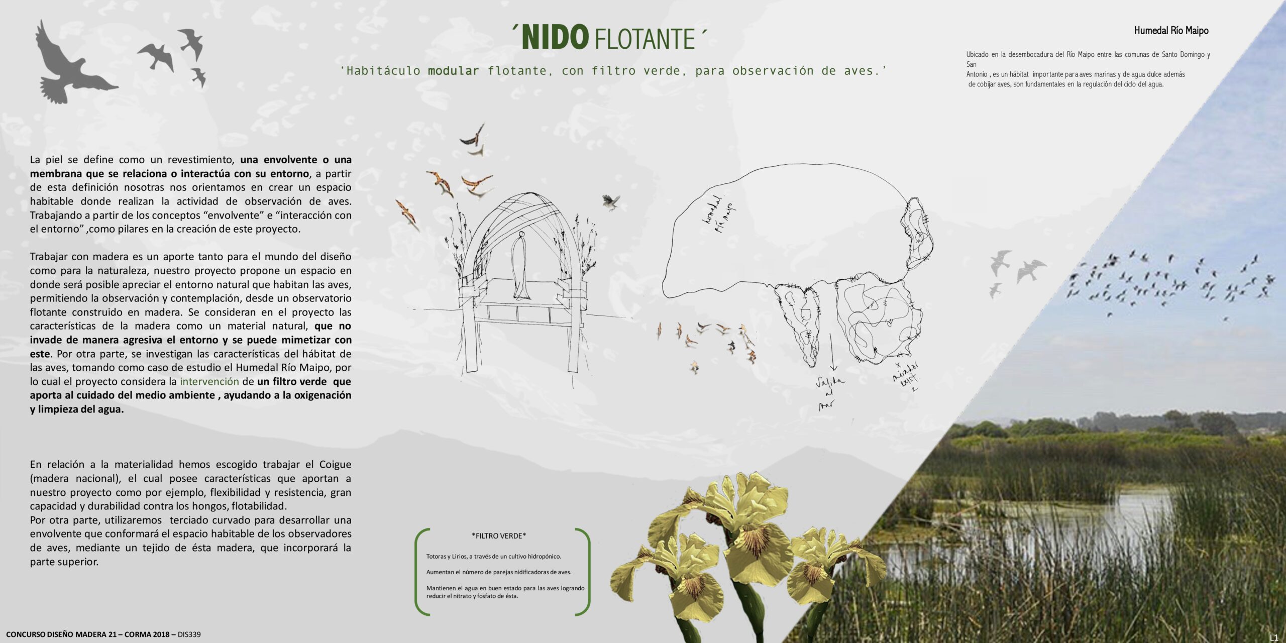 "Habitaculo modular flotante con filtro verde para observacion de aves" trata sobre un modulo de observación de aves inserto en el humedal Río Maipo. Una balsa flotante con forma de nido, para sentirse parte del habitat y de la actividad de observacion de aves. A demas nuestras balsas cuentan con cultivos hidroponicos de Totoras y Lirios , las cuales sirven como filtro verde para la reduccion de fosfato y nitrato de las aguas y a demás son de gran ayuda para aumentar las parejas nidificadoras de aves del lugar. Por otra parte, este filtro verde es un aporte a la mimetizacion de nuestras balsas y a que el observador se pueda esconder tras ellas y pasar desapercibido. Cuenta tambien con un respaldo, el cual tiene 4 alternativas diferentes de posturas para poder mirar hacia cualquiera de los dos frentes.