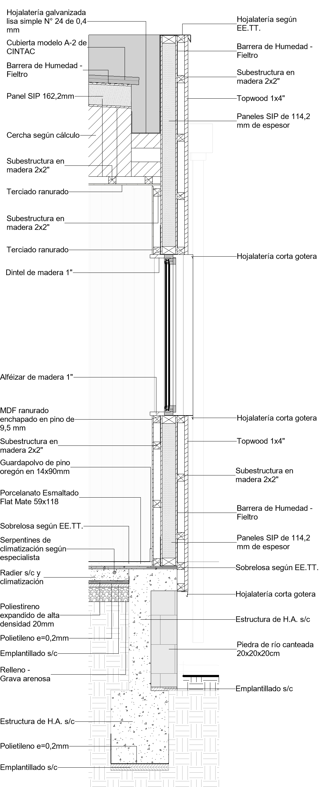 En el proyecto, la madera es un elemento constructivo que juega un papel principal, que se integra con el zócalo de hormigón y piedra. Es un material que, por su flexibilidad, se adapta a las condiciones climáticas del lugar, alta oscilación térmica y variaciones de humedad. Las estructuras de madera arman marcos con encuentros particulares que permiten realzar la espacialidad y se complementan con paneles SIP, elemento constructivo principal de la obra, prefabricado, de fácil transporte, montaje, acopio, flexibilidad y excelente aislación térmica. Este componente no sólo fue utilizado en los muros, sino que también en las cubiertas. Se destaca la flexibilidad del panel SIP y como éste se integra con otros materiales. Se erige sobre un zócalo de hormigón armado con piedra y se complementa con estructuras de pilares y vigas de madera, además de refuerzos metálicos que permiten salvar las mayores luces del proyecto.