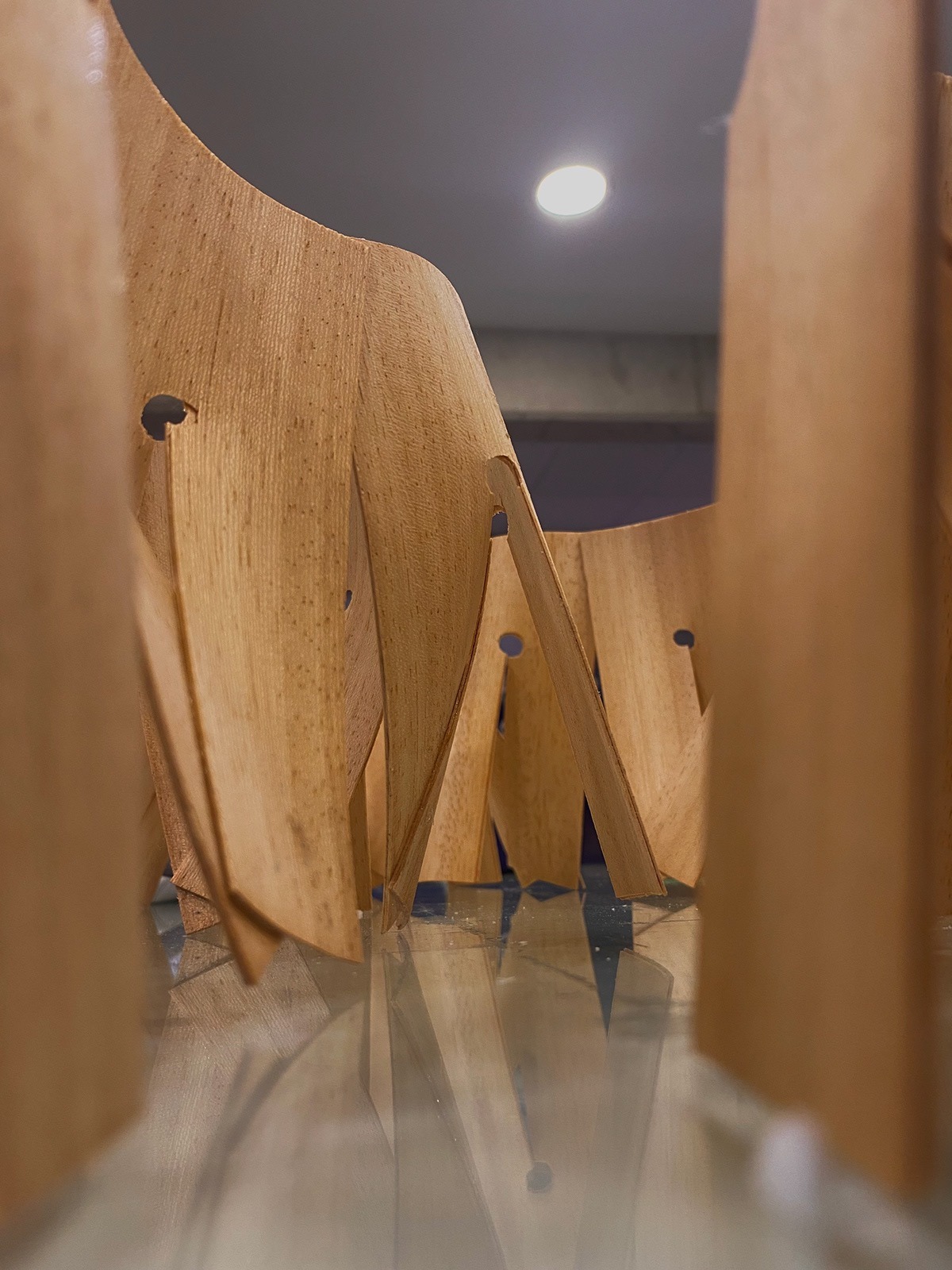 La propuesta arquitectónica del Pabellón Esquife surge desde una comprensión activa del material como generador de forma, estructura y espacio. Se trabaja con planchas de un material flexible, cuyas propiedades físicas permiten transformar una superficie plana en un módulo tridimensional autoportante. Esta lógica material no solo define la apariencia del pabellón, sino también su sistema constructivo y su experiencia espacial. El comportamiento del material, observado en distintas escalas, determina los límites del pliegue, el ritmo de repetición y la forma en que cada unidad se conecta con la siguiente. El material deja de ser un medio neutro y se convierte en agente activo del diseño, determinando tanto el modo de montaje como las condiciones de habitabilidad. Así, la arquitectura no se impone sobre la materia, sino que emerge de su resistencia, su flexibilidad y su capacidad de adaptarse al gesto humano que la transforma.