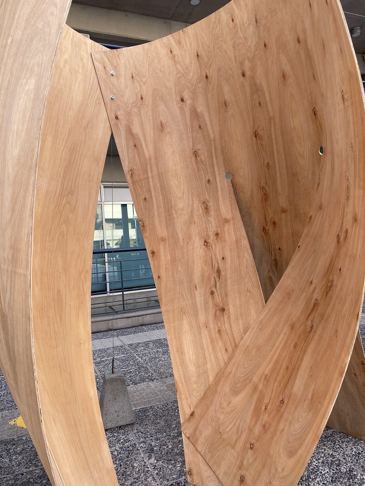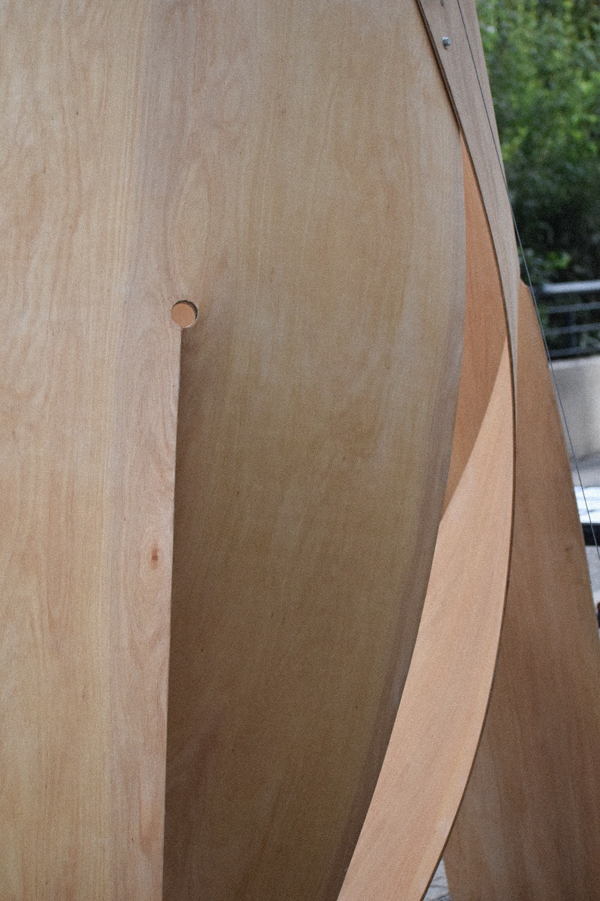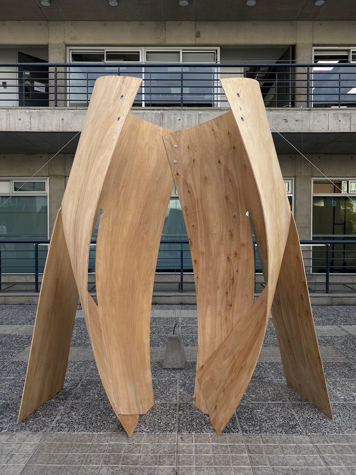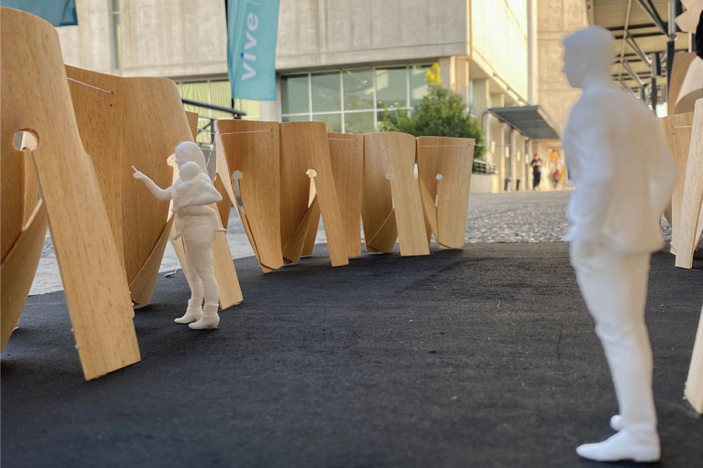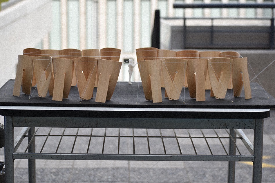 El Pabellón Esquife se configura como una estructura ligera y continua, compuesta por módulos curvos que, al repetirse, conforman una superficie ondulante y permeable. Cada módulo, incorpora cortes laterales que permiten su curvatura y autoestabilidad, dando lugar a una arquitectura que define límites sin cerrarlos, generando espacios de transición entre interior y exterior. La forma resultante sugiere un recorrido fluido, en el que el visitante se desplaza entre pliegues, sombras y aperturas. El conjunto actúa como antesala del museo cercano, ofreciendo un espacio de exposición abierto, adaptable y sensorial. Si bien la forma emerge de una lógica constructiva rigurosa basada en la repetición, su expresión final transmite ligereza y movimiento. El trabajo con matrices permitió definir las reglas de doblado y montaje, mientras que el paso a escala real evidenció tensiones materiales y estructurales que fueron resueltas desde la experiencia directa con el material, consolidando así una arquitectura precisa, reactiva y envolvente.