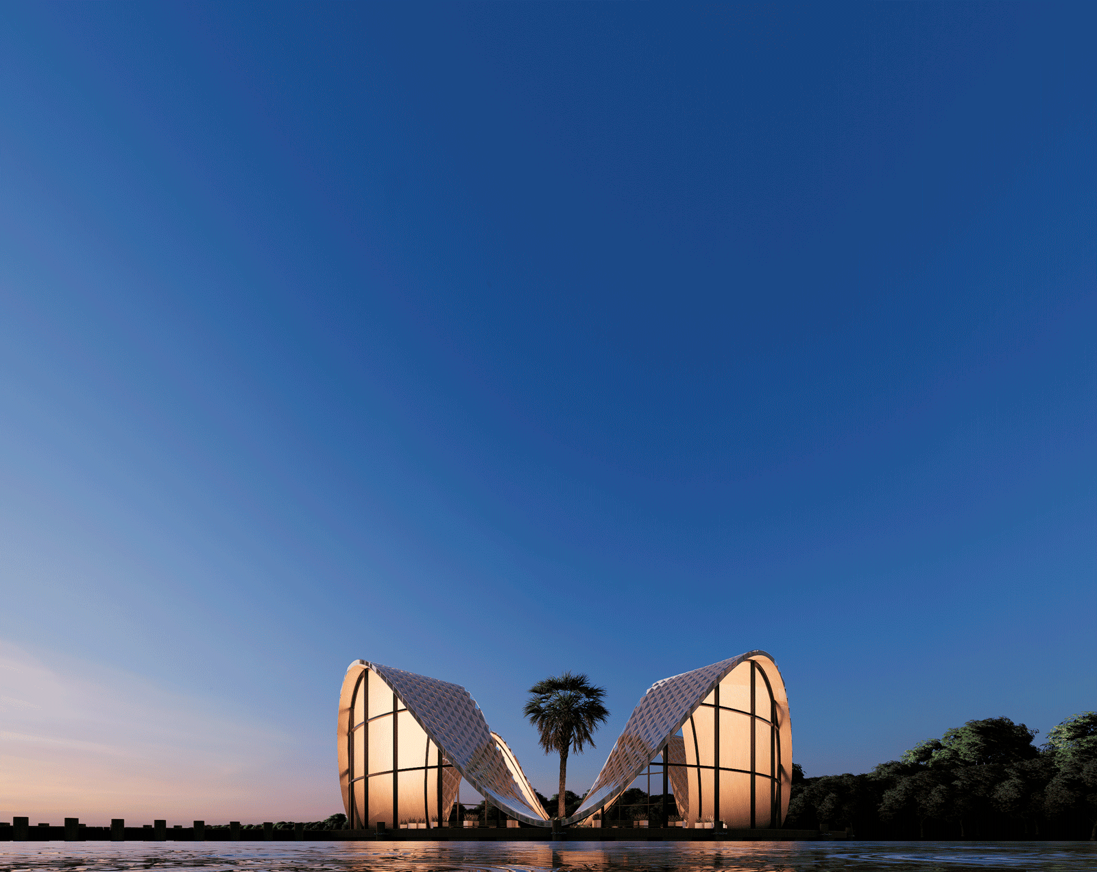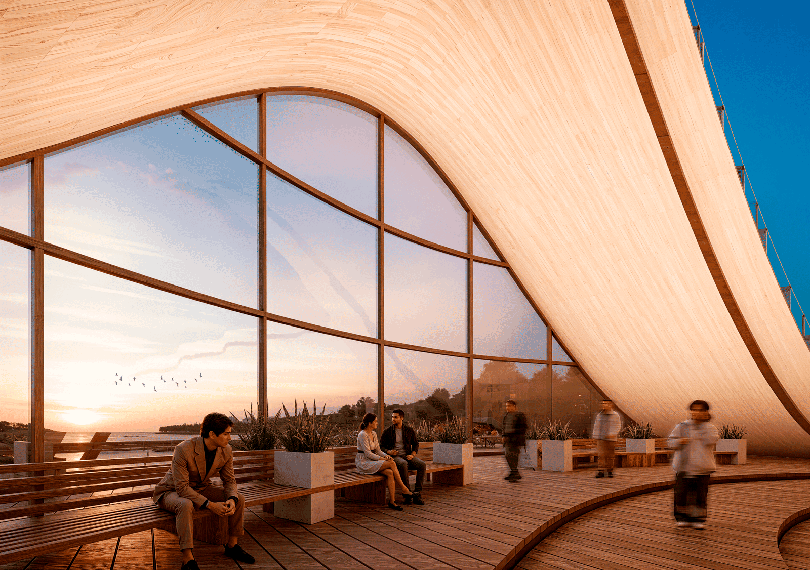 Su forma orgánica, inspirada en la flor de loto, no solo evoca renacimiento, sino que se fusiona con el paisaje sin imponerse. Está construido completamente en madera, con vigas curvas autoportantes que crean un espacio abierto, cálido y fluido. Montantes de acero brindan estabilidad y soporte a ventanales de vidrio que conectan visualmente con el entorno. Una cubierta de policarbonato translúcido protege la estructura y baña el interior con luz natural.