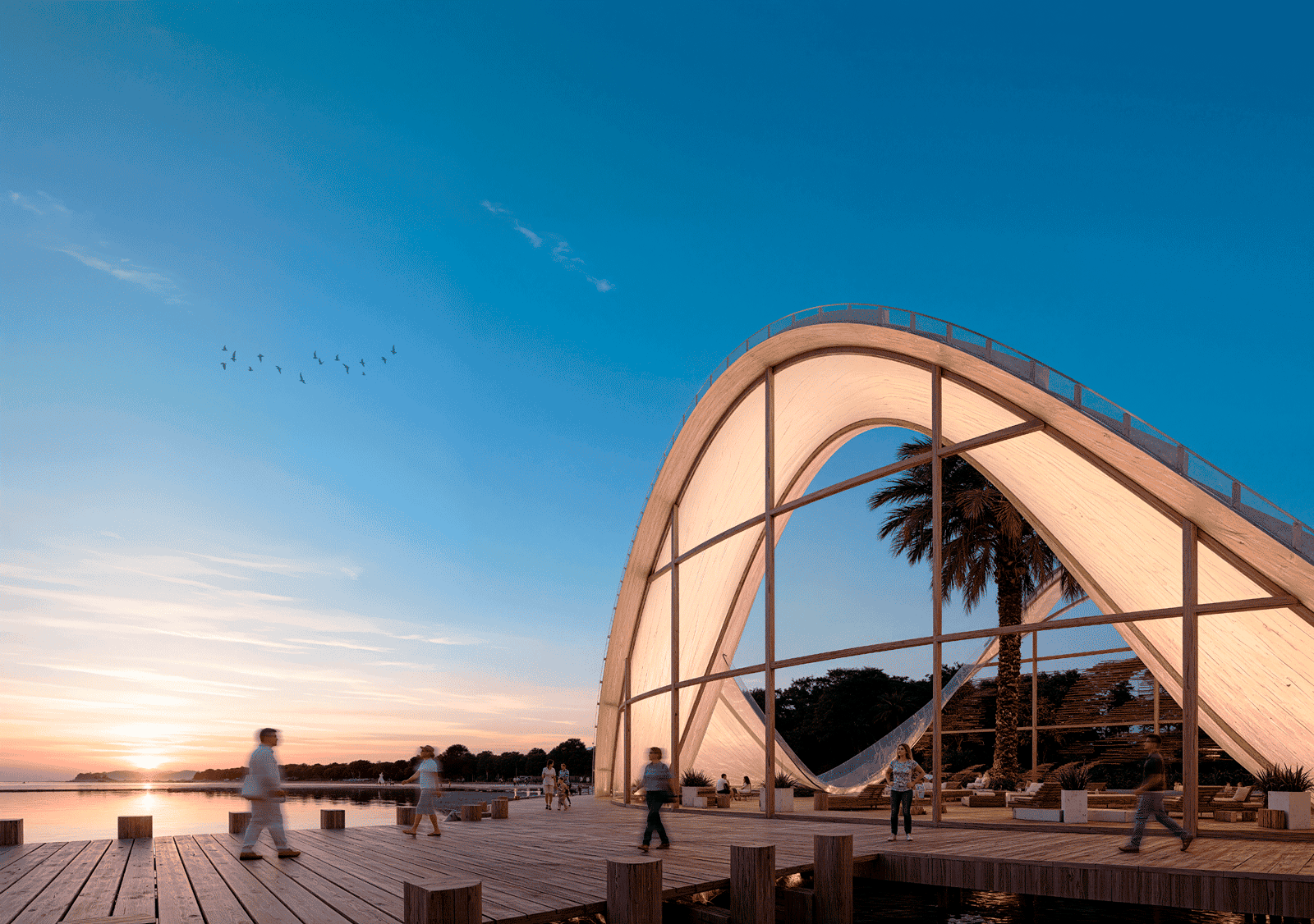 Ubicado en un tramo subutilizado del Malecón del Salado, el pabellón propone recuperar el vínculo entre las personas y el paisaje. Su lenguaje formal —curvo, orgánico, liviano— responde a la lógica del entorno: agua, vegetación y fluidez.