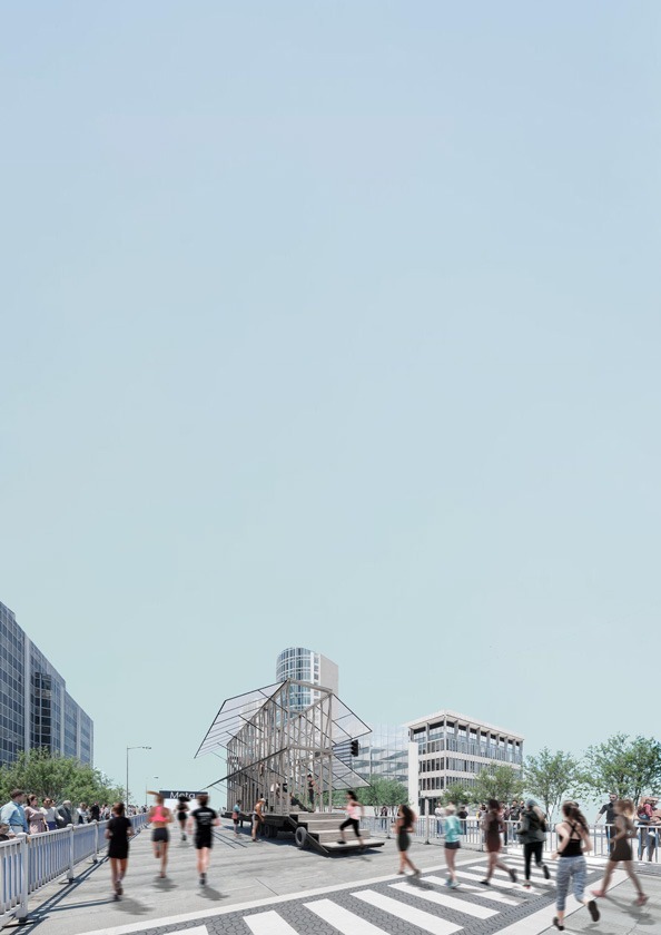 Inspirado en los carros alegóricos, se instala temporalmente en puntos estratégicos, brindando sombra, descanso, hidratación y orientación a los usuarios. Así, el proyecto redefine lo efímero como una solución continua, eficiente y sensible para mejorar la experiencia colectiva en eventos.
