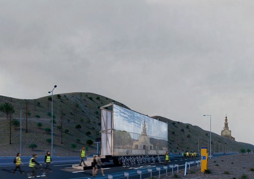 Intencionalmente no cuenta con un emplazamiento fijo, debido a que ha sido diseñado para trasladarse y operar donde sea requerido, adaptándose a distintos contextos urbanos y rurales. Su carácter móvil y modular le permite instalarse temporalmente en puntos estratégicos de alta concentración de personas, como rutas de peregrinación, maratones, conciertos o procesiones, ofreciendo descanso, sombra, hidratación y orientación. Montado sobre un chasis de 3 ejes homologado para circular por rutas nacionales, el pabellón se traslada sin necesidad de ser desmontado, garantizando eficiencia logística y rápida activación. Su despliegue espacial acompaña el recorrido de los usuarios sin interrumpir el flujo natural del evento, integrándose al entorno con una arquitectura abierta, liviana y adaptable. Esta estrategia nómada y flexible permite responder a necesidades puntuales en distintos territorios, asegurando una intervención eficaz, inclusiva y replicable que transforma lo efímero en una oportunidad de cuidado y encuentro colectivo.