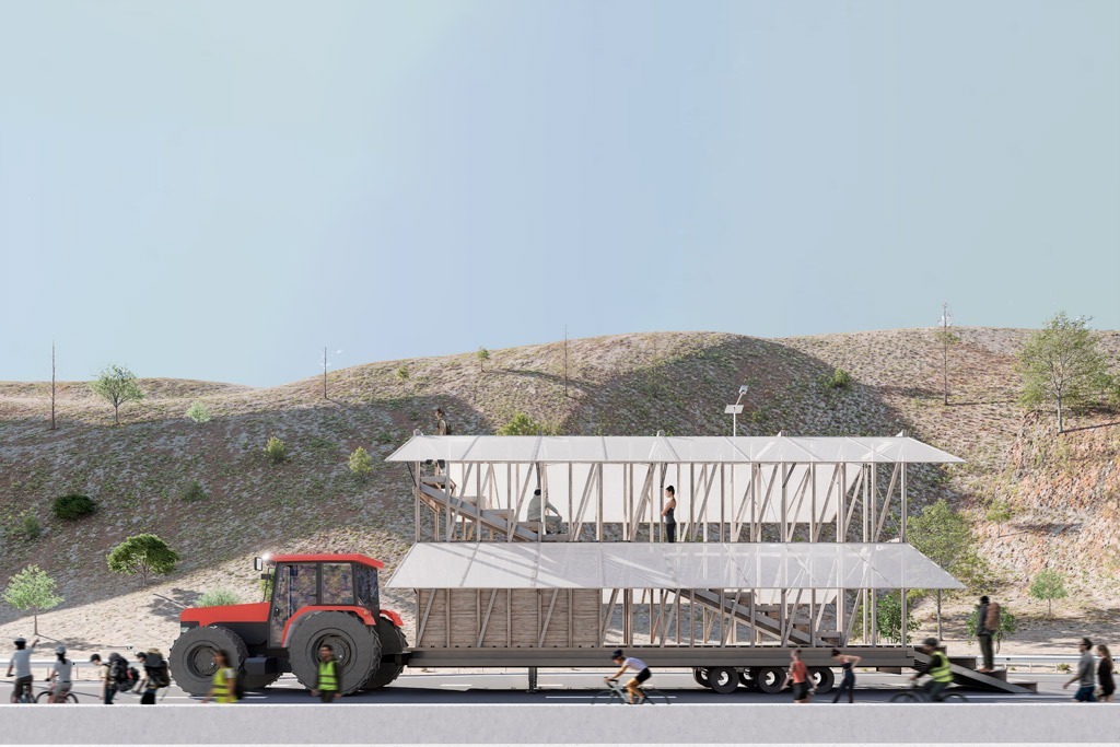 El pabellón se transporta sobre un chasis de 3 ejes, adaptándose a múltiples contextos sin necesidad de desmontaje. Su sistema modular, construido en madera y acero, junto con una cubierta de lona microperforada, que asegura resistencia, confort y sustentabilidad.