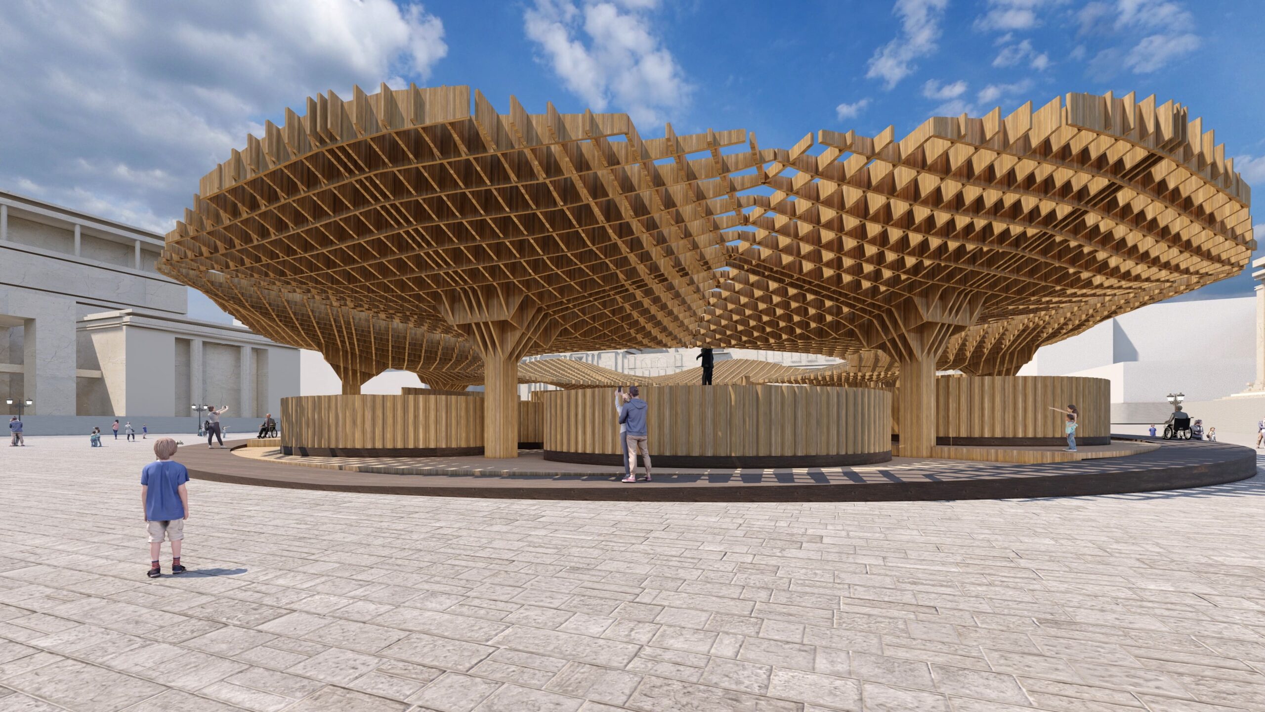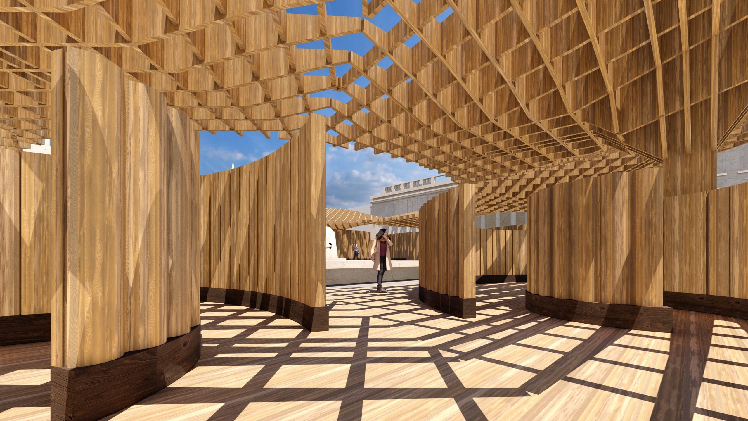 El proyecto plantea un pabellón de arquitectura efímera en madera, concebido como una estructura itinerante capaz de reactivar el espacio público desde una experiencia simbólica vinculada al paisaje, la memoria y el cuerpo. Su instalación inicial se proyecta en la Plaza de Bolívar de Bogotá, un lugar de alto tránsito urbano que, en el pasado, fue territorio sagrado y punto de asentamientos indígenas. A través de una geometría helicoidal inspirada en los pectorales en espiral, la propuesta configura un recorrido que invita a la contemplación. La reinterpretación en las formas y sus recorridos transmiten una sensación de continuidad histórica. Su carácter temporal, facilita la reubicación en distintos contextos urbanos debido a la utilización de sistemas de construcción modular, que permiten un fácil montaje y desmontaje del mismo, teniendo como intención llevar un fragmento de la cultura y el pasado a cada rincón del país a través del pabellón.