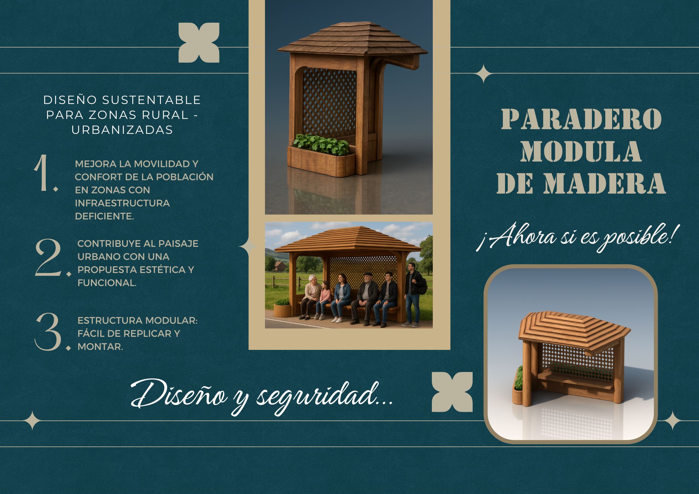 Este proyecto consiste en el diseño de un paradero modular construido principalmente en madera, pensado para zonas en proceso de urbanización, donde la infraestructura pública es escasa o nula. La propuesta responde a una necesidad real: ofrecer un espacio seguro, funcional y digno para usuarios del transporte público en entornos rural-urbanos, a través de una solución eficiente, sustentable y de bajo costo, adaptable a distintos contextos geográficos y sociales.
