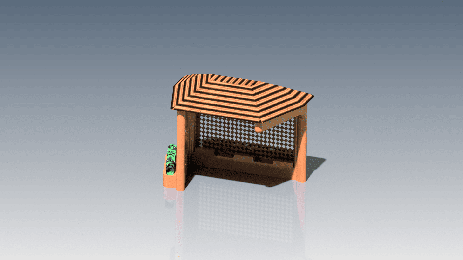 Formalmente, el diseño responde a una lógica de sencillez y funcionalidad. La estructura está compuesta por pilares y vigas principales que soportan una cubierta inclinada, generando sombra y protección frente a la lluvia. Los laterales pueden cerrarse parcialmente según el clima local. El banco integrado, la señalética y la posibilidad de incorporar iluminación solar complementan la propuesta. El sistema modular permite producir los elementos en talleres locales y luego ensamblarlos en terreno con herramientas básicas, lo que reduce costos logísticos y tiempos de instalación.