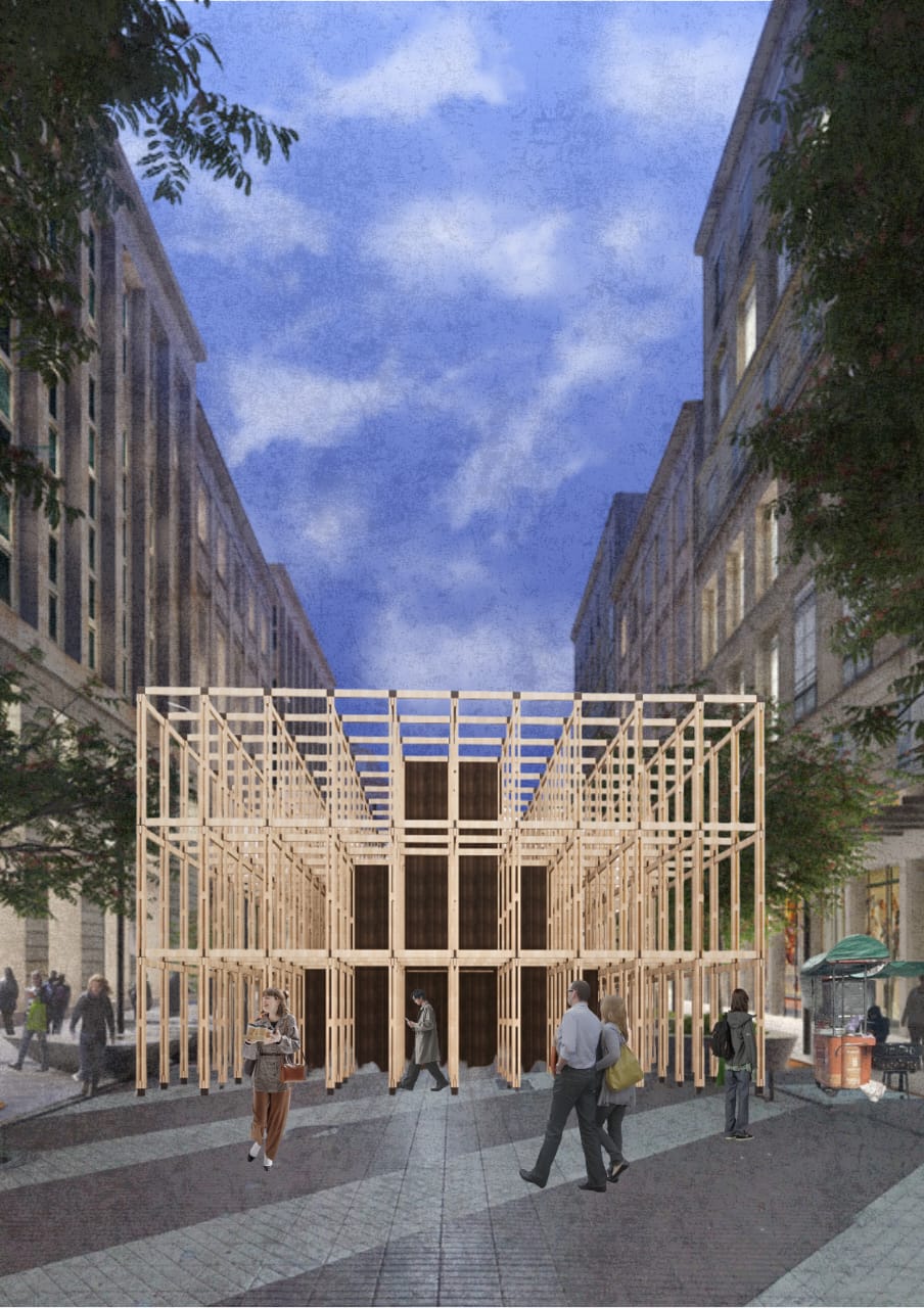 La propuesta arquitectónica se desarrolla íntegramente en torno a la madera, destacando su potencial estructural, expresivo y sostenible dentro del contexto de la arquitectura efímera. Se emplean paneles de CLT como elemento principal, permitiendo crear un volumen interior compacto, resistente y fácil de montar. La grilla exterior se construye con piezas modulares de madera laminada, generando un lenguaje visual coherente y una estructura liviana y replicable. La elección de la madera no solo responde a criterios técnicos y de sustentabilidad, sino que también aporta calidez y una atmósfera acogedora en contraste con el entorno urbano duro. Esta materialidad refuerza el carácter temporal, desmontable y sensorial del proyecto.