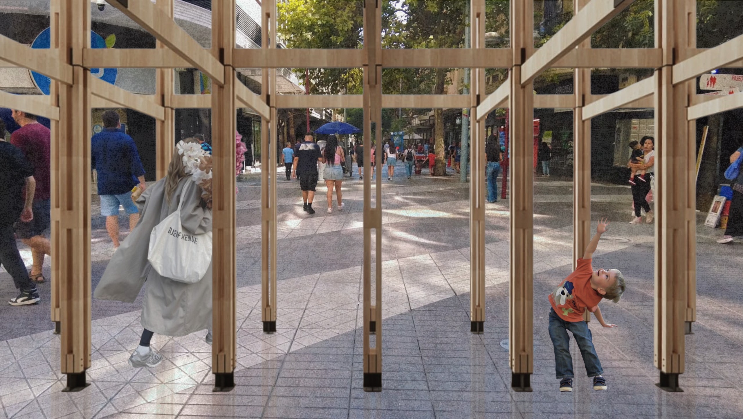 El Paseo Inmersivo es un proyecto urbano ubicado en el Paseo Ahumada, que busca ofrecer una pausa contemplativa en medio del ajetreo del centro de Santiago. A través de una estructura de doble experiencia, combina un exterior abierto con espacios de tránsito y descanso, y un interior cerrado destinado a experiencias inmersivas digitales. Su diseño en base a paneles de CLT permite generar un vacío vertical introspectivo, desconectando al usuario del entorno urbano. La propuesta invita a reflexionar, habitar y recorrer la ciudad desde una nueva perspectiva sensorial. Es un lugar donde el arte, la arquitectura y el ritmo urbano se entrelazan.