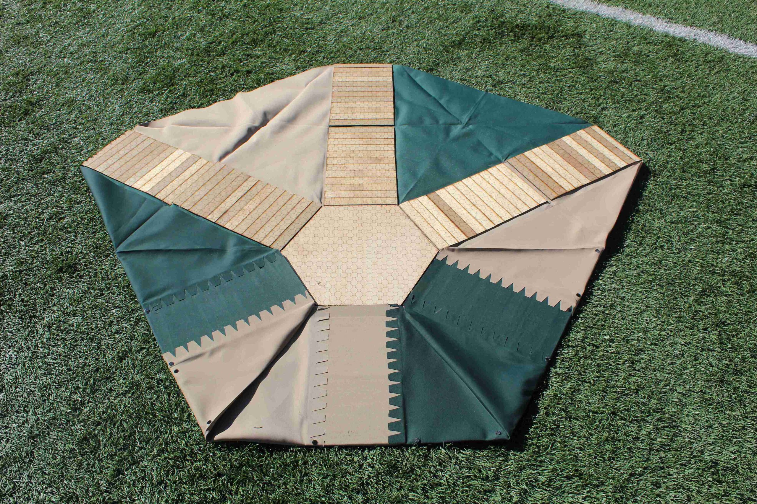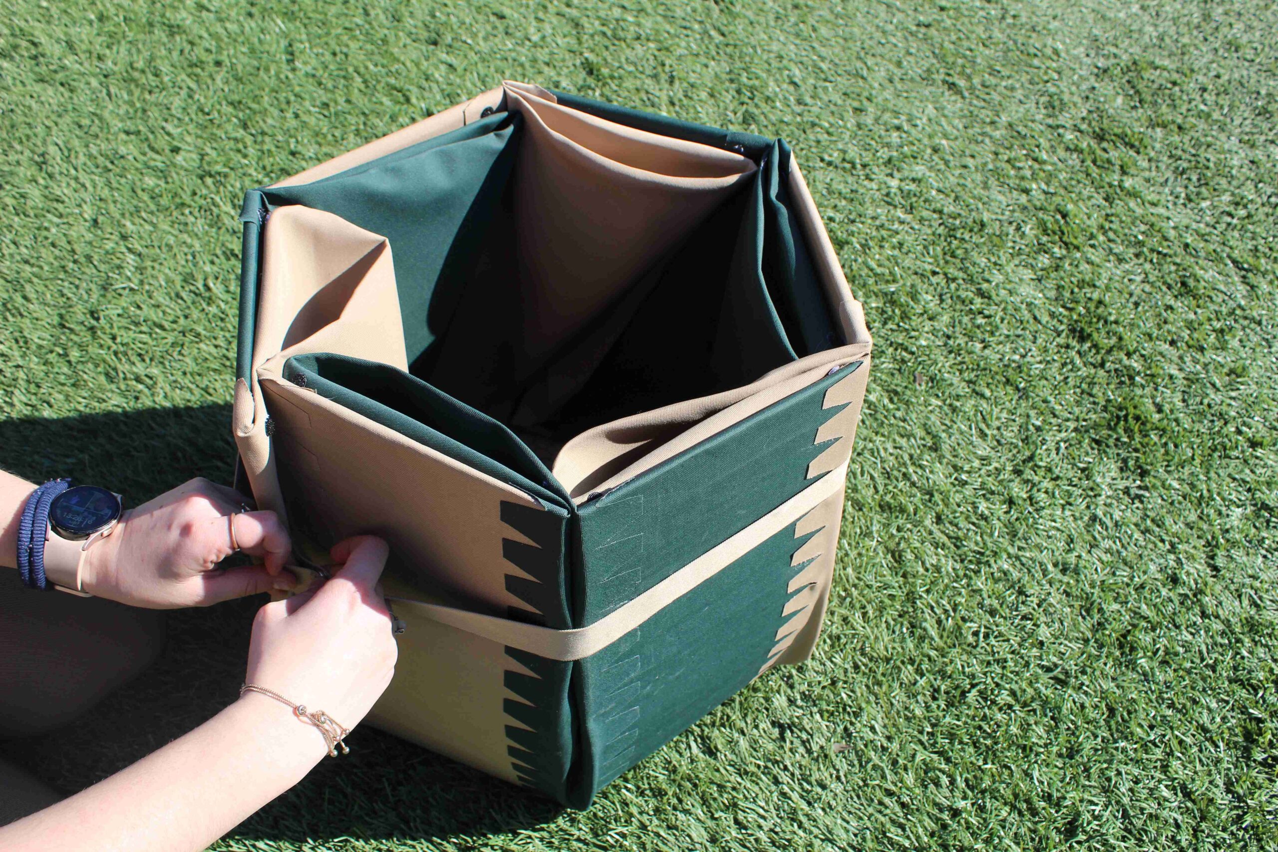 Picniké funciona mediante un sistema de plegado basado en principios similares al origami. Cada módulo se pliega de manera precisa hacia el centro, una cinta envolvente y velcros localizados estratégicamente para que evitar que se desarme. Sobre la superficie se puede comer, jugar, leer, descansar o simplemente disfrutar al aire libre. La loneta impermeable integrada en los pétalos permite una fácil limpieza y resguarda la madera del contacto directo con el suelo. En caso de daño, la estructura modular permite reemplazar piezas individuales de madera sin afectar el conjunto completo, favoreciendo la durabilidad y reparación.