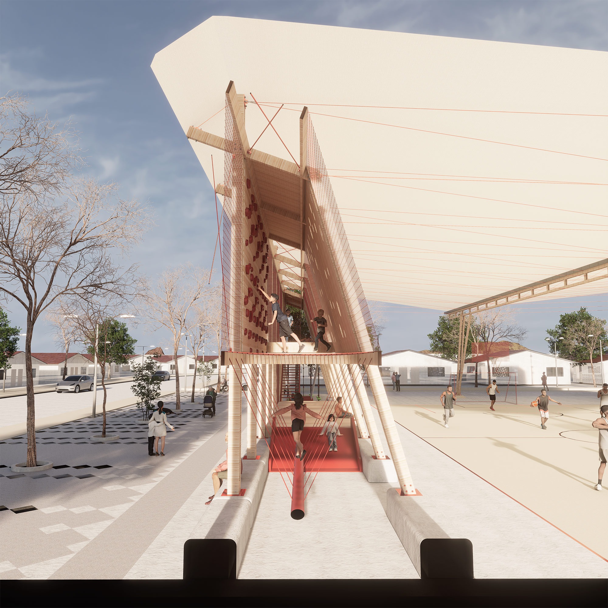 PROGRAMA EFÍMERO La propuesta contempla tres escalas programáticas: Cotidiano: Actividades deportivas y recreativas para la infancia, fomentando el encuentro diario y el desarrollo cognitivo. Eventual: Actividades culturales y ferias que promueven la activación social y la expresión artística. Ocasional: En caso de emergencia el espacio se transforma en un refugio o centro de apoyo ante situaciones imprevistas. Esta flexibilidad permite que los programas se adapten y evolucionen según las demandas y contingencias del territorio. ESPACIO PREEXISTENTE REPLICABLE La cancha se reconoce como un espacio base ya existente y replicable en distintos contextos de Chile, gracias a su carácter público y versátil. ESTRUCTURA POLIVALENTE Se propone una estructura modular adaptable a múltiples usos, permitiendo la convivencia programática en un único sistema arquitectónico. COBERTURA Una tensoestructura ligera y flexible cubre el espacio, mejora el confort ambiental y complementa la distribución de cargas de la estructura polivalente, considerando las actividades sísmicas en Chile.