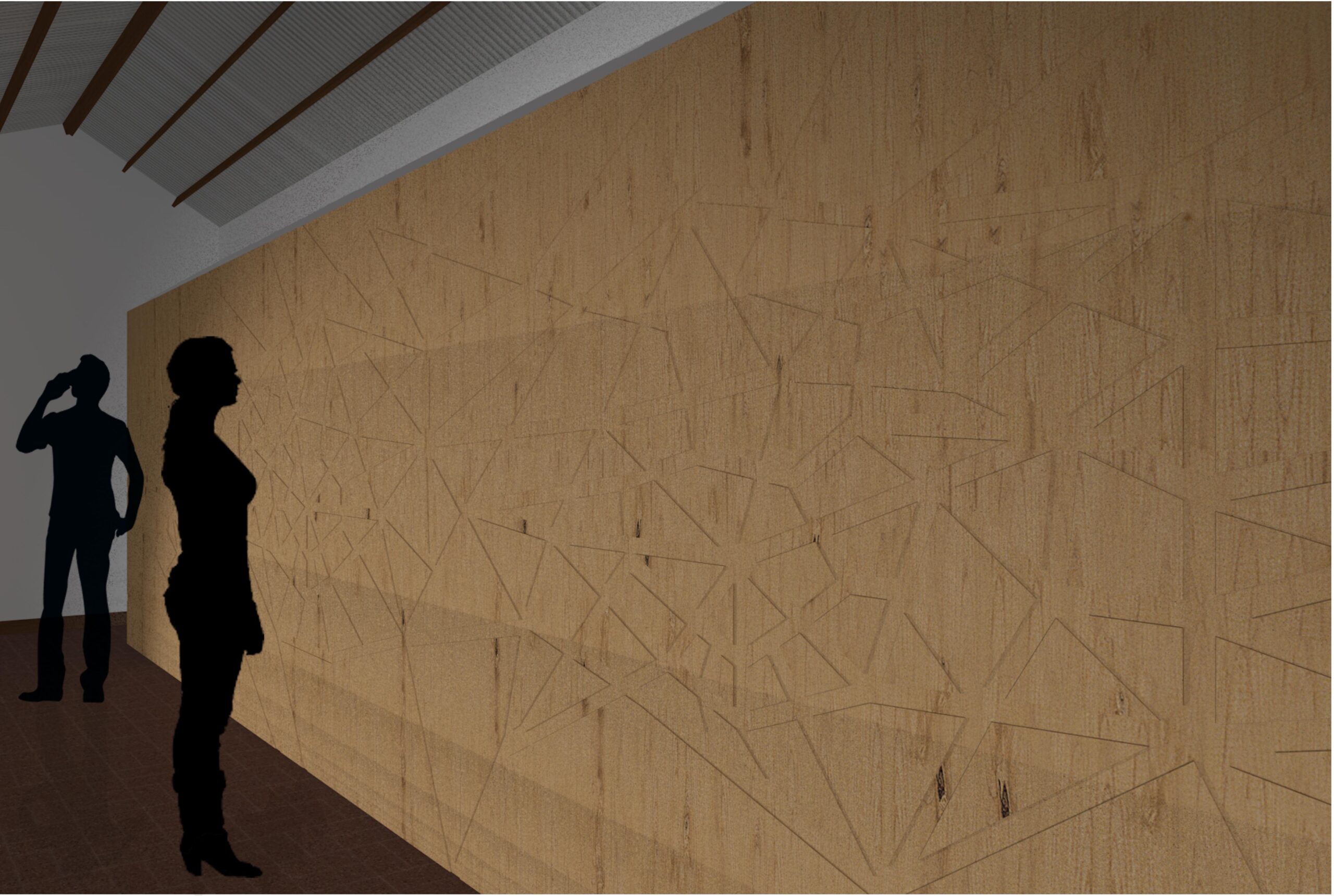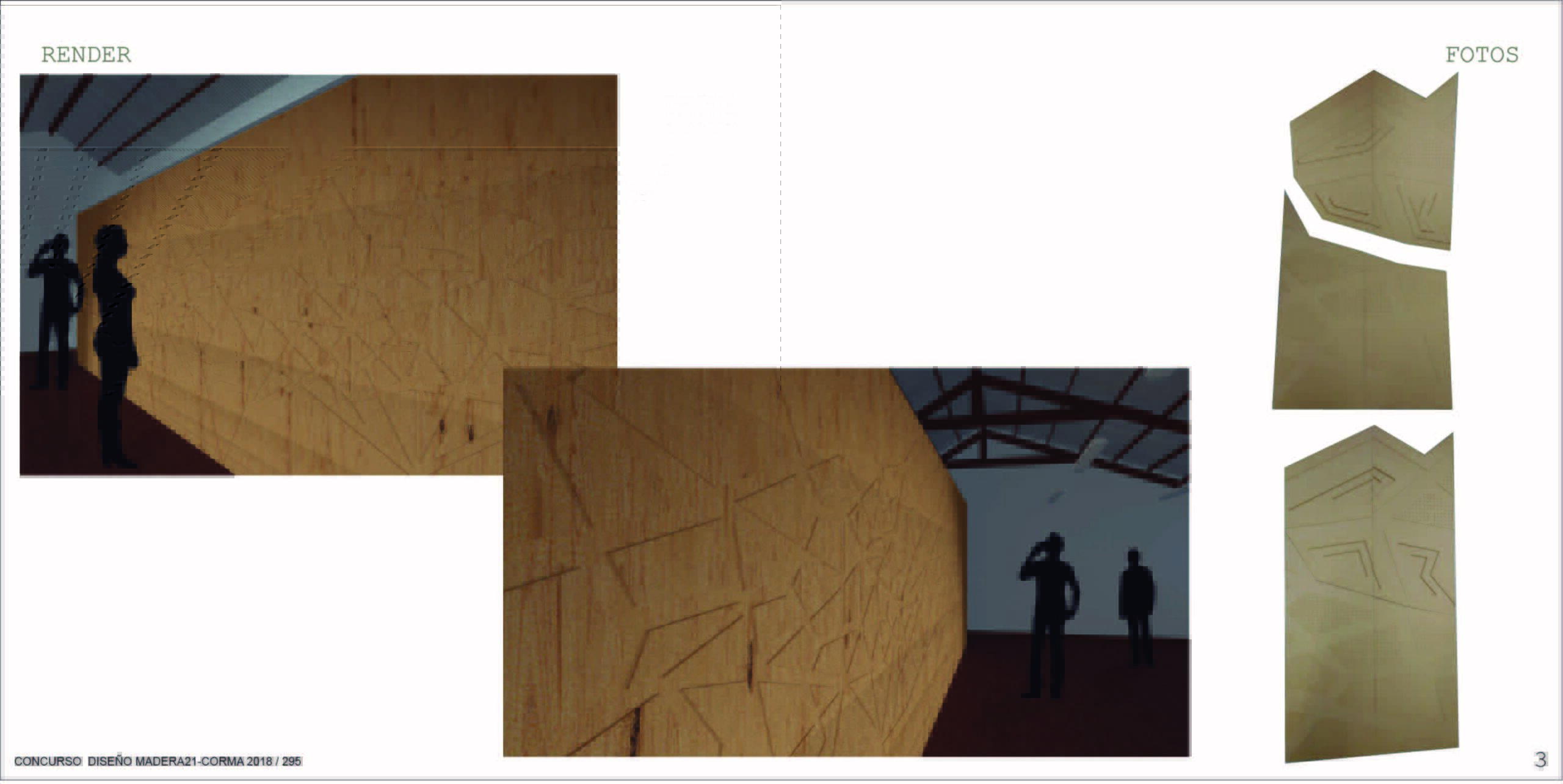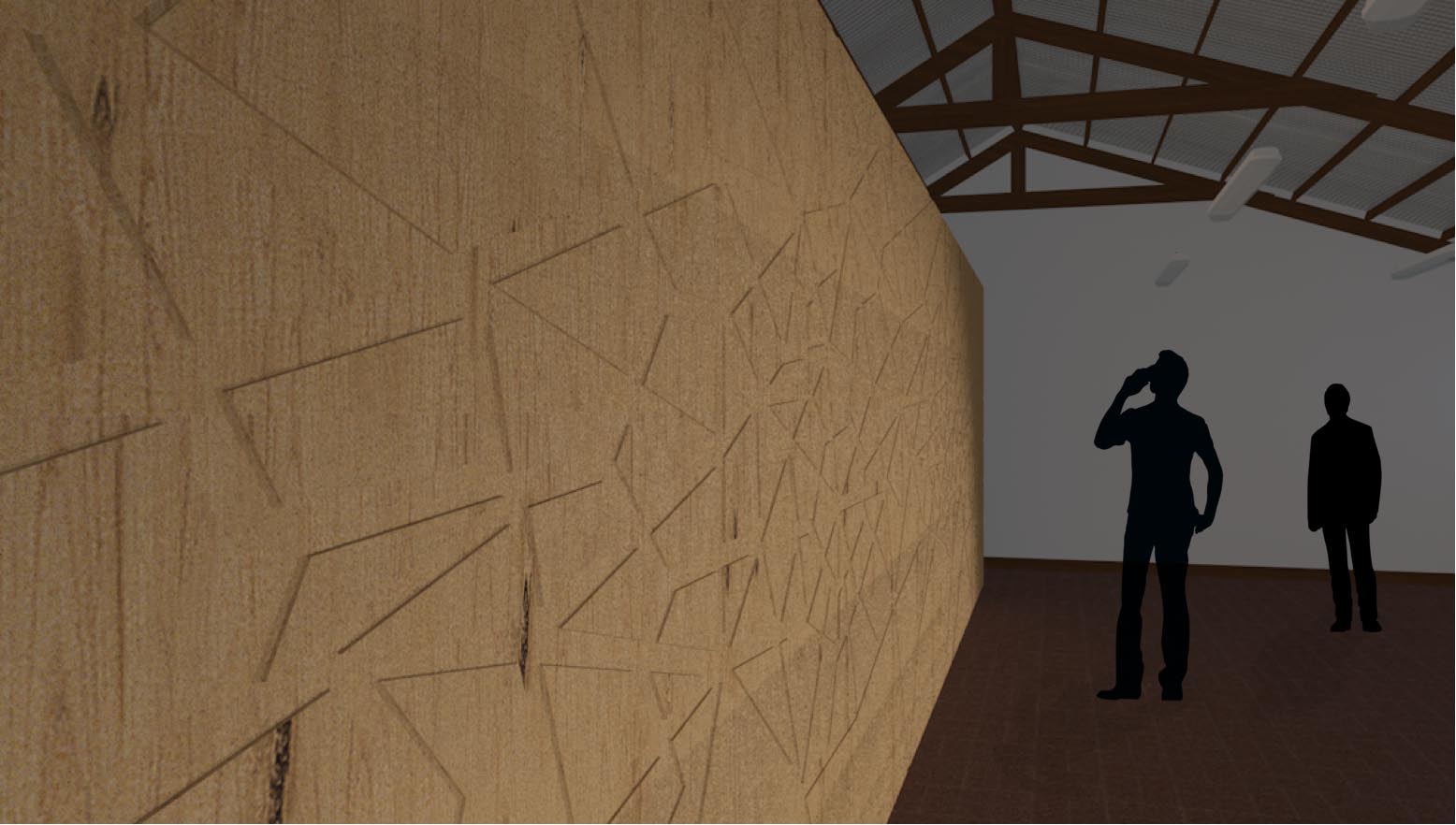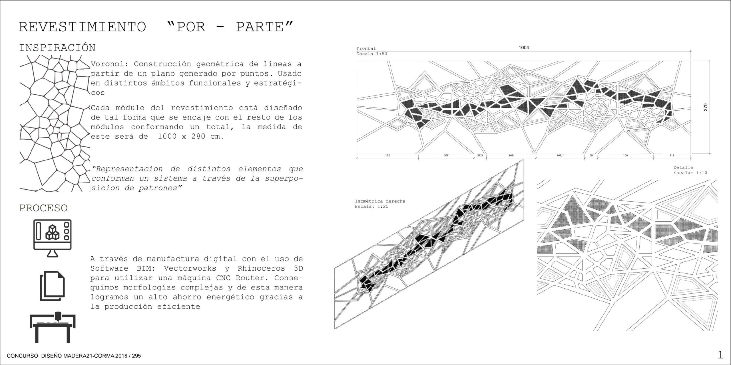 Desarrollo de un revestimiento de madera para el concurso Madera 21 de CORMA (Corporación Chilena de la Madera), desarrollado a través de tecnologías digitales, software BIM y máquina CNC Router, que permite experimentar con esta materia prima logrando formas complejas en un corto plazo de tiempo. La forma que escogimos fue el patrón Voronoi, que nos permite crear diversas formas a partir de las intersecciones de polígonos en un plano bidimensional. Este revestimiento de madera será montado gracias a una estructura de acero, la cual, luego de ser instalada, podrá ser extraída del lugar de manera fácil para exponer el revestimiento en otro espacio, como el usuario estime conveniente sin perder su forma inicial y sus cualidades al momento de desmontarlo.