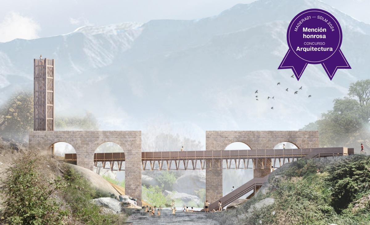 El proyecto busca revalorizar el área mediante la construcción de un puente que cruza el Estero El Manzano, poniendo en valor los vestigios de piedra del antiguo puente ferroviario. Este nuevo puente no solo facilita la conexión, sino que también resalta el valor histórico y natural del entorno. Su diseño se integra con las preexistencias, rompiendo la rigidez ortogonal con una forma diagonal que se entrelaza con los arcos de piedra. La estructura combina una subestructura ligera de módulos trapezoidales, complementada con tensores arriostrantes, vigas de madera laminada y fundaciones de hormigón. El programa incluye una escalera de acceso al estero y un mirador panorámico, promoviendo actividades recreativas como el senderismo y la observación del entorno natural.