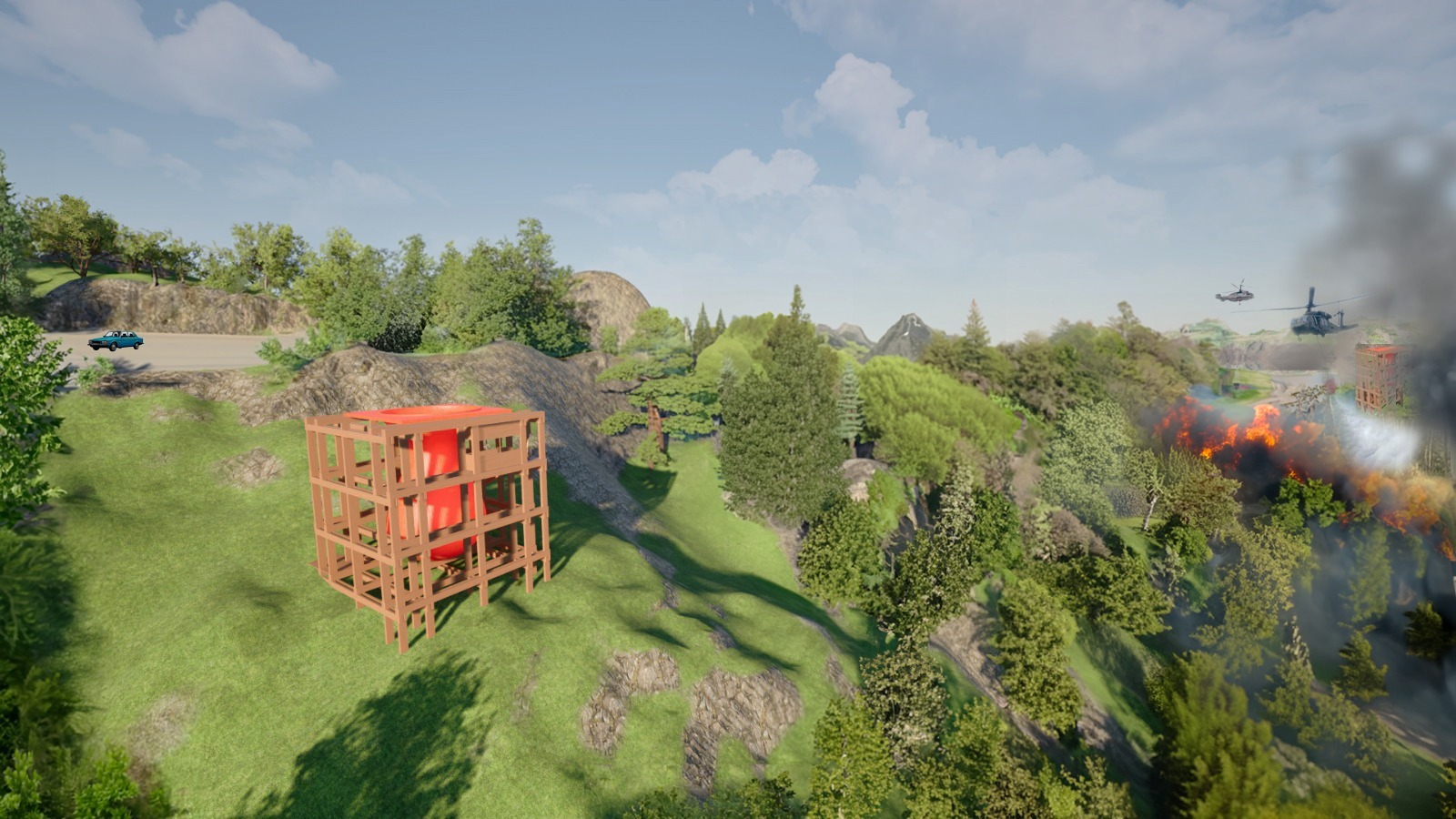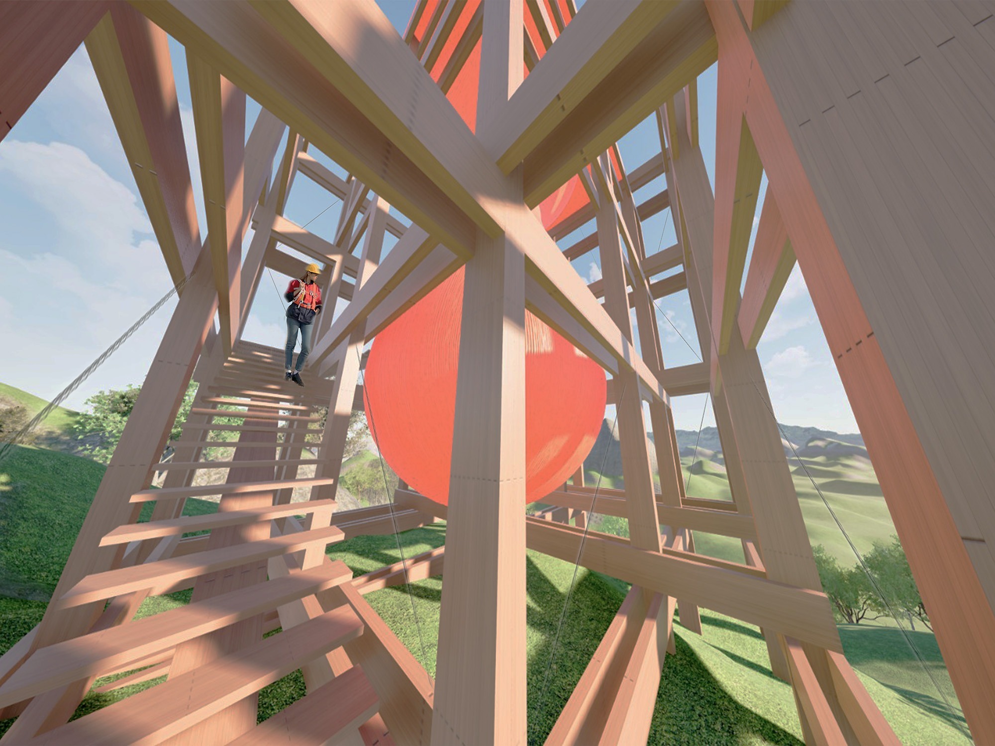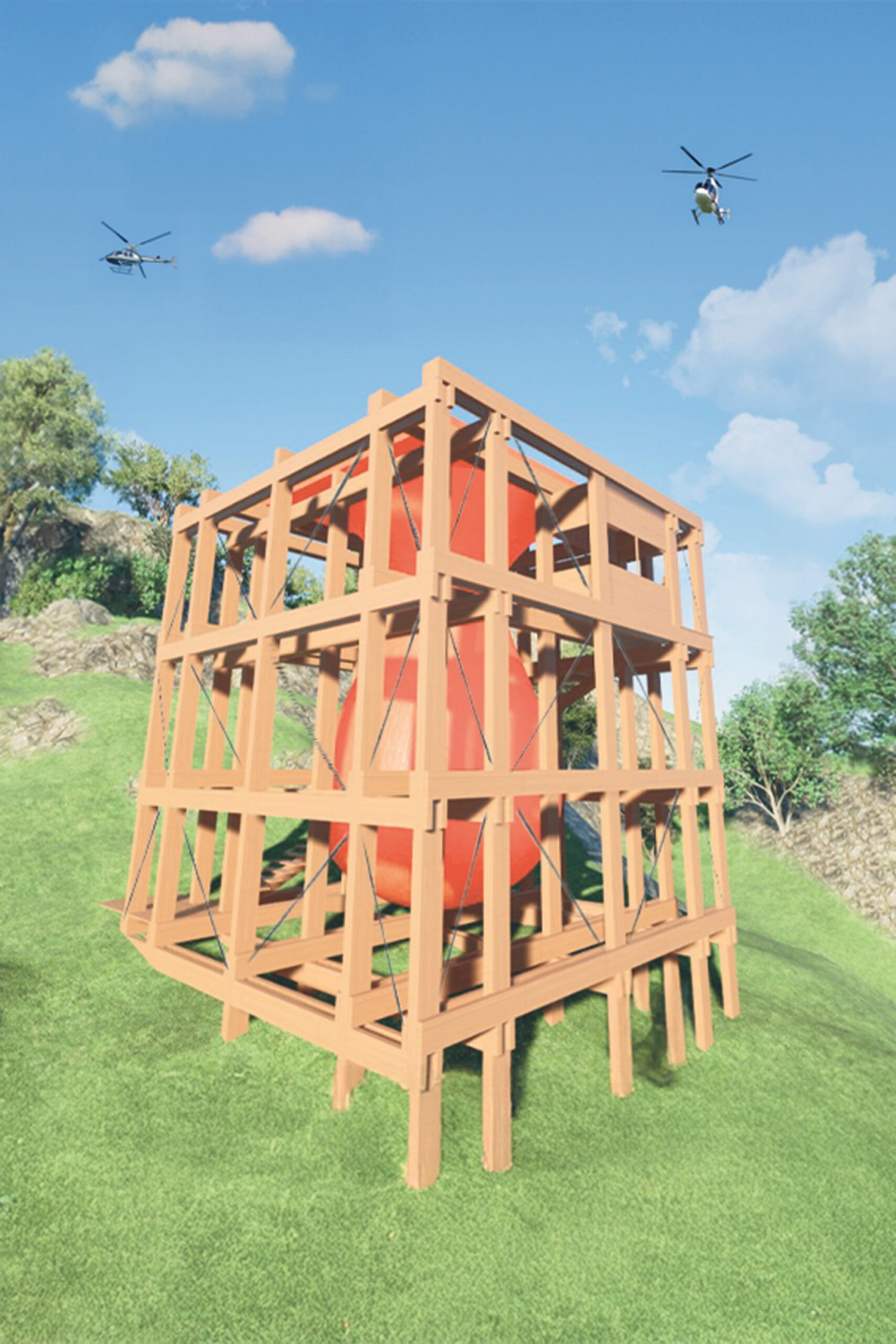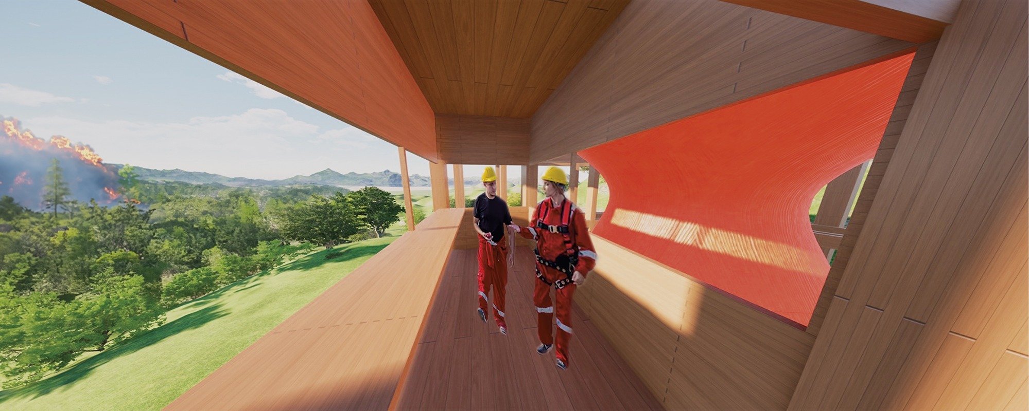La propuesta se articula a partir de una grilla estructural de madera laminada que permite el acoplamiento flexible de distintos programas, adaptándose a diversas topografías. En su núcleo se emplaza el “Copihue”, volumen central recolector de aguas lluvias, que actúa como hito visual, punto operativo y símbolo del sistema. Buscando así ayudar a los hélicopetros de emergencia.