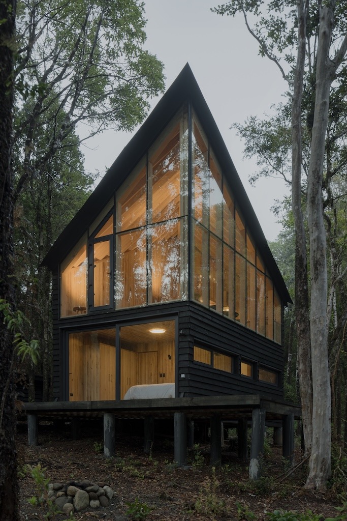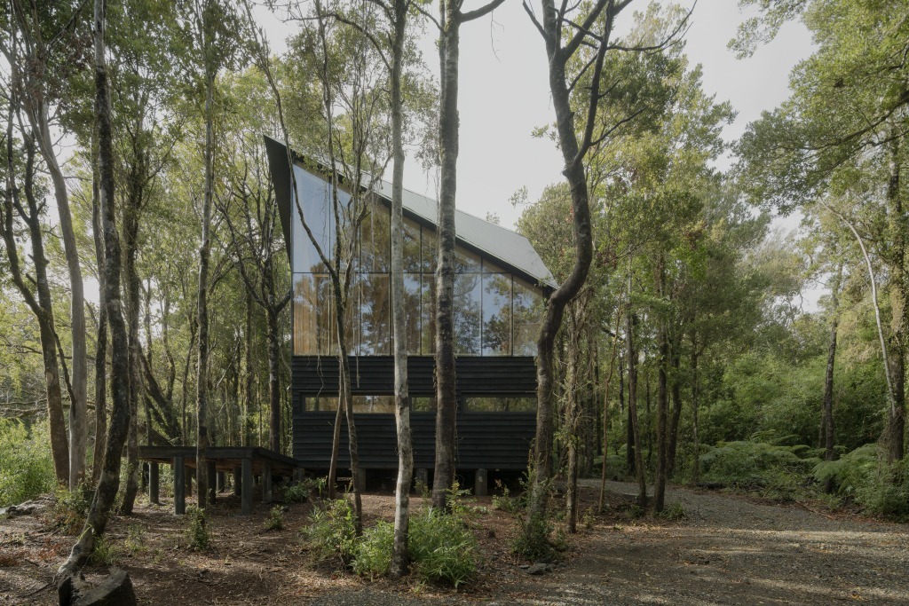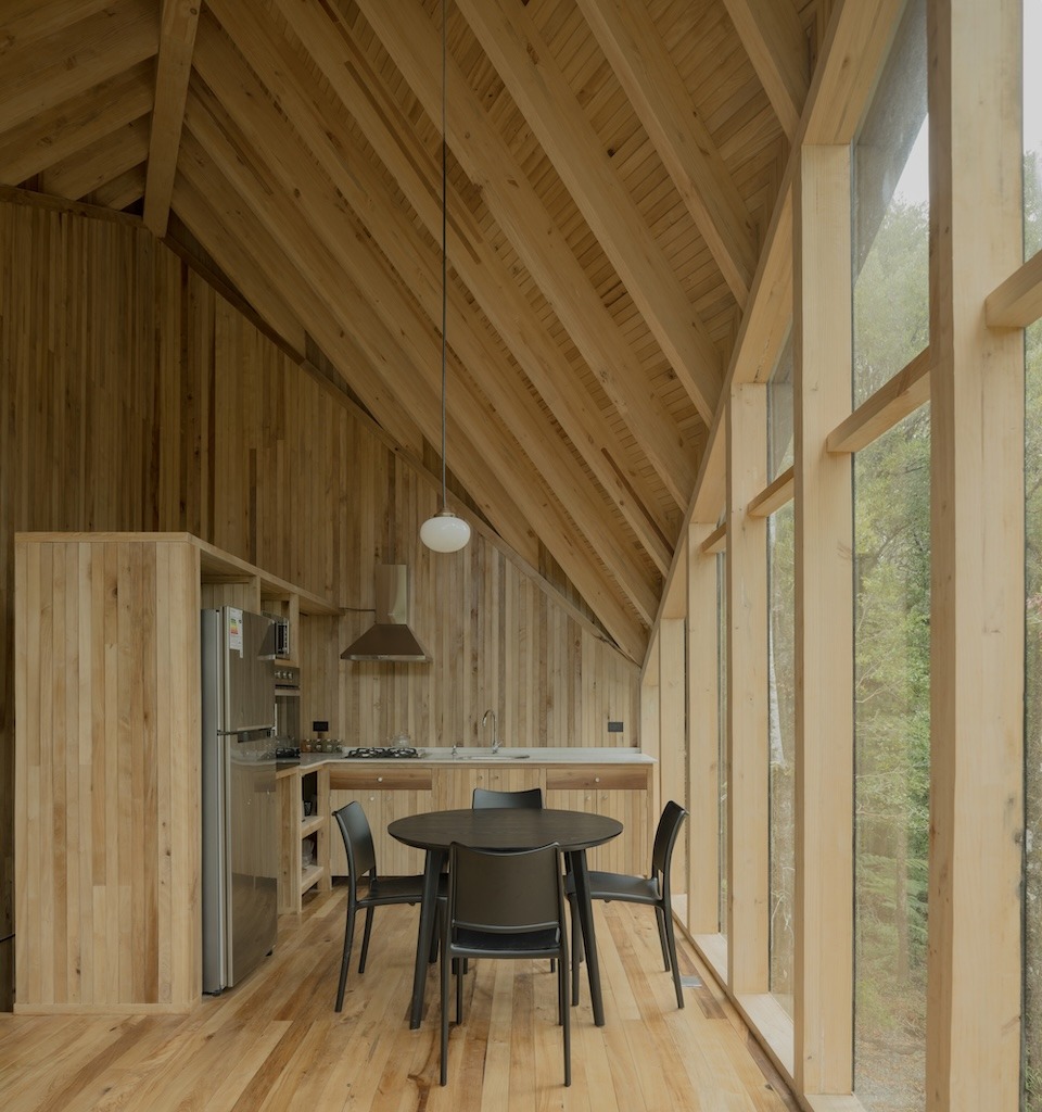 Este refugio de unos 50m2 está ubicado en los alrededores de Valdivia, en medio de la densa y húmeda selva. Se concibe como una torre angosta de dos pisos inserta entre los árboles, elevada sobre apoyos de hormigón, con 4 x 7 metros en planta y una altura de 10 metros. El primer nivel alberga dormitorios y baño; el segundo, un espacio abierto de estar y cocina enfrentado al paisaje. Es un volumen compacto y muy definido que contrasta fuertemente con el entorno. Sus interiores de laurel son acogedores y táctiles, todo pareciera ser un mueble, como sucede en las embarcaciones con sus cuadernas a la vista. La forma del techo es a dos aguas, pero con la cumbrera haciendo una diagonal sobre el volumen de la casa, a modo de espina de pescado. Sus dimensiones oscilan entre los mínimos para circular con comodidad y la escala del paisaje.
