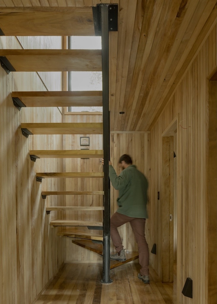 Este refugio es un buen ejemplo de prefabricación artesanal, la estructura se construyó con paneles prefabricados de 2x6” en pino aserrado que preparamos en un galpón, para reducir el tiempo en obra dado que construimos en pleno invierno. Los tabiques se llevaron a obra cerrados por ambas caras, aislados con lana mineral y forrados todos sus cantos y soleras con una membrana de absorción acústica. La estructura de madera laminada del segundo piso se cortó completamente en terreno, logrando la compleja geometría de la cubierta y sosteniendo a su vez el muro cortina que da hacia el norte. No calculé la estructura, la sobredimensioné usando la repetición de elementos que conlleva la estructuración en base a tabiques prefabricados. Todos los revestimientos de pisos, muros y los muebles son de laurel de la zona, que se integraron completamente a la arquitectura.