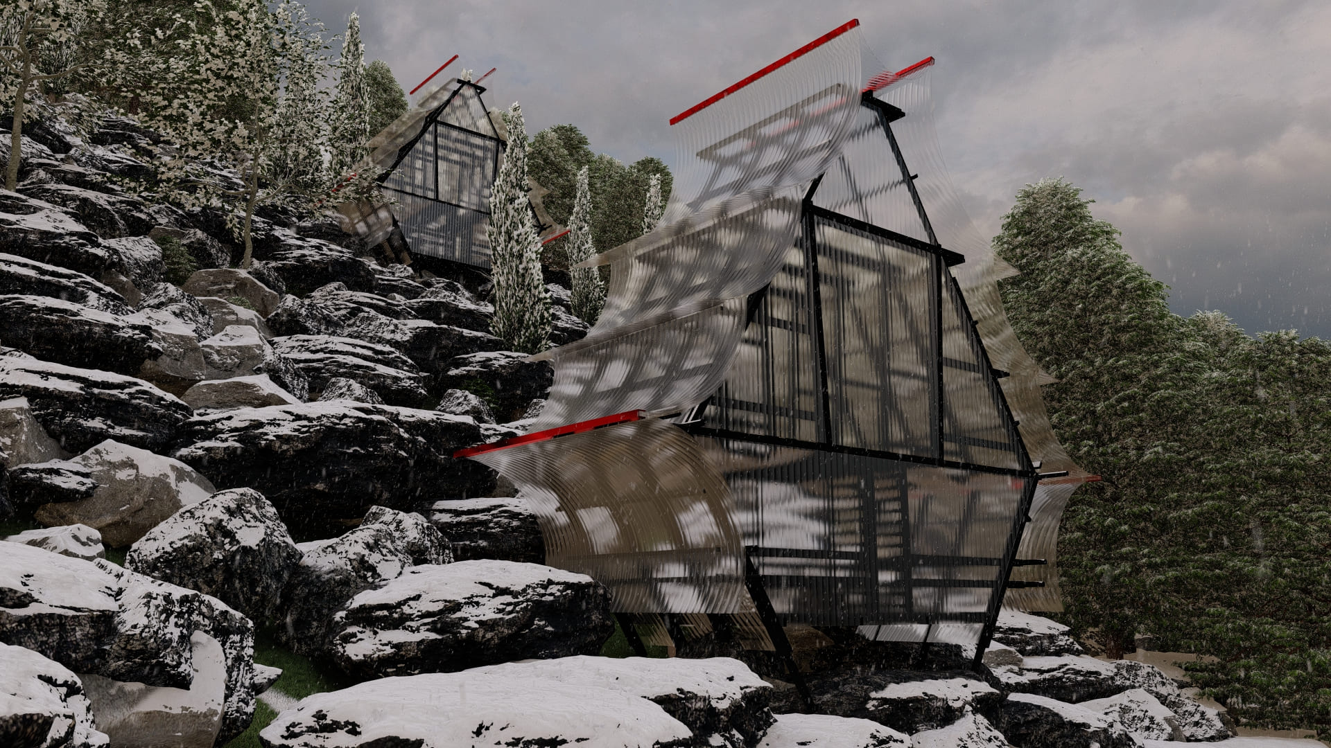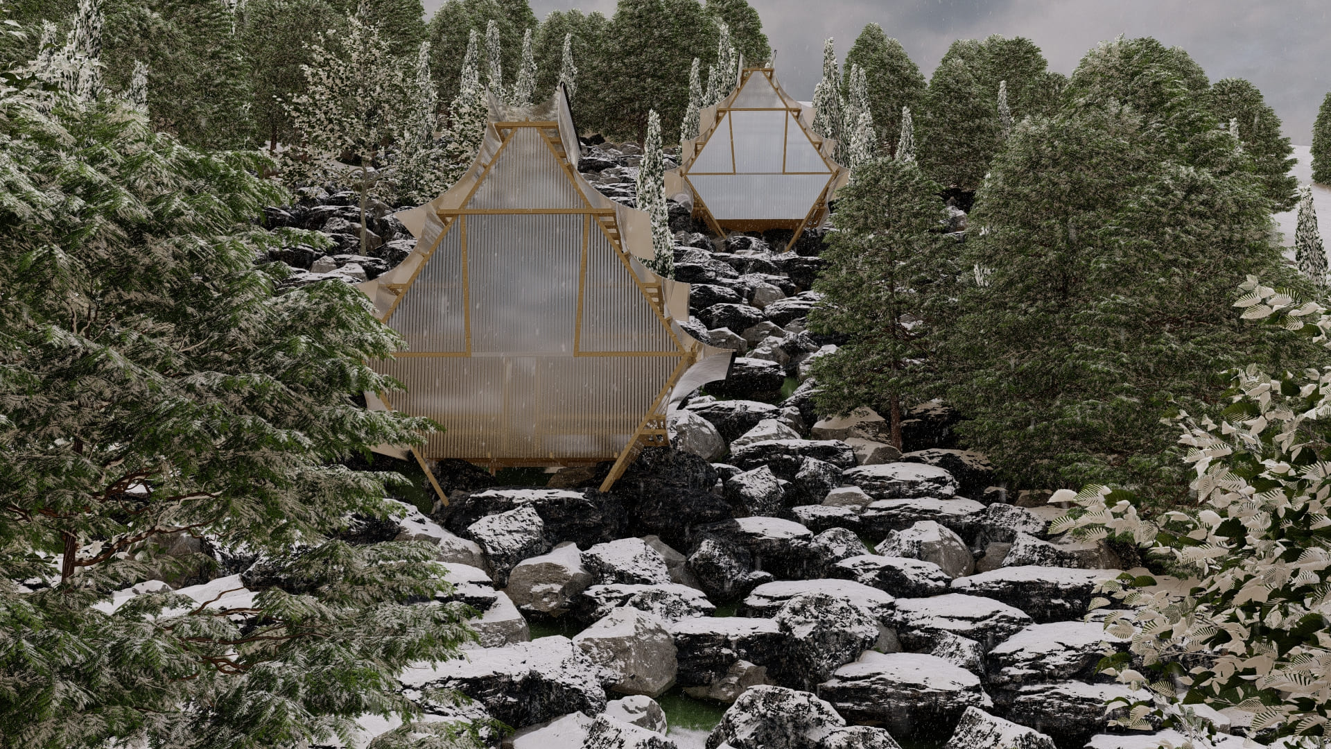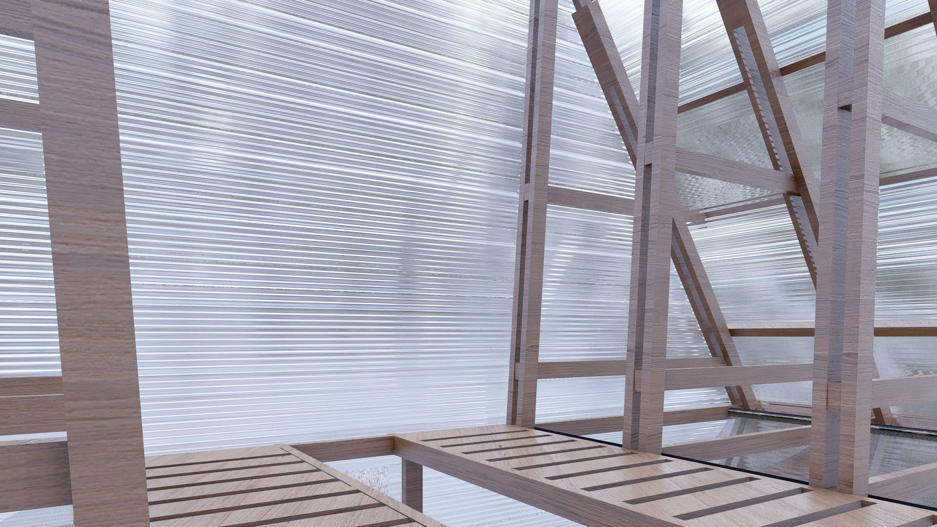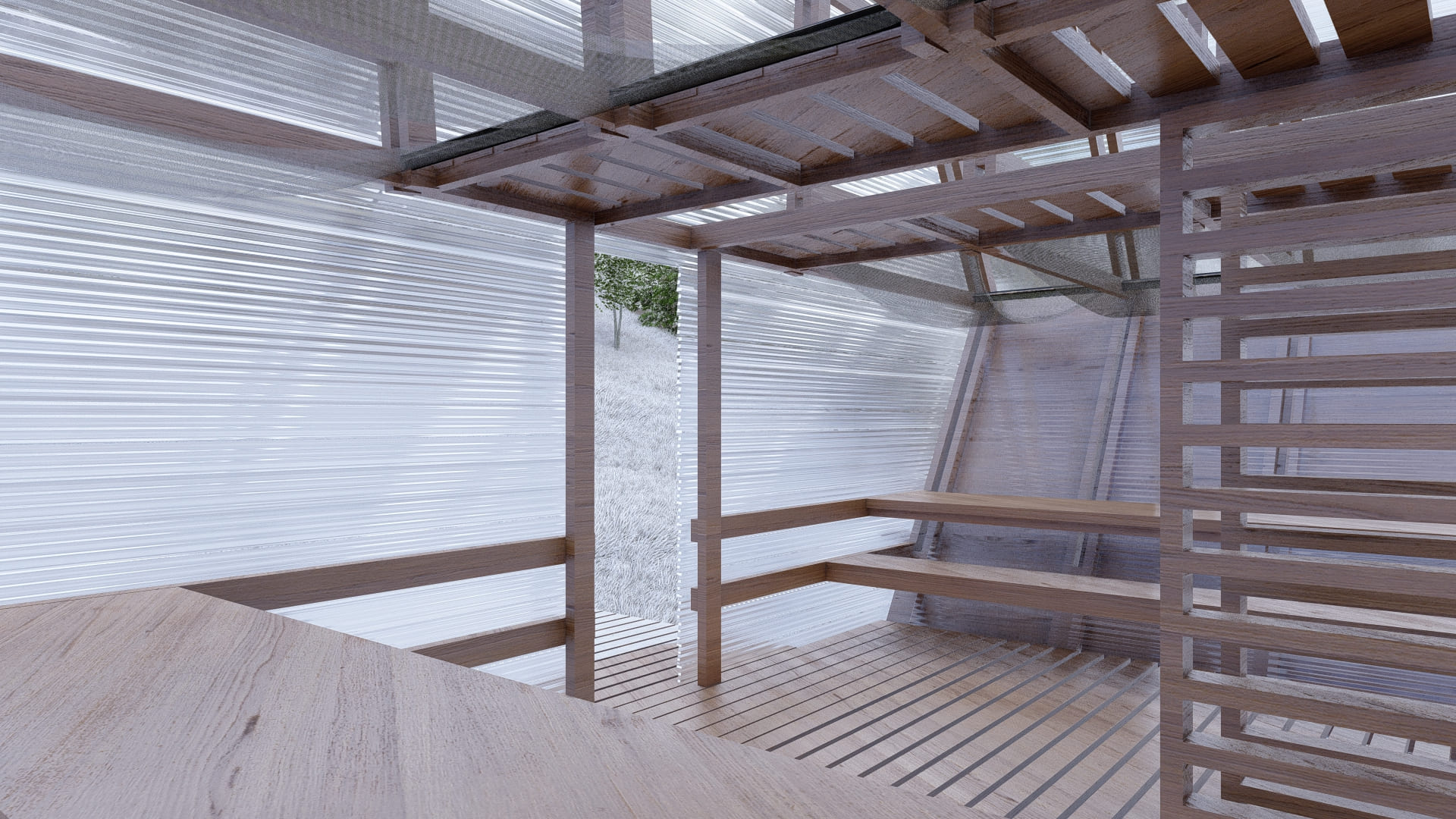 La arquitectura se desarrolla desde un sistema modular en madera 2x4”, con piezas repetitivas que permiten una construcción eficiente, prefabricada y liviana. Este sistema no solo facilita el montaje y desmontaje, sino que también optimiza recursos y reduce el impacto ambiental. El envolvente de policarbonato translúcido cumple un rol clave: protege del clima extremo, permite el paso de luz natural y genera una atmósfera cálida y ambigua al interior. La unión entre madera y policarbonato crea una expresión contemporánea, honesta y funcional, vinculada al lugar sin mimetizarse de forma literal.