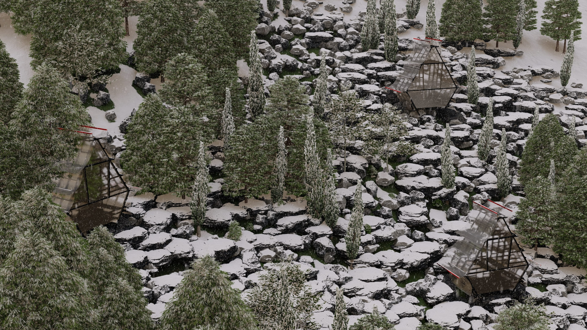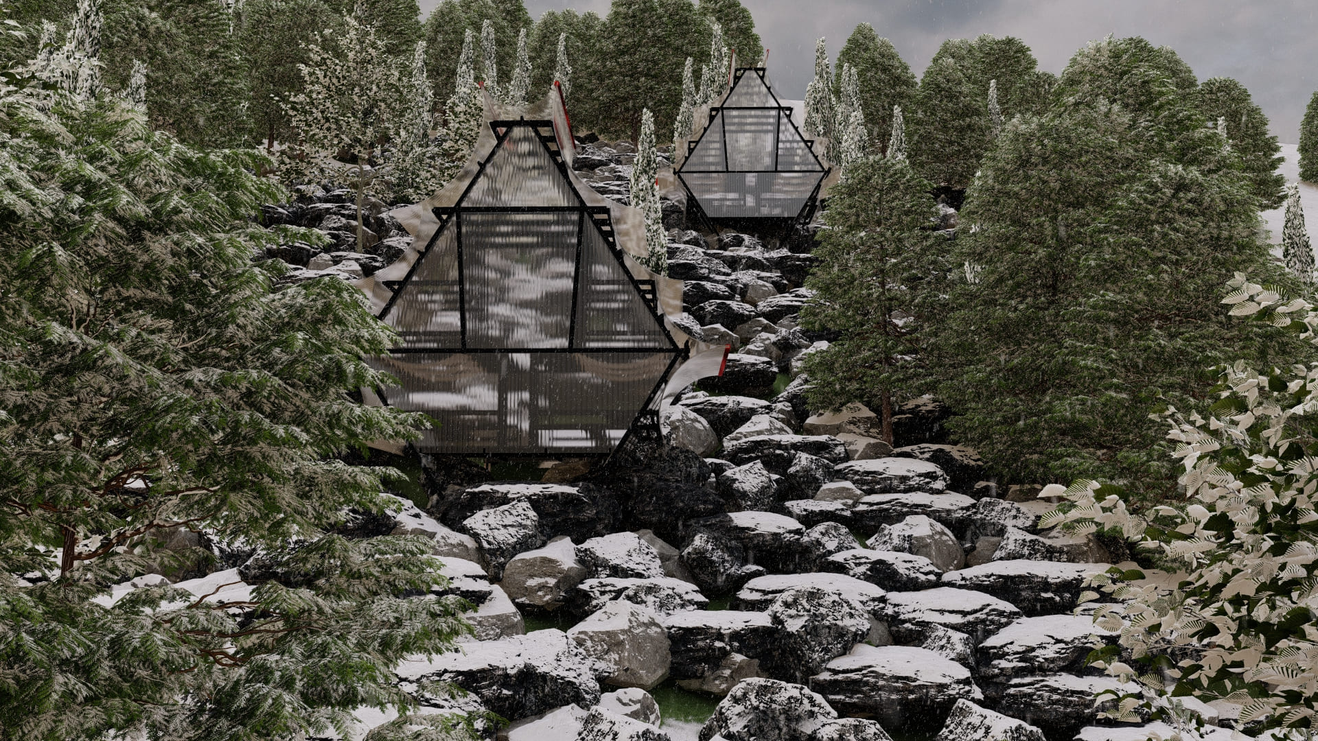 El refugio se emplaza en una ladera boscosa con vistas al lago, considerando la orientación solar, los vientos predominantes y la topografía existente. La estrategia de implantación busca minimizar la intervención del terreno, trabajando sobre fundaciones puntuales que evitan movimientos de tierra. Programáticamente, el espacio se resuelve de manera compacta: un único volumen de escala íntima que integra descanso, observación y protección climática.