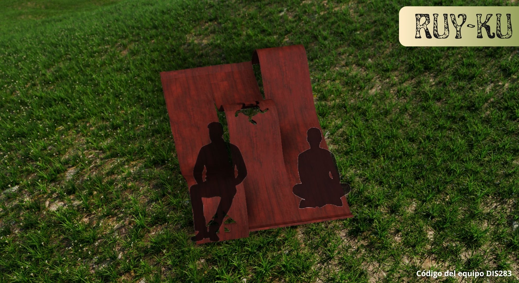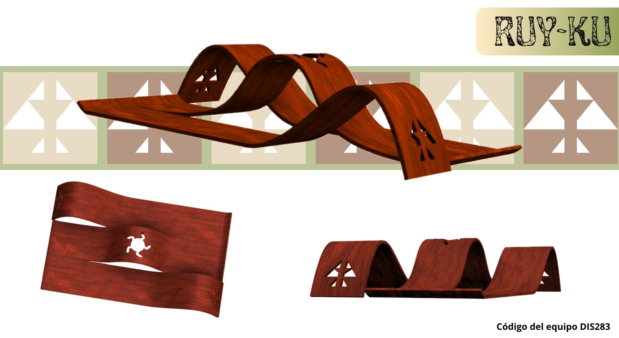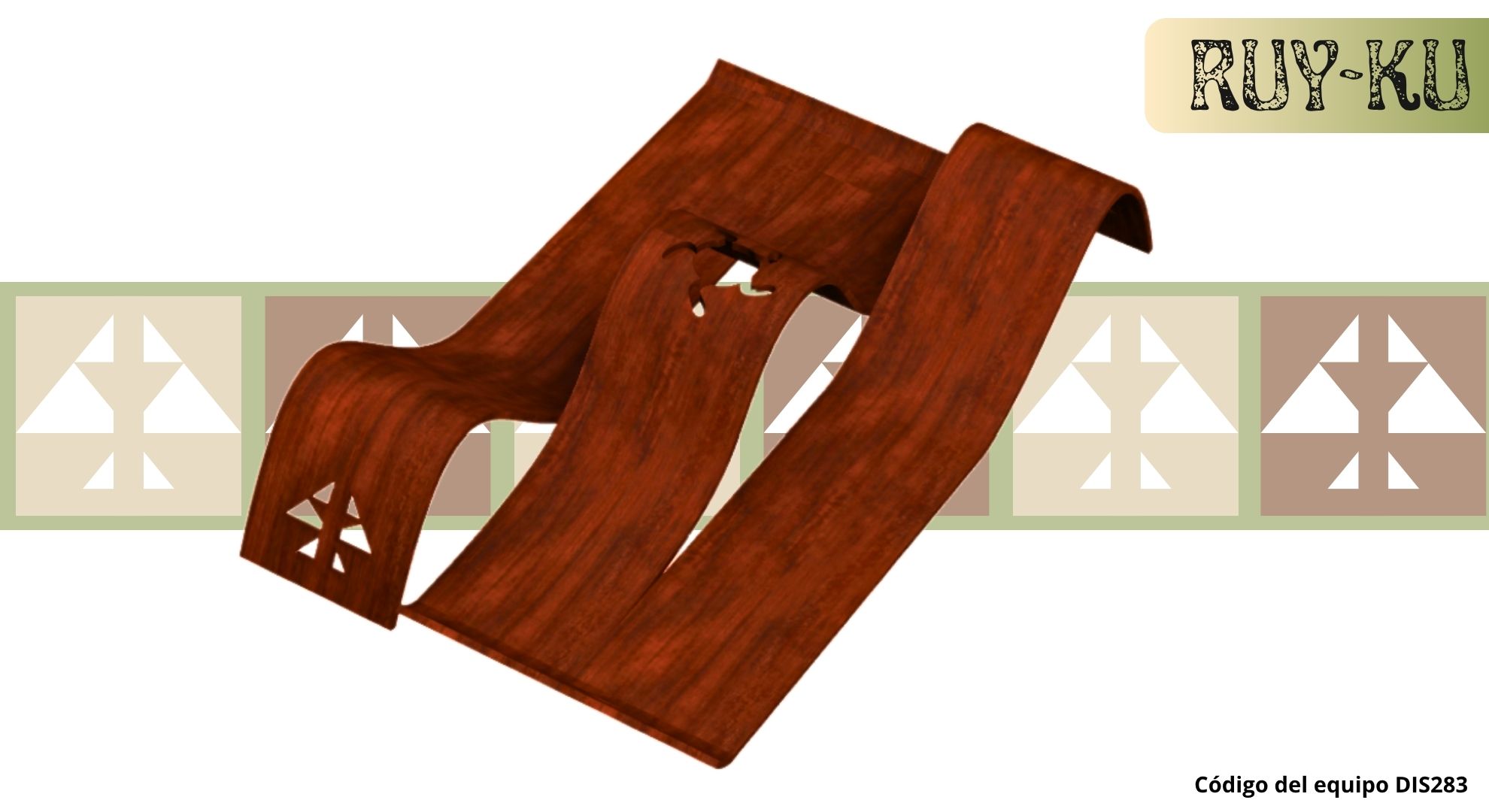 Ruy-Ku se plantea como un módulo de descanso multifuncional que nace desde la cosmovisión mapuche, integrando forma, función y simbolismo. Identifica la necesidad de reconectar al habitante urbano con la naturaleza, proponiendo un objeto para áreas verdes que alivie el estrés cotidiano y, al mismo tiempo, actúe como un catalizador de vida. Fabricado con una única tabla curvada de madera de raulí, sin uniones ni adhesivos, su técnica potencia las propiedades estructurales del material y propone una solución formal simple pero simbólicamente potente. Su ciclo concluye como tronco nodriza, guiando y nutriendo con su descomposición a una semilla de canelo plantada bajo el símbolo Antü (sol). Esta propuesta se diferencia en su carga conceptual, en su diseño con bajo impacto y en su capacidad de escalar como mobiliario urbano con sentido territorial y regenerativo.