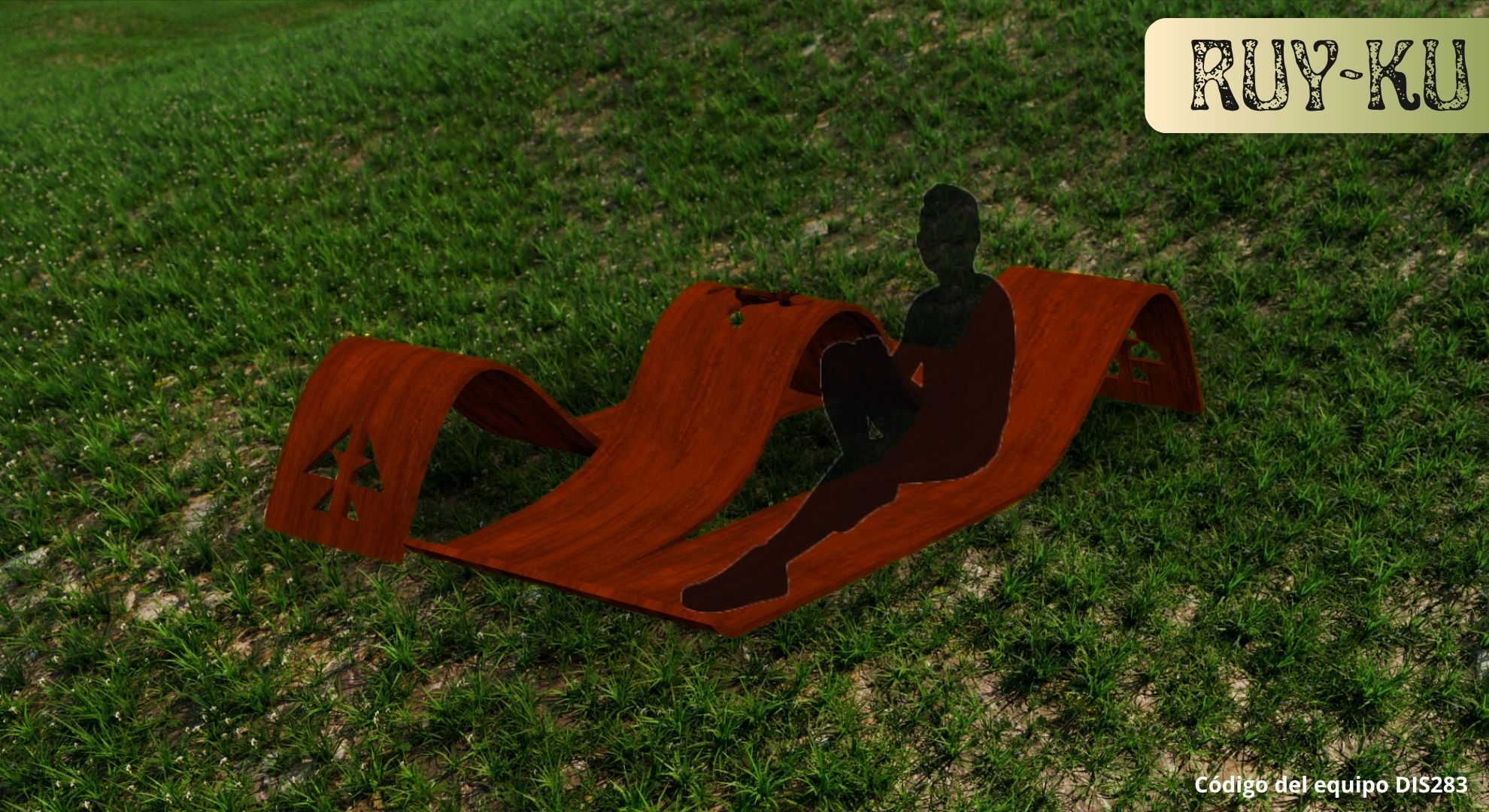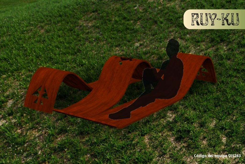 Este proyecto nace de la necesidad de desconectarse del entorno urbano, fortaleciendo el vínculo con la naturaleza y reduciendo el estrés de la vida metropolitana. A través de un mobiliario de exterior multifuncional, se busca fomentar la contemplación, el descanso y la conexión con el entorno natural. El diseño de Ruy-Ku incorpora curvas amplias y formas abiertas que invitan a la interacción desde una perspectiva inspirada en la cosmovisión mapuche. Su cercanía al suelo, el uso de madera nativa y el tratamiento con aceite de linaza cruda reflejan un enfoque respetuoso con la tierra y la vida cíclica. Fabricada a partir de una sola lámina de madera nativa curvada al calor y humedad de los vapores, sin uniones ni materiales adicionales, Ruy-Ku está pensada para tener un ciclo de vida completo: al final de su vida útil, se biodegrada y actúa como nutriente para una semilla de canelo plantada bajo su estructura, integrándose nuevamente al ecosistema.